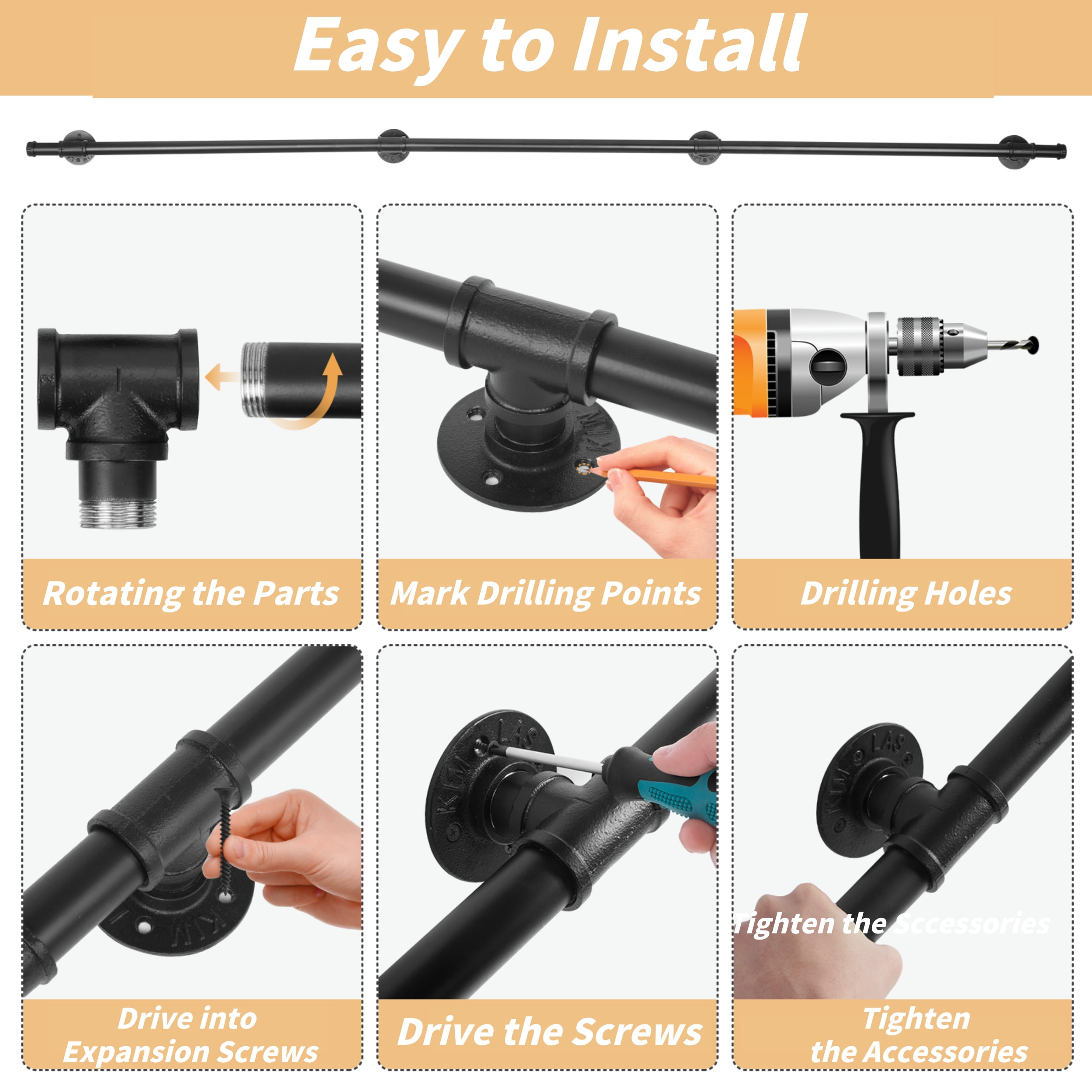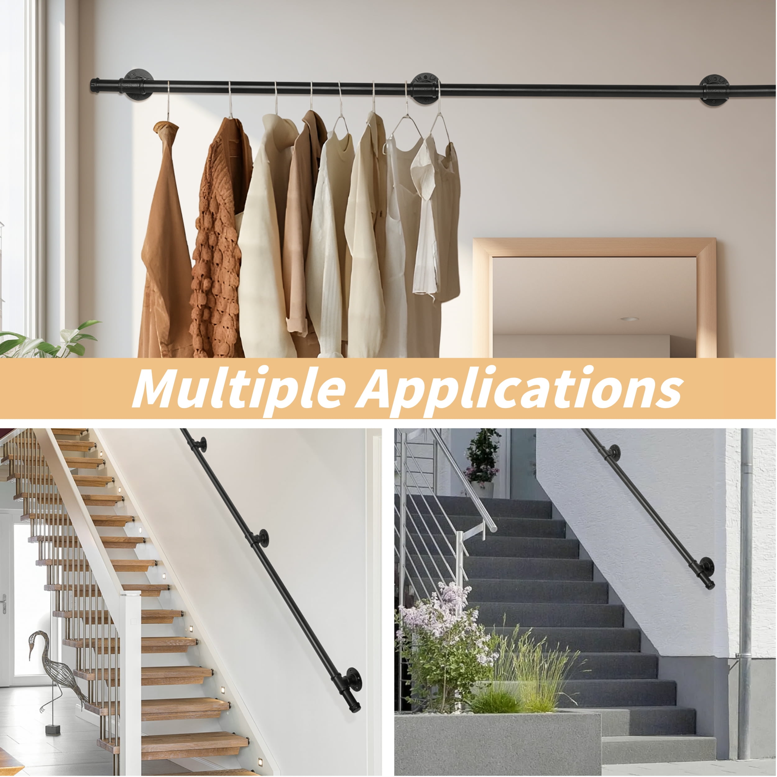 【 Premium Material 】 Carefully selected galvanized pipes with exquisite craftsmanship for greater stability and durability, which can provide long-term service for indoor and outdoor handrails. 【 Large Load Capacity 】 The heavy-duty pipe stair handrail can support 330lbs/ 150 kg loading each bracket. Therefore, it can be used as a grab bar for up and downstairs, especially for young people, the elderly, pregnant women, and people who have difficulty climbing stairs. 【 Industrial-Style Design 】 The staircase handrail is designed with a unique industrial style. It is made of strong-hardness carbon steel to keep away from deformation and scratch. Matte black finish (with 100μm outdoor-dedicated paints on the industrial pipe handrail surface) withstands the elements year after year and won’t rust, corrosion in all seasons and climates. 【 Multiple Applications 】 The staircase railings can be applied to a horizontal, inclined, or vertical balustrade. The various installation methods can be used as handrails, clothes rack, and corner mounting on villas, lofts, bars, apartments, office buildings, and dormitories. Indoor and outdoor are both available. 【 Easy Installation 】 No complex assembly process required, the package includes product manuals, making it easy to install at home.