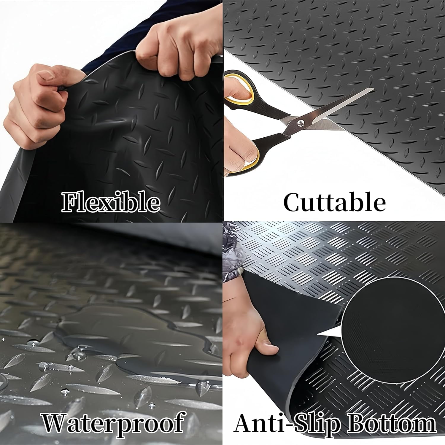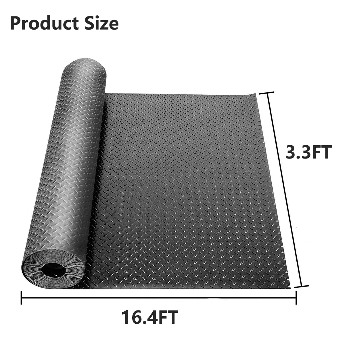 Description: Rubber Garage Floor Mat is made of high quality polymerized styrene butadiene rubber, non-slip, wear-resistant, waterproof, with good shock resistance and toughness. Rubber material protects your floor from grease, oil, charcoal, rust, and more. The garage flooring roll has good toughness, not easy to break. It is heavy duty, can stand long time car passing, people walking. Non-deformation and durable. Rolls fit together perfectly and lie flat without curling. Simply roll out the rubber mat and flat it to use, no adhesive required. Also can stick it to the ground with double-side tape to prevent mat moving. The rubber mat is ideal for a whole variety of uses in domestic and industrial applications including: protecting the trunk of cars or pick-ups; protecting the ground against scratches; serving as an anti-slip floor in wet areas like swimming pools and saunas; serving as a comfortable floor in farms for your poultry, etc. Specification: Condition: Brand New Type: Garage Flooring Cover Material: 100% rubber Special Feature: Heavy Duty,Non-slip,Waterproof Color: Black Overall Size: 3.3×16.4ft Area:54 sqft Pattern: Diamond Thickness: 1/8” Performance: Shock Absorption, Noise Reduction, Anti-skid, Insulation, Anti-aging Mat weight: 32lbs Package Includes: 1 x Roll Garage Mat