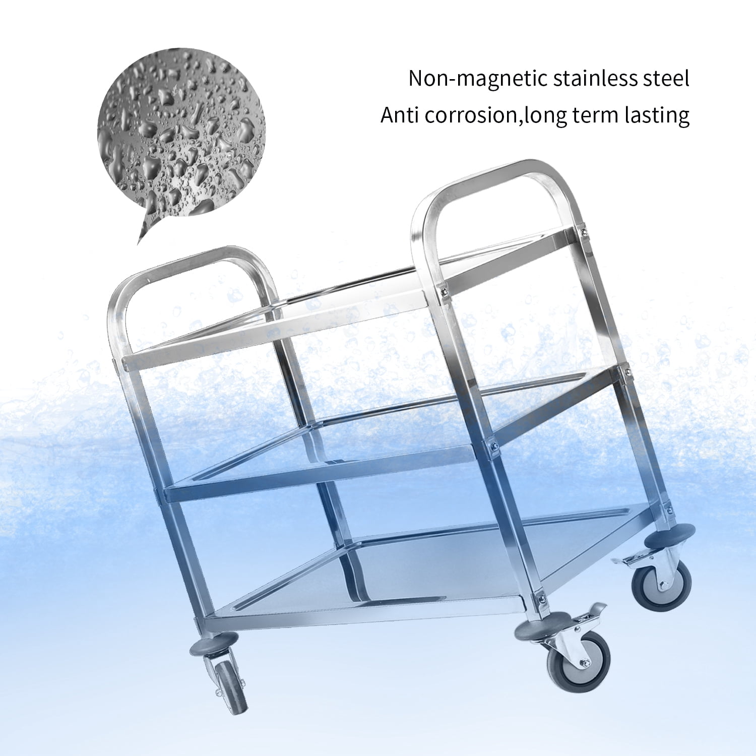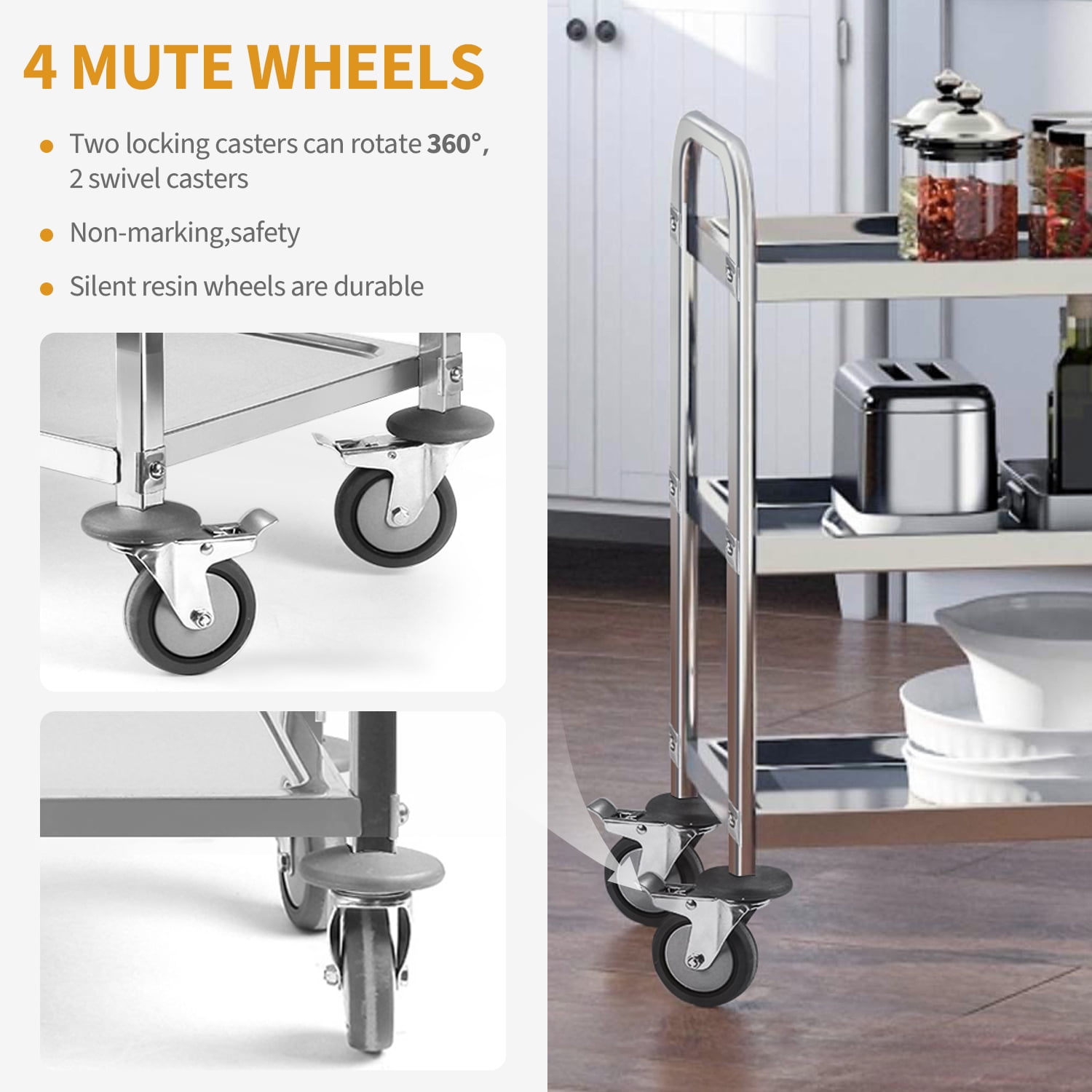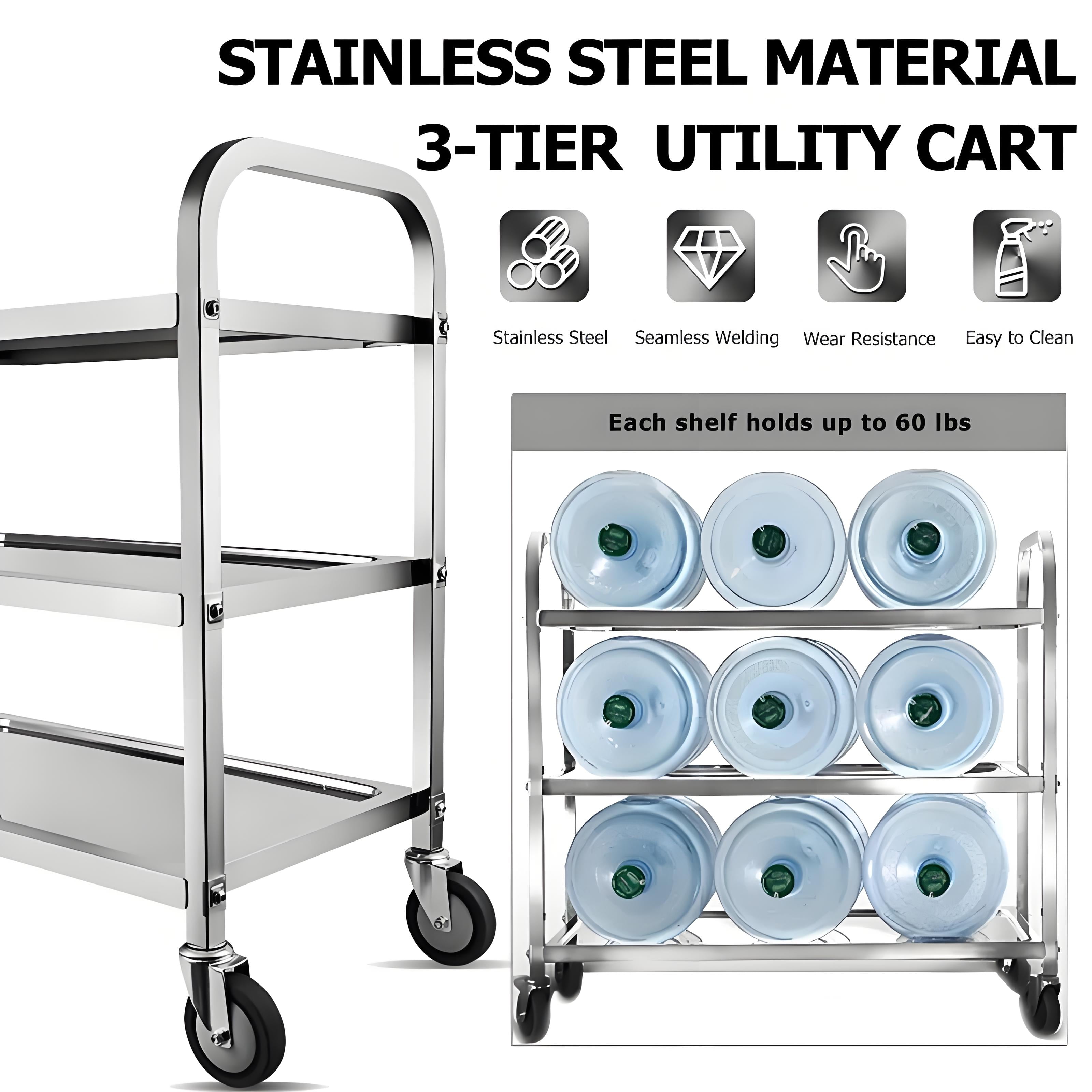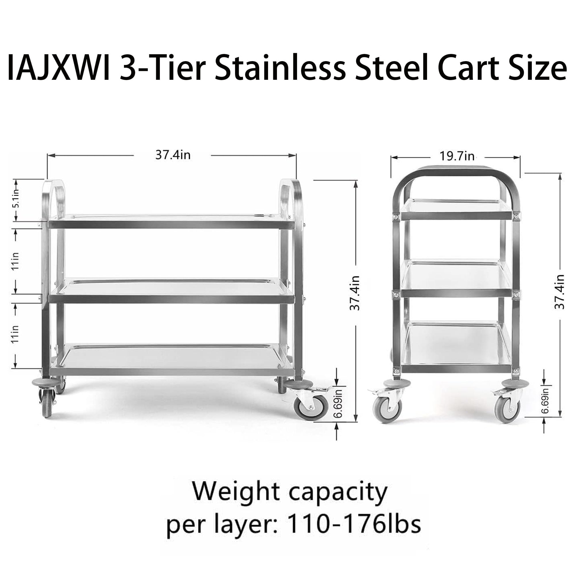 Heavy duty stainless steel utility cart with 4 mute wheel features great stainless steel materials; 0.8mm thickness,overall size is 37.4 x 19.7 x 37.4 inch; The dining cart can load up to 330lbs. Compact stainless steel kitchen cart with wheels have 3 tier storage space, 3-shelf kitchen cart trolley serving catering storage cart provide perfect additional space solution for those with minimal kitchen counter space. A circumferential edge protects the cargo against slipping. 2 swivel casters that can do the flexible move, and 2 have integrated brakes that can help you stop the dining cart safely; And durable rubber mute wheels can reduce the noise effectively; Ideal for the service industry. The stainless steel serving cart is perfect for hotel, canteen kitchens, hospitals, restaurant; Using our utility cart can effectively improve your work efficiency and service quality; Our stainless steel cart is easy to clean and won’t rust. Easy to assemble, don’t require complicated steps, just simple parts and connections between parts; You can refer to the pictures among this listing to install the rolling cart within 15minutes.
