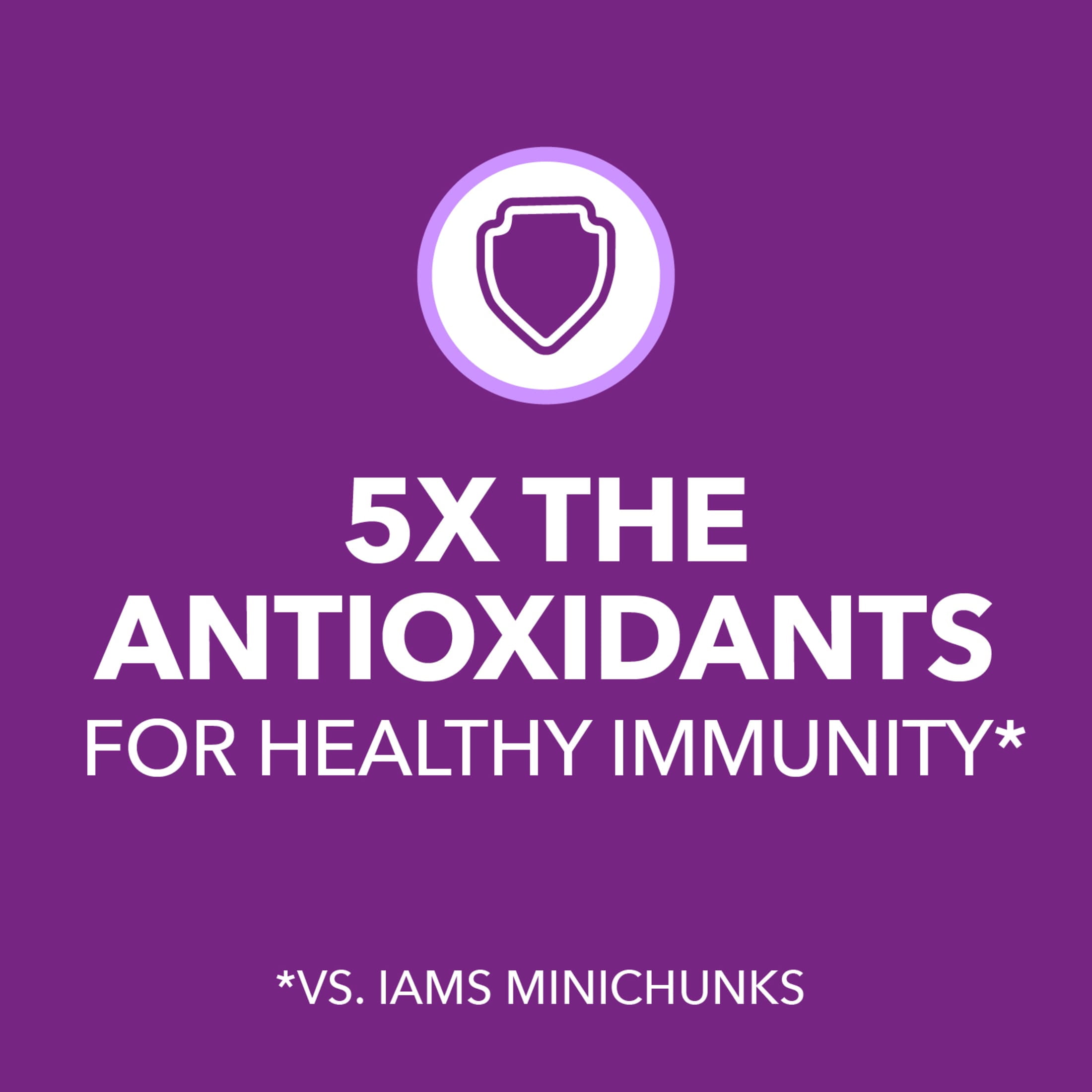Helps support immune defense with antioxidants Vitamin C and E to fight free radicals. 5x the antioxidants for healthy immunity vs. IAMS Minichunks. Made with real chicken as the #1 ingredient and our exclusive superfoods medley. Support your dog’s vitality to help them look, feel, and play their best. IAMS crunchy kibble scrubs your dog’s teeth with every bite to help reduce plaque build-up. Veterinarians recommend IAMS.