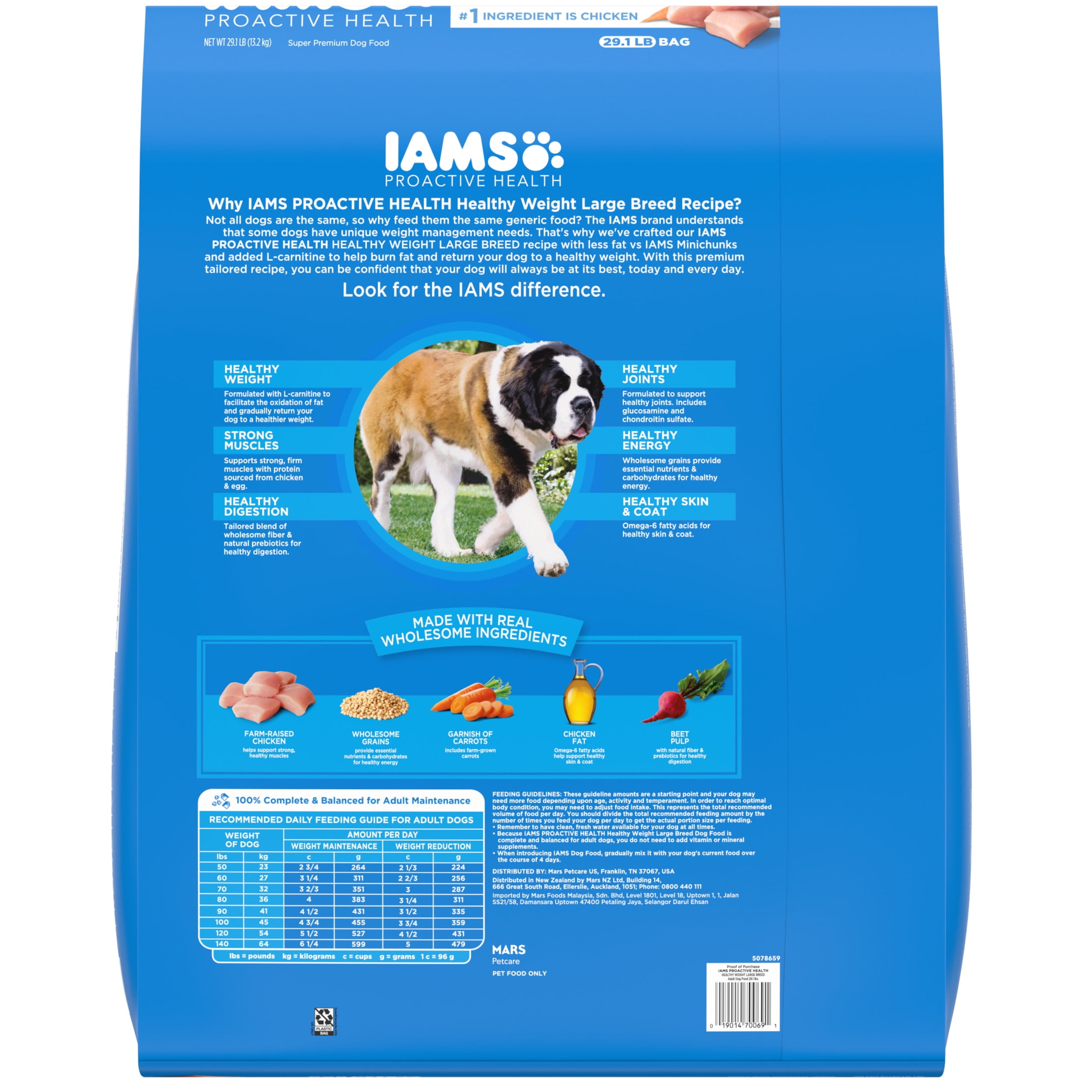 Healthy Weight: Contains premium nutrition with L-carnitine & less fat to support healthy weight in adult dogs Healthy Energy: Wholesome grains provide essential nutrients & carbohydrates for healthy energy Supports Strong Muscles: Supports strong, firm muscles with protein sourced from chicken & egg Less Fat and Healthy Metabolism: Supports Healthy Metabolism with L-Carnitine and contains 17% less fat than Iams Minichunks 29.1 lb. Bag: Contains one (1) 29.1 lb. bag Iams Proactive Health Healthy Weight Control Large Breed Adult Dry Dog Food with Real Chicken