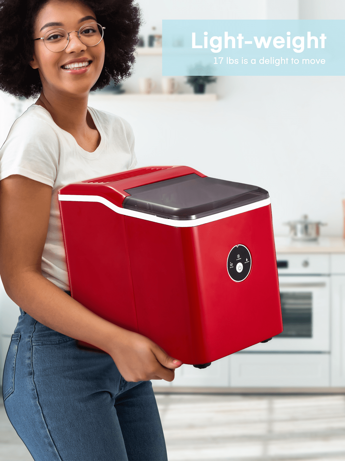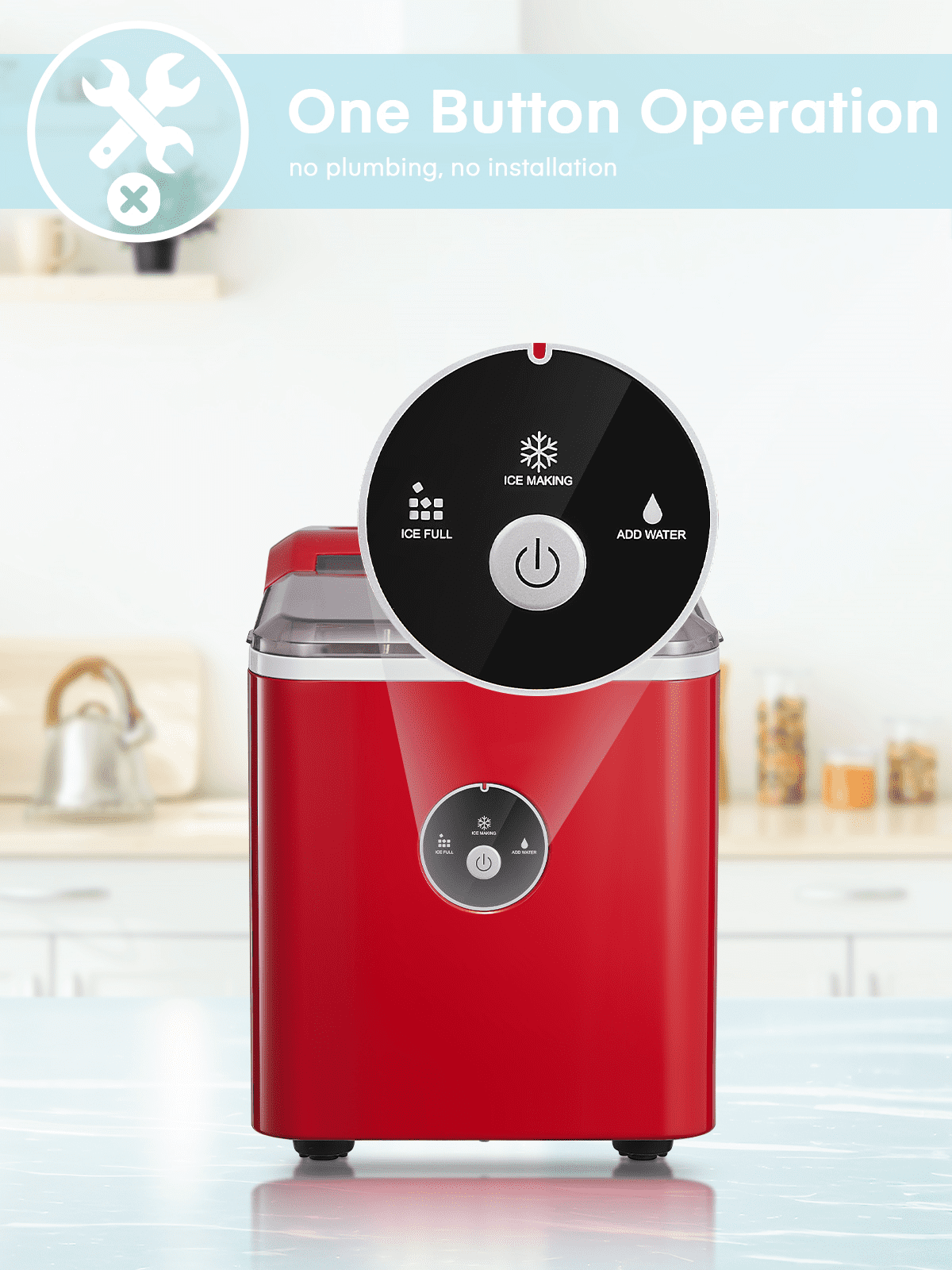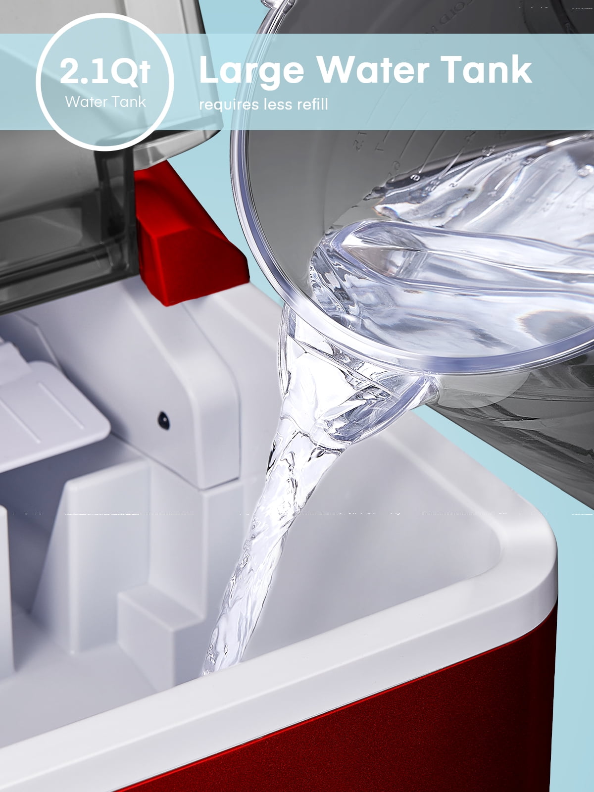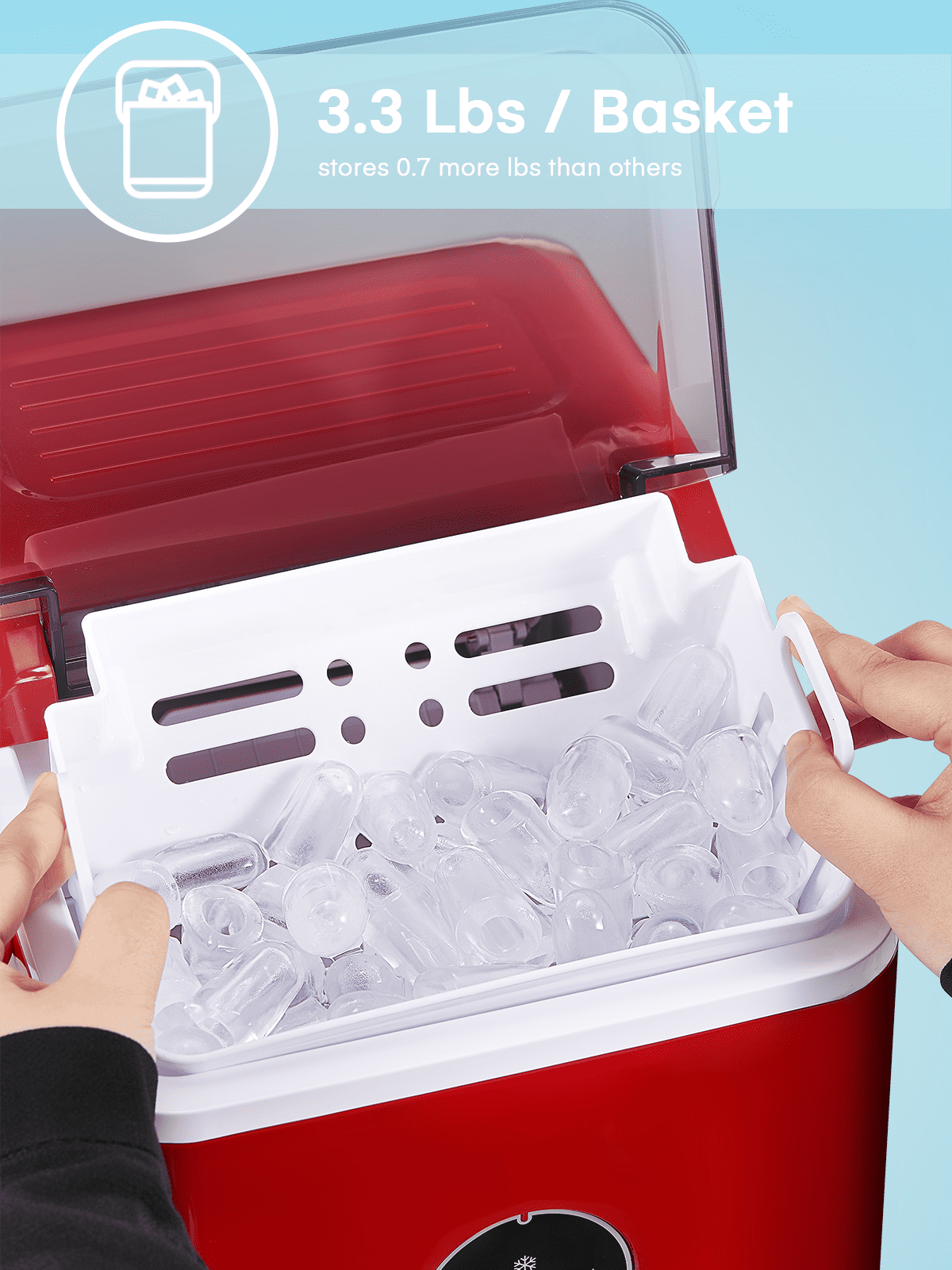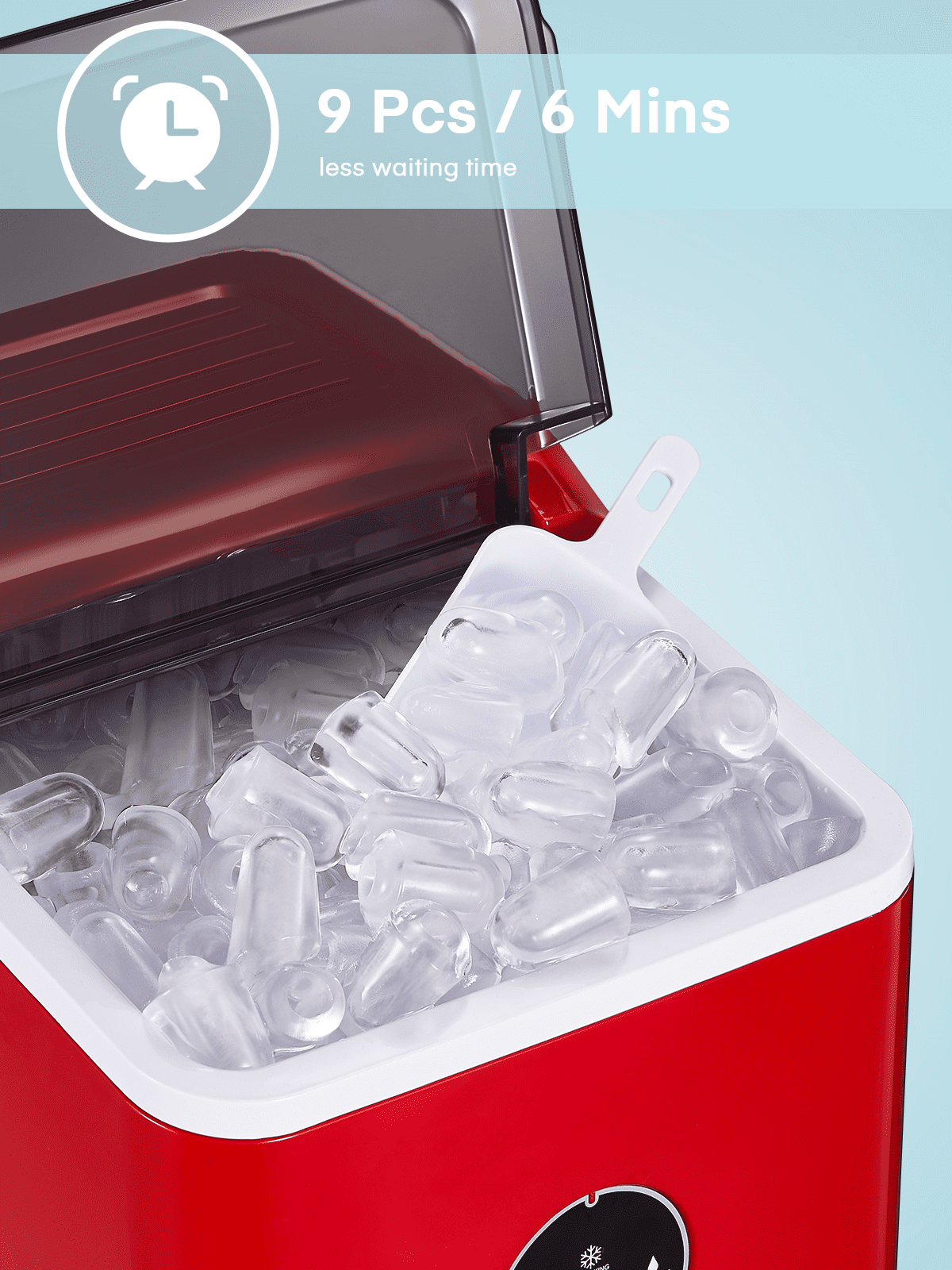 ‌1. Faster! This speedy bullet ice maker produces 9 chewable, delicious, crystal bullet-shaped ice cubes within 5 mere minutes per cycle, 30 lbs ice cubes in 24 hrs, covers a family’s ice needs for 2 days. with its 2-liter/68 oz. water tank and stores up to 1.6 lbs of ice at a time. No need to rush to the nearest store to buy ice bags, for which you always have to spare space in your refrigeration appliances. Saves 30 bucks per week. 2. Powerful but Quiet, Small but Capable! This countertop ice maker machine is equipped with the most powerful and quiet compressor and DC fan, providing a faster cooling effect within 5 minutes, low consumption, and low noise level under 40dB. Measures just 12*8.5*11.8 inches to fit on any countertop and easy to store when not in use. It takes up less space at home or in the office, barbeques, outdoor parties, RV, boat, or basement bars. Noisy and bulky is not our style. 3. Simple! With a simple control panel, just simply add water, plug it in, press the power button, and let it be, no more complex settings required. Indicator lights for “ICE FULL” or “ADD WATER” will alert you in time. Big clear view window for easy observation. No installation and plumbing required. Easy to clean with a simple wipe. 4. Advanced! Innovative infrared sensor technology applied for this ice machine countertop, saving labor and time on monitoring. Advanced water reuse system allows the water from the melted ice to be recycled and turned into ice again, saving water. A thick foam layer effectively insulates heat, saving energy. 5. Promise! This ETL-approved ice maker comes brand new and is under a 2-year policy. Any problem, talk to us for best time-, energy- and money-saving solutions. Interior is made of white food-grade material, no odor, just for your health and safety. Attached with an ice scoop and a removable ice basket. Super convenient to move ice cubes.