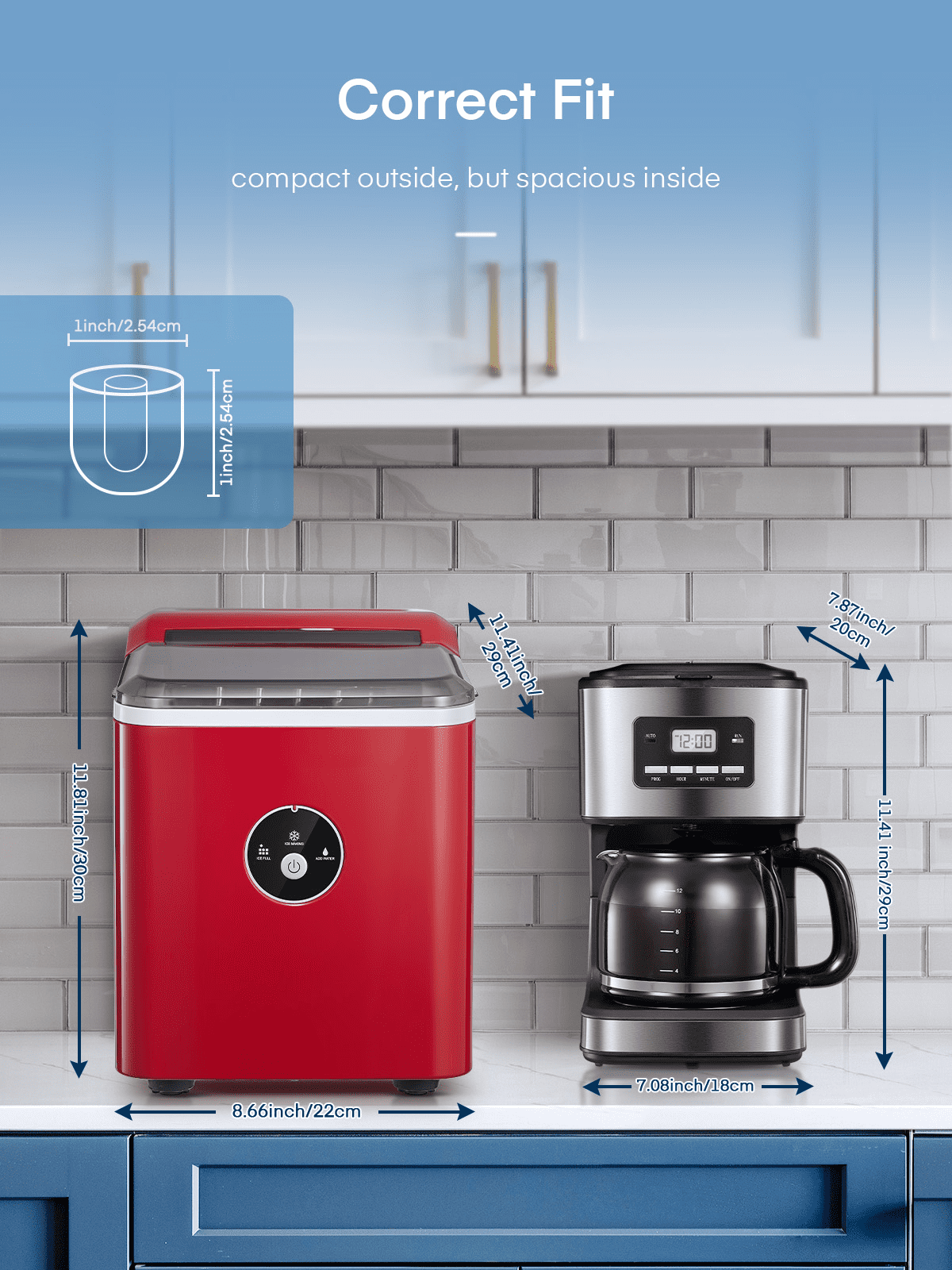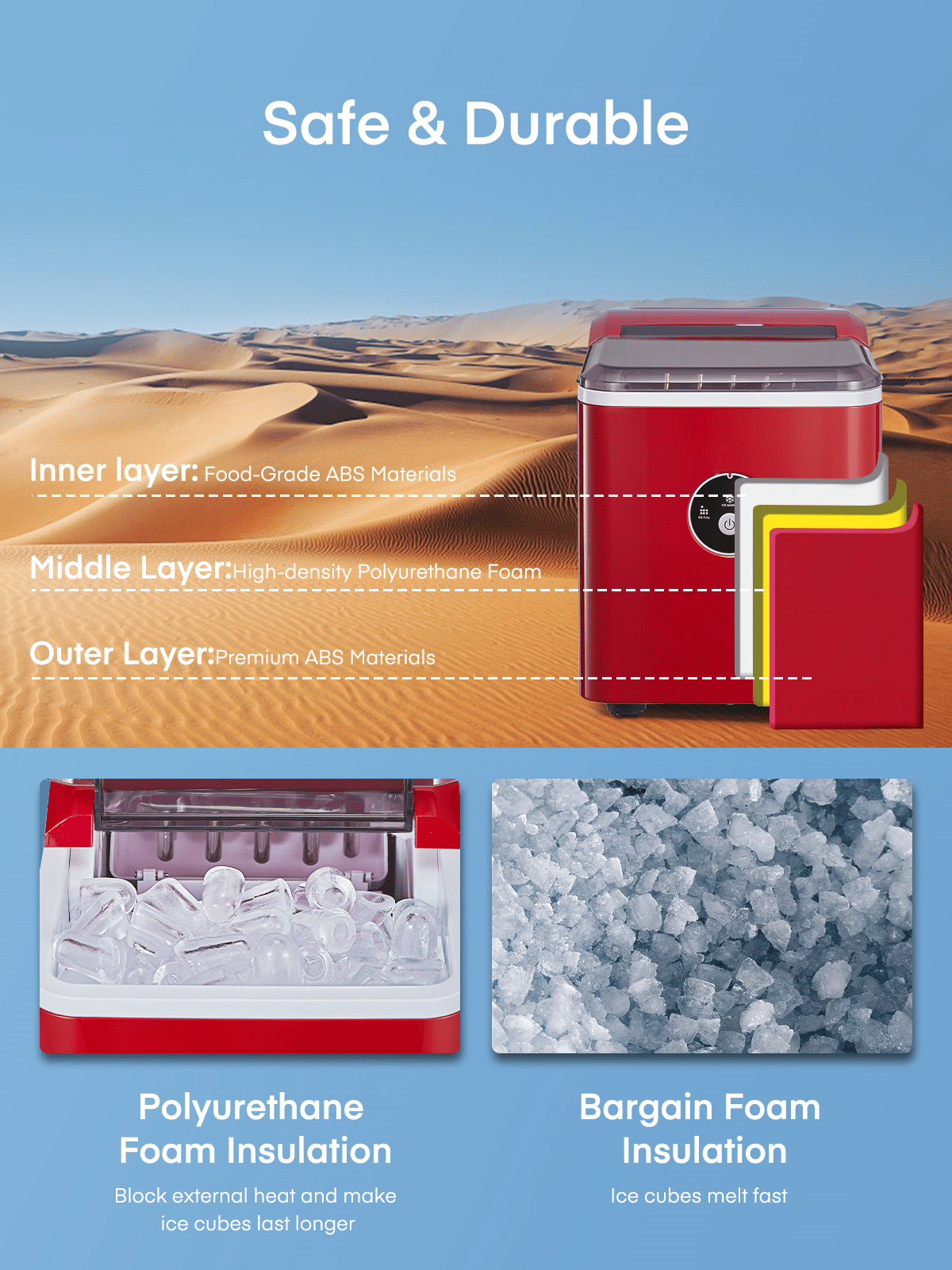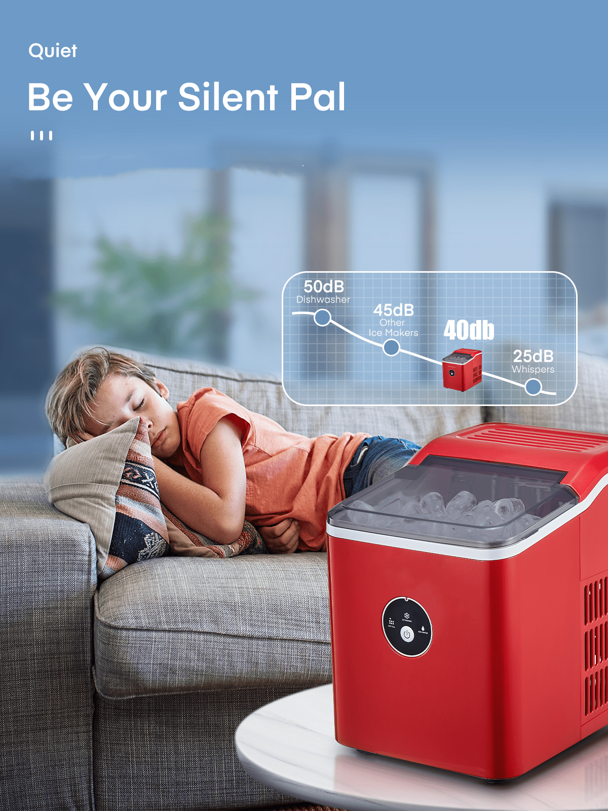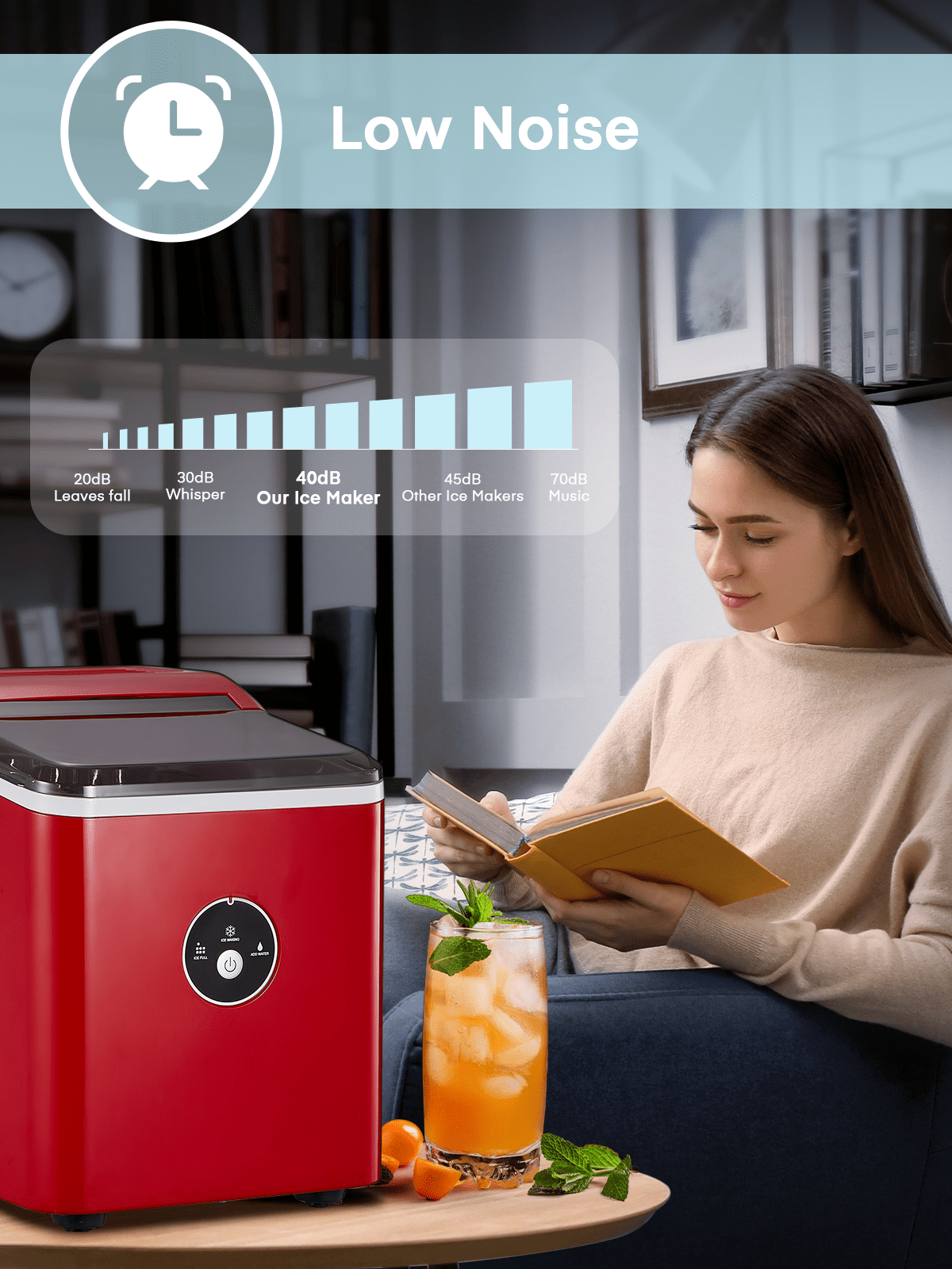 ‌1. Faster! This speedy bullet ice maker produces 9 chewable, delicious, crystal bullet-shaped ice cubes within 5 mere minutes per cycle, 30 lbs ice cubes in 24 hrs, covers a family’s ice needs for 2 days. with its 2-liter/68 oz. water tank and stores up to 1.6 lbs of ice at a time. No need to rush to the nearest store to buy ice bags, for which you always have to spare space in your refrigeration appliances. Saves 30 bucks per week. 2. Powerful but Quiet, Small but Capable! This countertop ice maker machine is equipped with the most powerful and quiet compressor and DC fan, providing a faster cooling effect within 5 minutes, low consumption, and low noise level under 40dB. Measures just 12*8.5*11.8 inches to fit on any countertop and easy to store when not in use. It takes up less space at home or in the office, barbeques, outdoor parties, RV, boat, or basement bars. Noisy and bulky is not our style. 3. Simple! With a simple control panel, just simply add water, plug it in, press the power button, and let it be, no more complex settings required. Indicator lights for “ICE FULL” or “ADD WATER” will alert you in time. Big clear view window for easy observation. No installation and plumbing required. Easy to clean with a simple wipe. 4. Advanced! Innovative infrared sensor technology applied for this ice machine countertop, saving labor and time on monitoring. Advanced water reuse system allows the water from the melted ice to be recycled and turned into ice again, saving water. A thick foam layer effectively insulates heat, saving energy. 5. Promise! This ETL-approved ice maker comes brand new and is under a 2-year policy. Any problem, talk to us for best time-, energy- and money-saving solutions. Interior is made of white food-grade material, no odor, just for your health and safety. Attached with an ice scoop and a removable ice basket. Super convenient to move ice cubes.