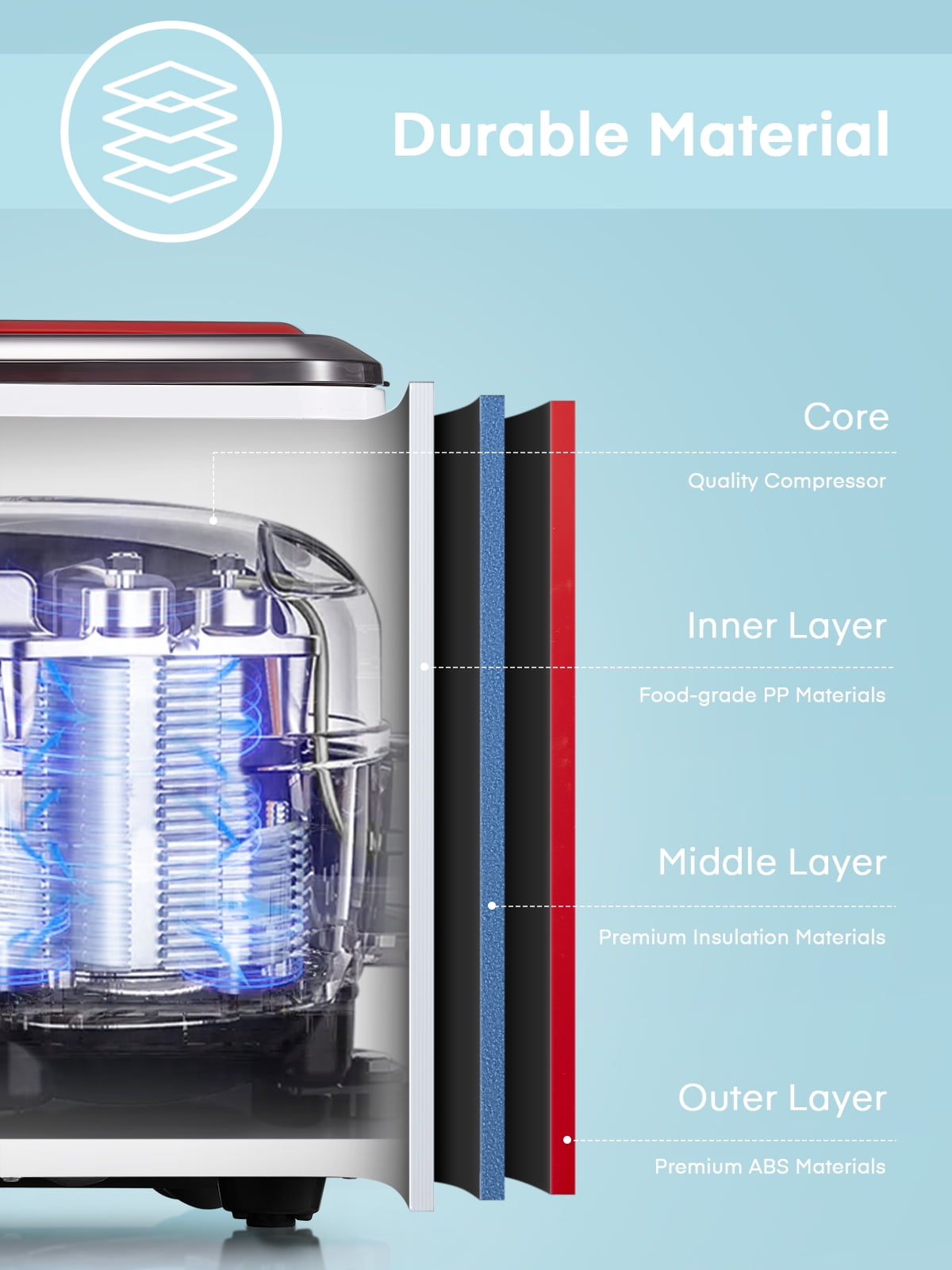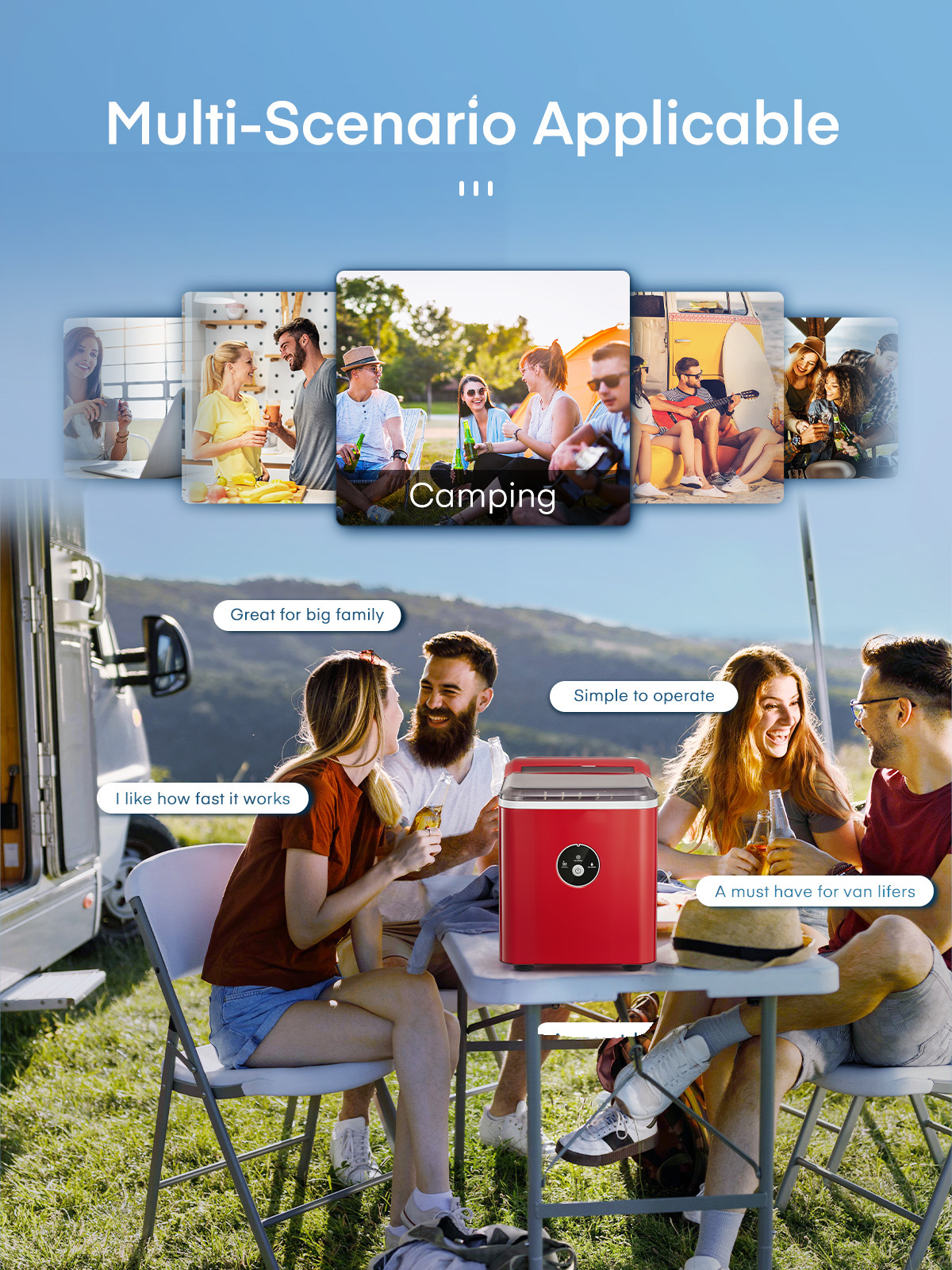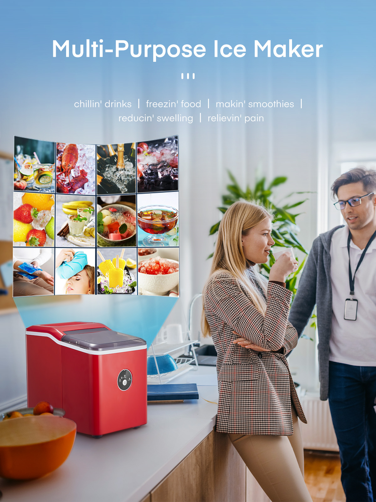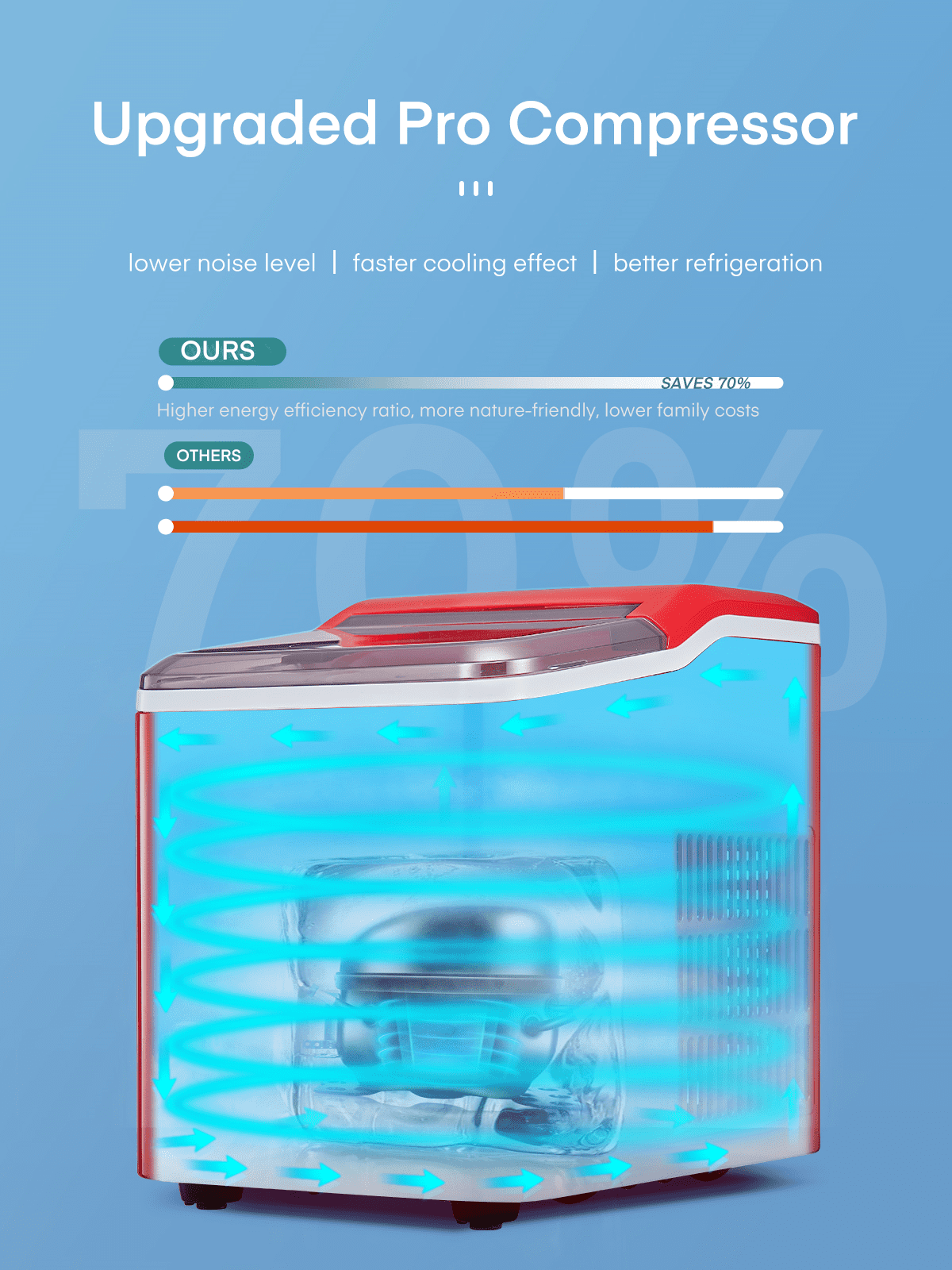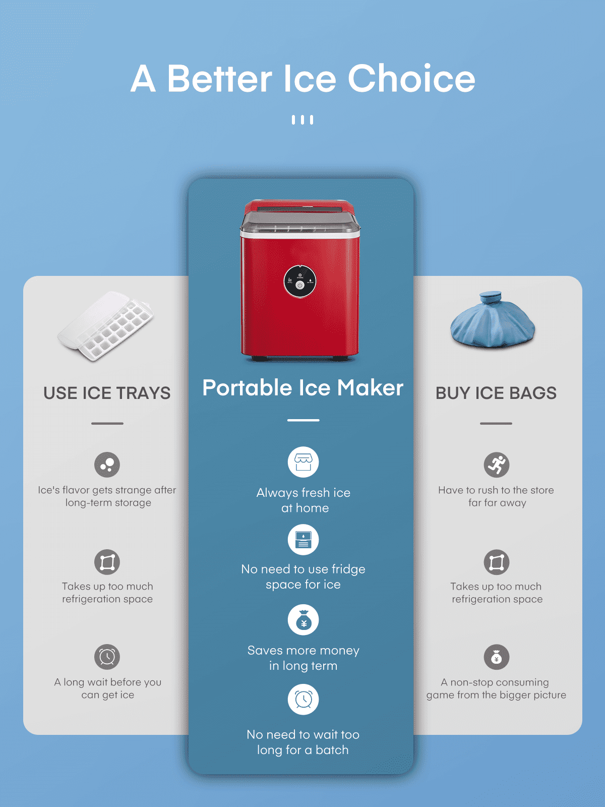 ‌1. Faster! This speedy bullet ice maker produces 9 chewable, delicious, crystal bullet-shaped ice cubes within 5 mere minutes per cycle, 30 lbs ice cubes in 24 hrs, covers a family’s ice needs for 2 days. with its 2-liter/68 oz. water tank and stores up to 1.6 lbs of ice at a time. No need to rush to the nearest store to buy ice bags, for which you always have to spare space in your refrigeration appliances. Saves 30 bucks per week. 2. Powerful but Quiet, Small but Capable! This countertop ice maker machine is equipped with the most powerful and quiet compressor and DC fan, providing a faster cooling effect within 5 minutes, low consumption, and low noise level under 40dB. Measures just 12*8.5*11.8 inches to fit on any countertop and easy to store when not in use. It takes up less space at home or in the office, barbeques, outdoor parties, RV, boat, or basement bars. Noisy and bulky is not our style. 3. Simple! With a simple control panel, just simply add water, plug it in, press the power button, and let it be, no more complex settings required. Indicator lights for “ICE FULL” or “ADD WATER” will alert you in time. Big clear view window for easy observation. No installation and plumbing required. Easy to clean with a simple wipe. 4. Advanced! Innovative infrared sensor technology applied for this ice machine countertop, saving labor and time on monitoring. Advanced water reuse system allows the water from the melted ice to be recycled and turned into ice again, saving water. A thick foam layer effectively insulates heat, saving energy. 5. Promise! This ETL-approved ice maker comes brand new and is under a 2-year policy. Any problem, talk to us for best time-, energy- and money-saving solutions. Interior is made of white food-grade material, no odor, just for your health and safety. Attached with an ice scoop and a removable ice basket. Super convenient to move ice cubes.