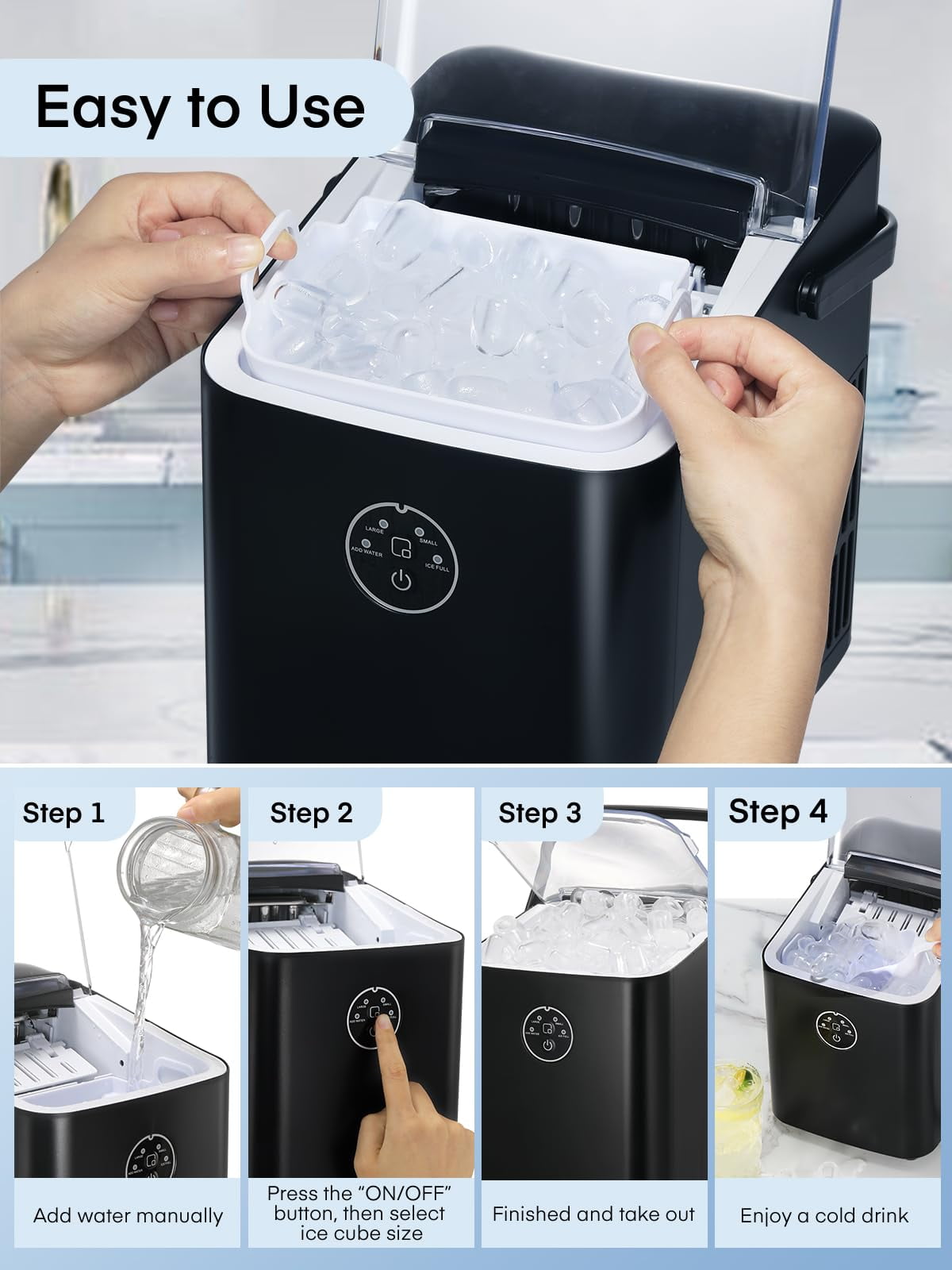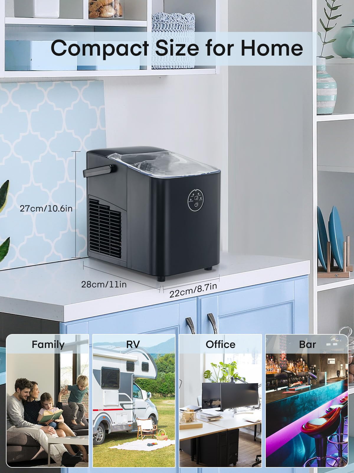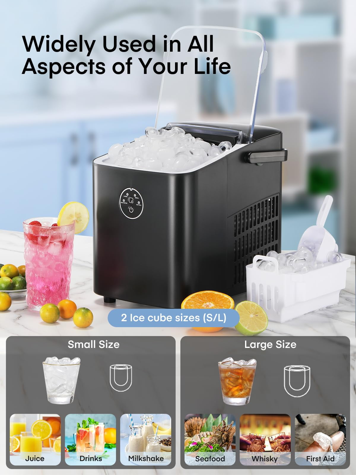 Fast Ice Making: This Bullet Ice Maker with high quality compressor takes only 5 minutes to make a batch of delicious and chewable bullet ice, it can produce about 30 pounds of ice in 24 hours, giving you a fast and steady supply of fresh ice. Easy to Use: This ice maker has a self-explanatory control panel, clear indicator lights and infrared sensor technology. There is an ‘Ice Full’ and ‘Add Water’ button and the Ice Maker will prompt you immediately when the ice is full or short of water. 2 Sizes of Bullet Ice: The Ice Maker can produce 2 sizes of clear and fresh bullet ice. Small size ice cubes can be used to make smoothies and iced drinks, while large size ice cubes can be used to freeze food and provide first aid to meet your various cooling needs. Self-cleaning: The Ice Maker has an advanced self-cleaning function that allows you to keep your hands free, saving you time and effort in keeping the Ice Maker clean. Press and hold the On/Off button for 3 seconds after adding water to activate the self-cleaning mode and ensure clean ice is served. Compact & Portable: Our countertop ice maker measures 11.1″D x 8.07″W x 10.59″H, with carrying handle, easy to transport and use in various occasions, suitable for home, office, party and bar, enjoy delicious food anywhere. And the portable and compact design allows you to carry and store with ease.