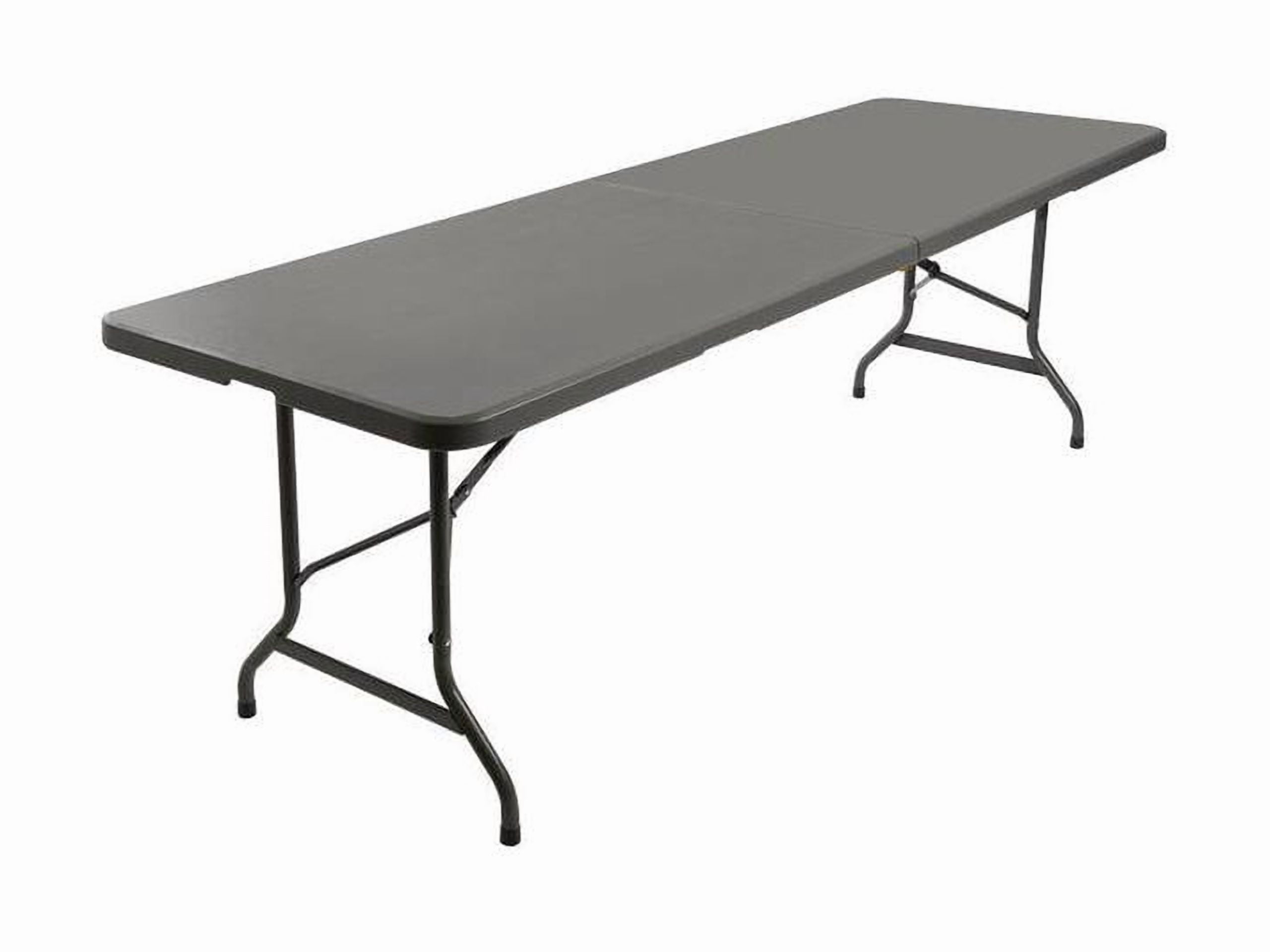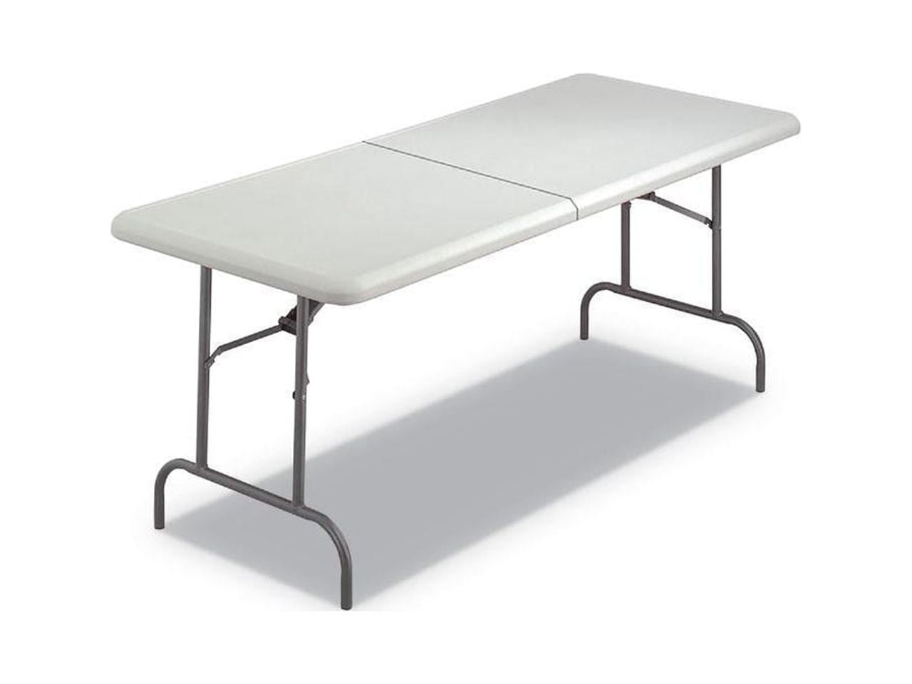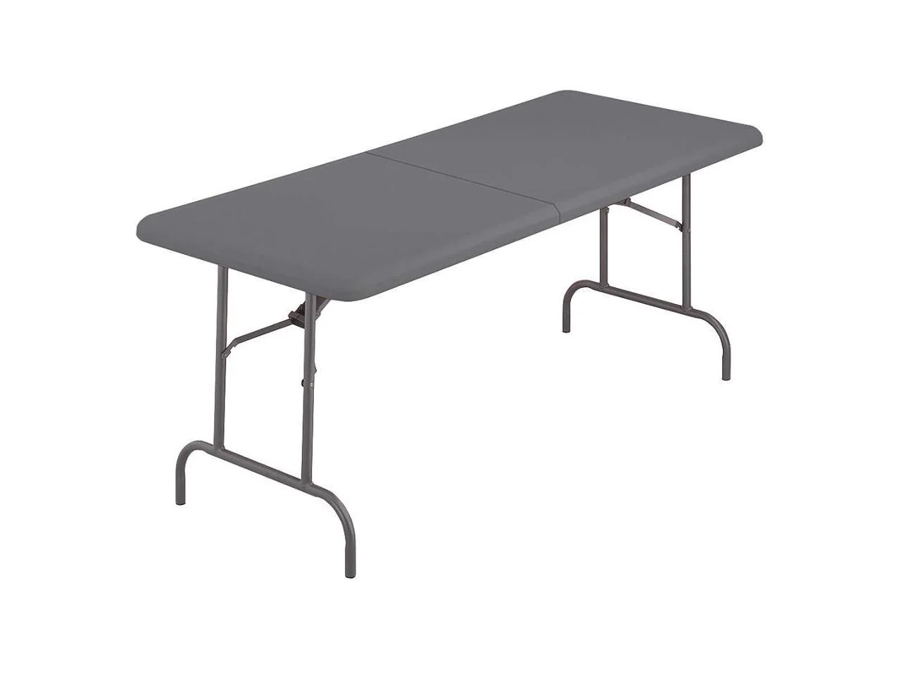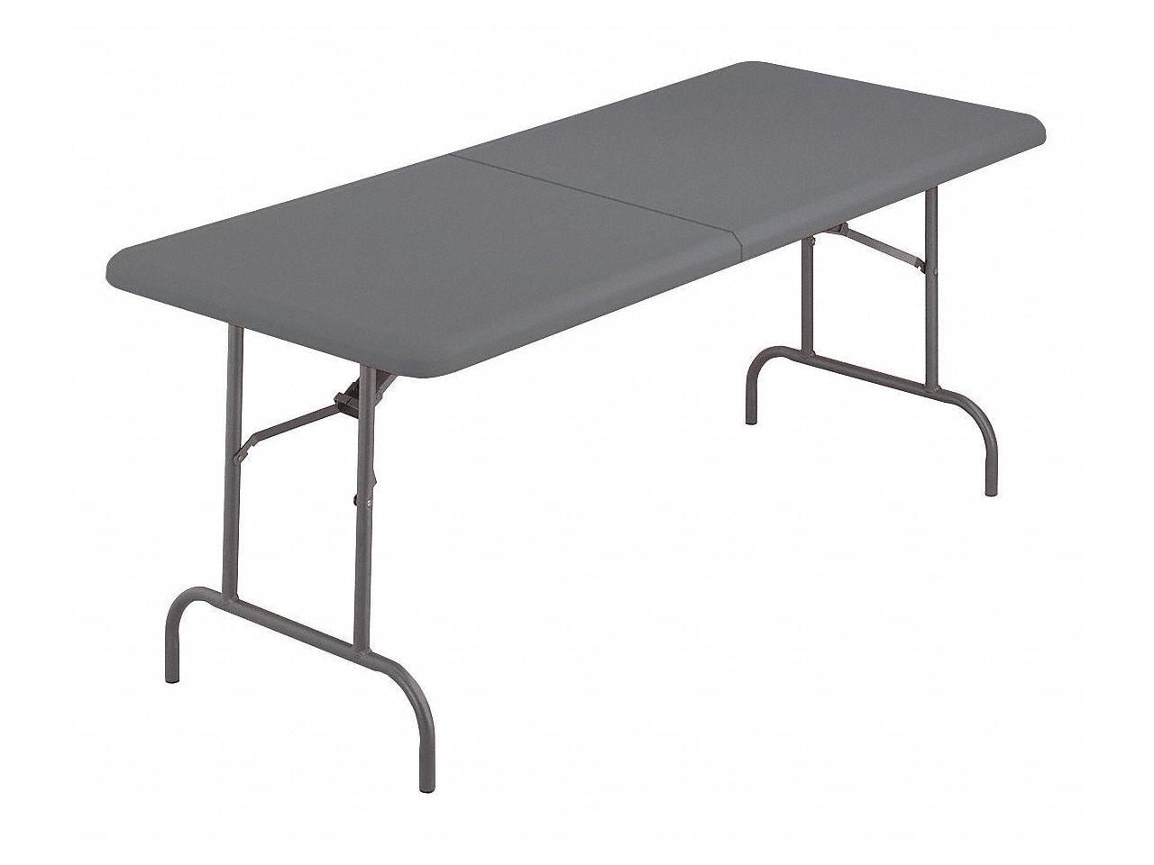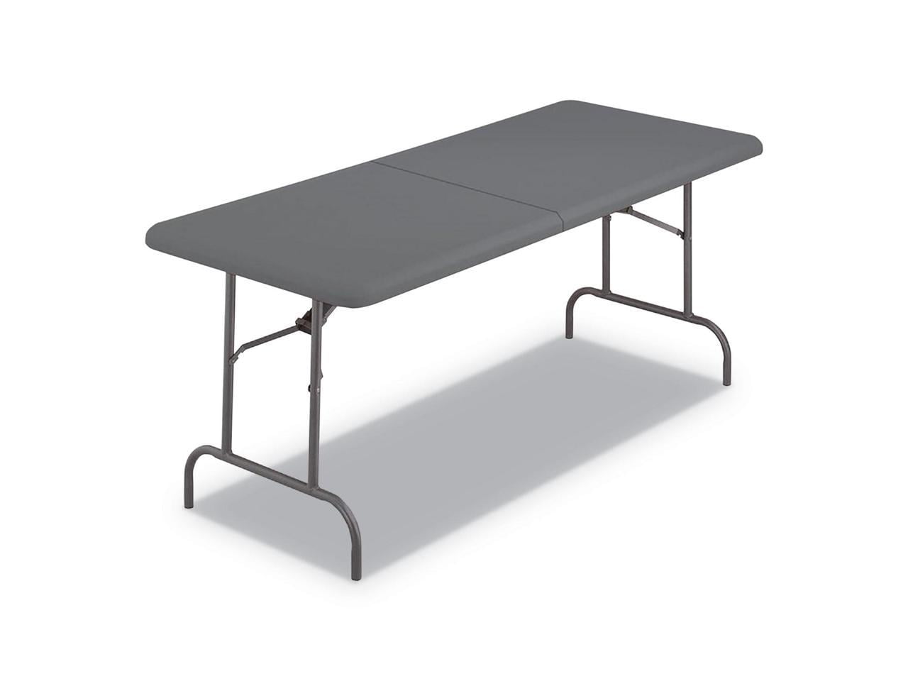 IndestrucTable Classic 1200 lbs. Capacity 30 in. x 72 in. x 29 in. Bi-Folding Table, charcoal gray color. Table folds in half and also feature a convenient built-in handle for easy transport. Dent- and scratch-resistant, easy-to-clean top is fabricated of blow-molded high-density polyethylene. Powder-coated, round metal-tube legs feature fold-out braces for extra strength and stability. Tables nest together when stacked. Ideal for indoor and outdoor use