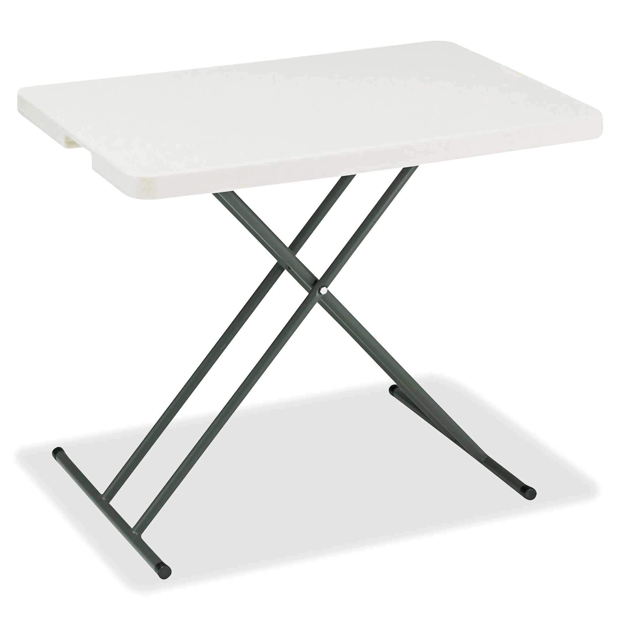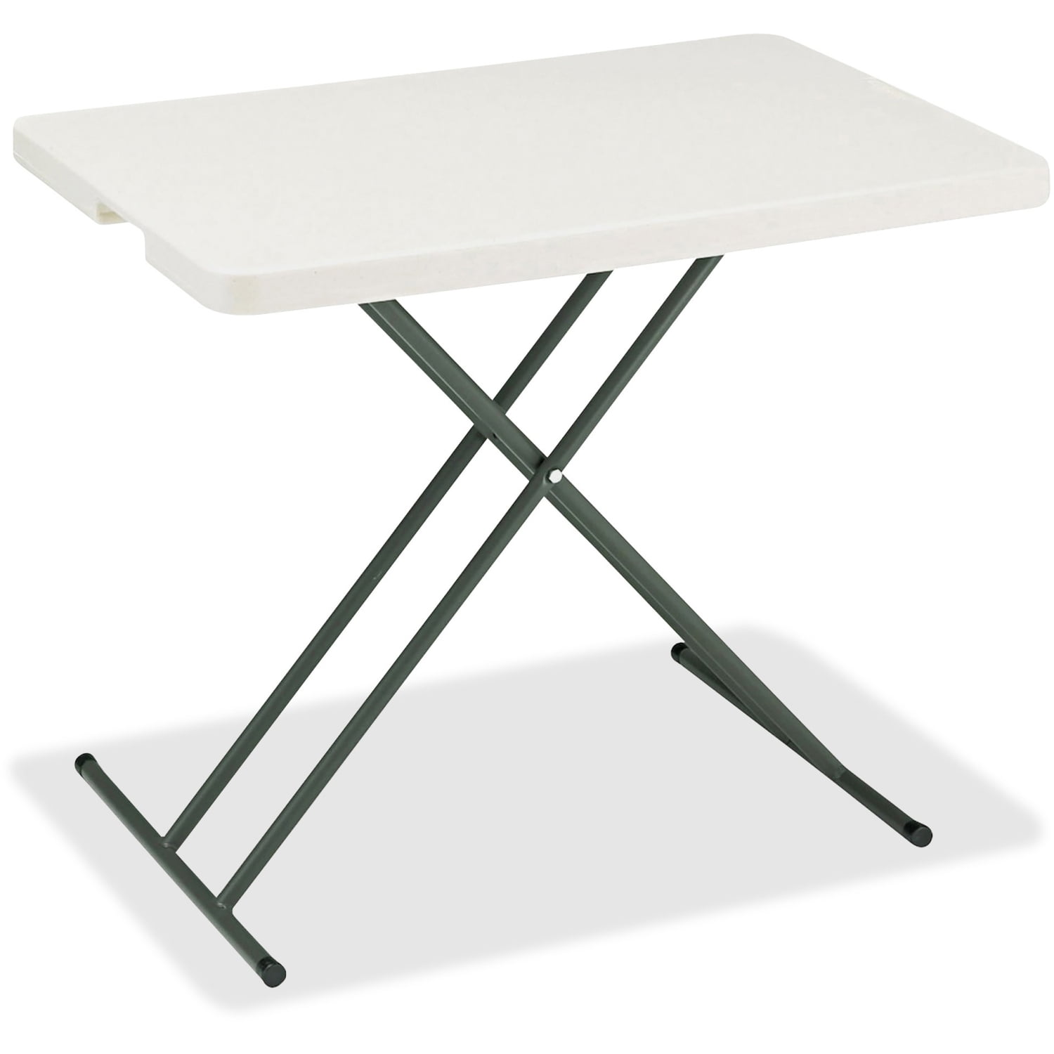The Iceberg IndestrucTable Classic personal folding table is lightweight, durable and portable. The perfect size table provides extra space. The dent- and scratch-resistant top is easy-to-clean and is constructed of blow molded high-density polyethylene. Heavy gauge, sturdy 1″ steel tube legs, with charcoal gray powder coat finish, folds into recessed channels for easy storage. Height is adjustable at either 25″ or 28″. Ideal for indoor or outdoor use. Base Type: 4 Folding Legs; Base/Leg Material: 1″ Tubular Steel; Capacity (Weight): Supports up to 25 lbs evenly distributed; Color Family: Gray; Edge Detail Profile: Radius Edge; Height Maximum: 28″; Height Minimum: 25″; Overall Depth: 20″; Overall Width: 30″; Series Name: Iceberg IndestrucTables Too™ 1200 Series; Top Color: Platinum/Gray; Top Material: Blow-Molded High-Density Polyethylene; Top Shape: Rectangular Compliance Standards: Meets or Exceeds ANSI/BIFMA Standards. Warranty: Manufacturer’s limited fifteen-year warranty. Post-Consumer Recycled Content Percent: 0%. Pre-Consumer Recycled Content Percent: 35%. Recycled Comments: Contains 35% total recycled content.