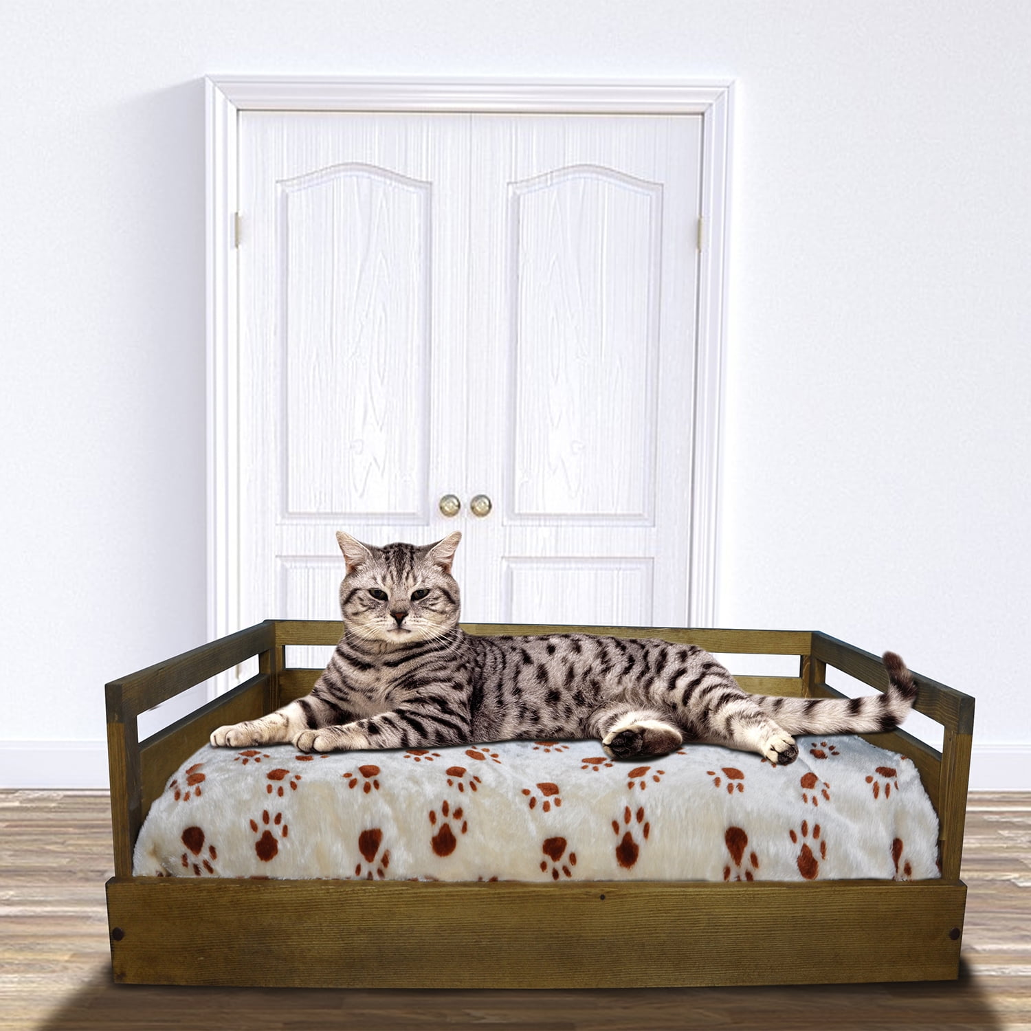 Iconic Pet Medium Wooden Pet Bed with Removable Cushion, Rustic Brown Made from durable pine wood, offering a stylish and cozy retreat for your pet Soft cushion with a removable, machine washable zippered cover for easy cleaning Available in elegant finishes: Antique Gray, Rustic Brown, and Black, complementing any home décor Versatile design accommodates pets of all sizes, from kittens to large dogs Crafted by Iconic Pet, known for high-quality and durable pet products