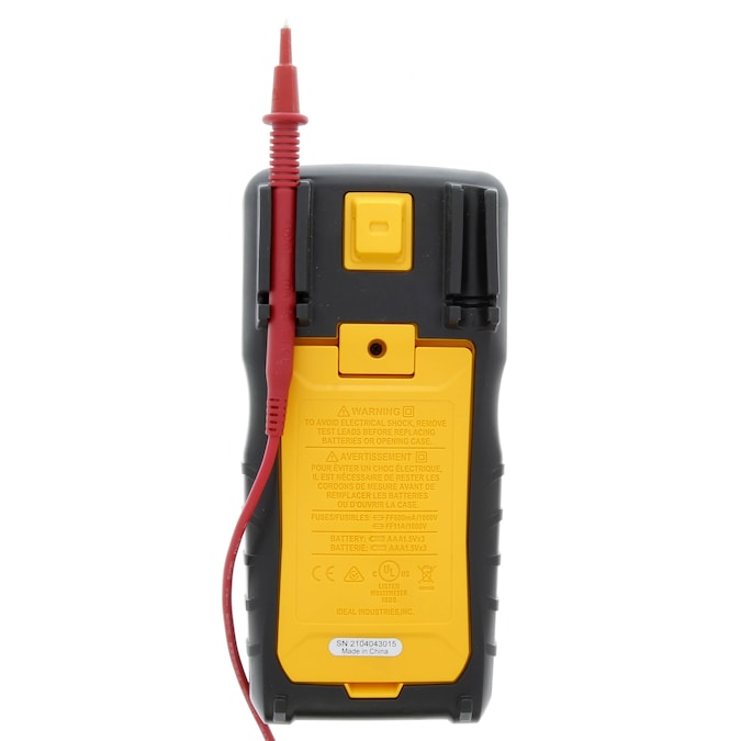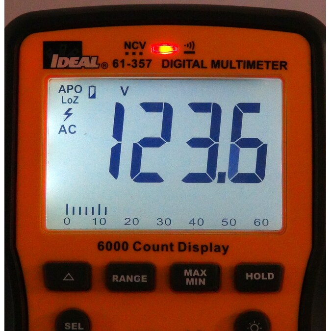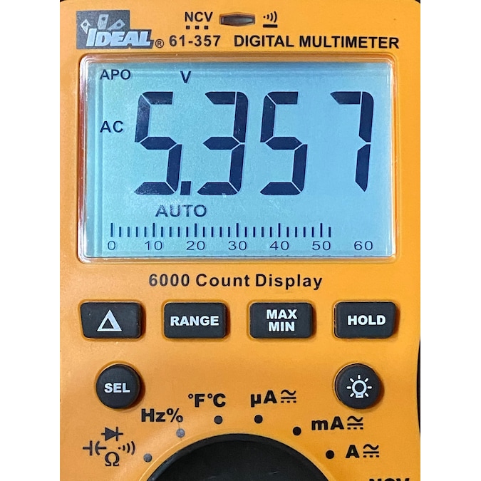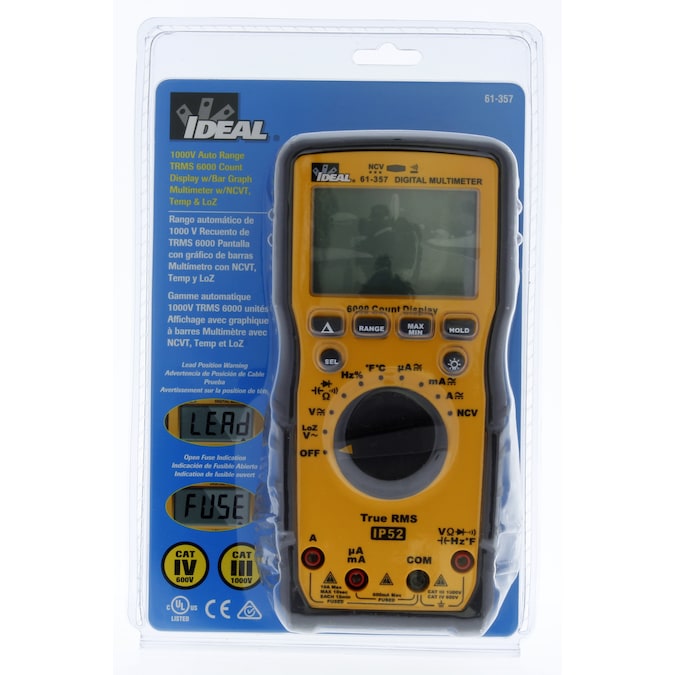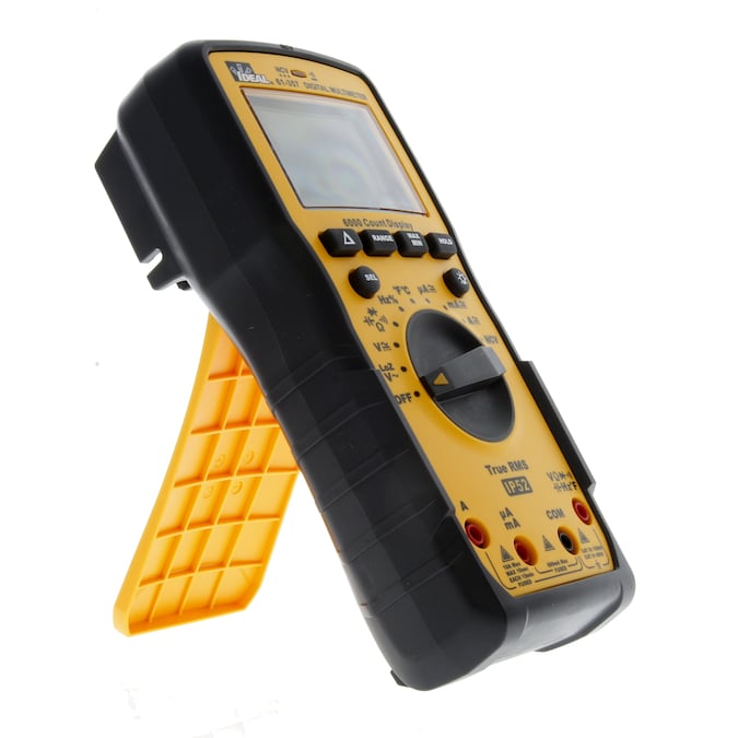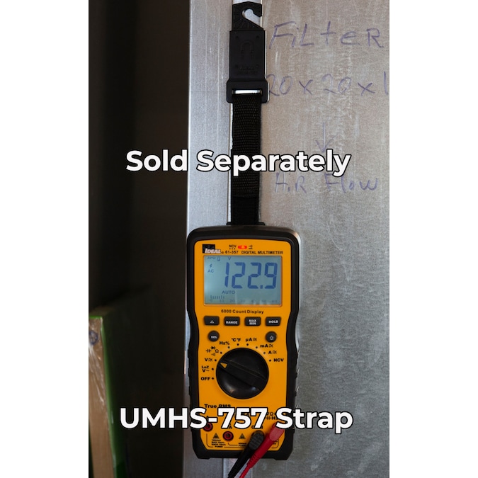 The IDEAL 61-357 digital multi Meter is a CAT IV 600 CAT III 1000V rated auto ranging true root mean square (TRMS) digital multi meter that measures up to 10 Amps AC and DC current via the test leads in series with the load. It measures up to 1000V AC and DC, LoZ (low impedance) AC V, frequency, resistance, continuity, capacitance, and diodes via test-leads (included) and measures temperature (F/C) via a K-Type thermocouple (included). It’s capable of detecting the presence of voltage between 40V to 600V via a non-contact sensor in the top center of the meter. It’s display features a digital readout and also an analog bar graph representation and can be backlit. The unit uses an illuminated red LED in the center of the meter and emits audible tones to notify when voltage is above 30 volts, when continuity is detected and when the NCV senses voltage within its set range. The rubber boot has two probe storage points has built-in probe tip holders to allow measurements while holding the meter in one hand and the second lead in the other hand. The meter has a hanging strap mount (compatible with all other IDEAL meters with this feature) that allows for a hanging strap (sold separately) to be attached to the meter so it can be hung from a nail, screw or magnetic surface. An industrial grade over molding enhances grip and drop protection. This meter features hold, min/max, relative, range, and selectable auto power off functions. The meter comes with 3 1.5V AAA batteries and an easy open, fully accessible storage pouch with a belt loop that allows for meter, probes and thermocouple storage.