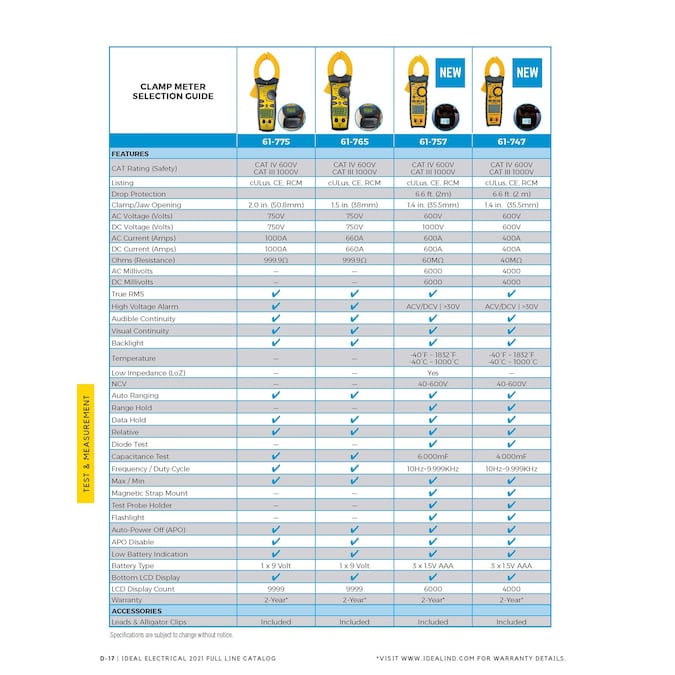 The new feature-rich IDEAL Tight-Sight clamp meters, including the IDEAL 61-765 are built to professional quality standards to withstand tough use in commercial and industrial settings. The high frequency rejection (HFR) feature measures accurately even in noisy electrical environments. For everything from load measurement to troubleshooting industrial motors and adjustable speed drives (adds), the new Tight-Sight clamps bring speed, accuracy, safety and ease-of-use together in one rugged meter line.