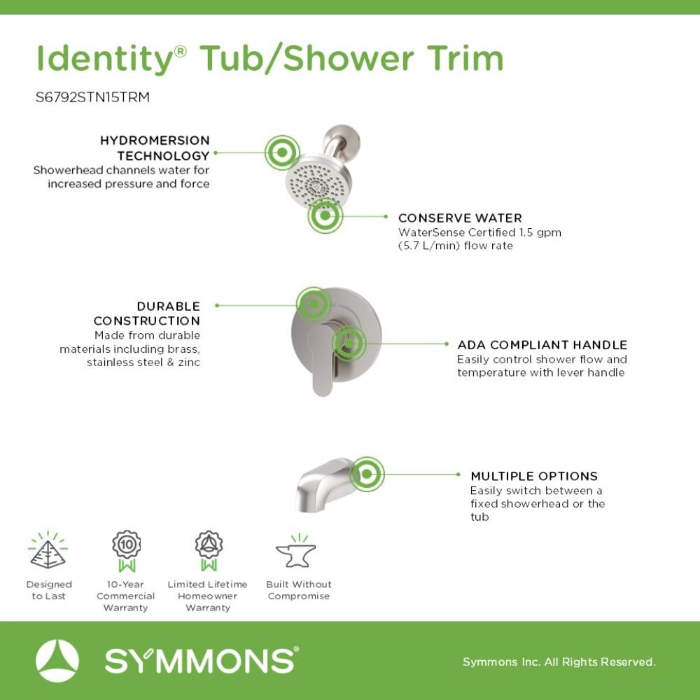 Plated in an abrasion resistant finish, this single handle trim kit from the Symmons Identity Collection is built to last. It includes essential components for a complete shower experience: a shower arm, low flow showerhead, diverter tub spout, escutcheon, and an ADA compliant lever handle. Experience both luxury and eco friendliness with the WaterSense certified single mode showerhead, boasting a low flow rate of 1.5 GPM. The 4 inch round showerhead is powered by HydroMersion technology for increased pressure and force. This innovative design conserves water without compromising on performance, saving you money on your water bill. Rest assured knowing that like all Symmons products, this Identity trim kit is backed by a limited lifetime consumer warranty and a 10 year commercial warranty, ensuring peace of mind for years to come.