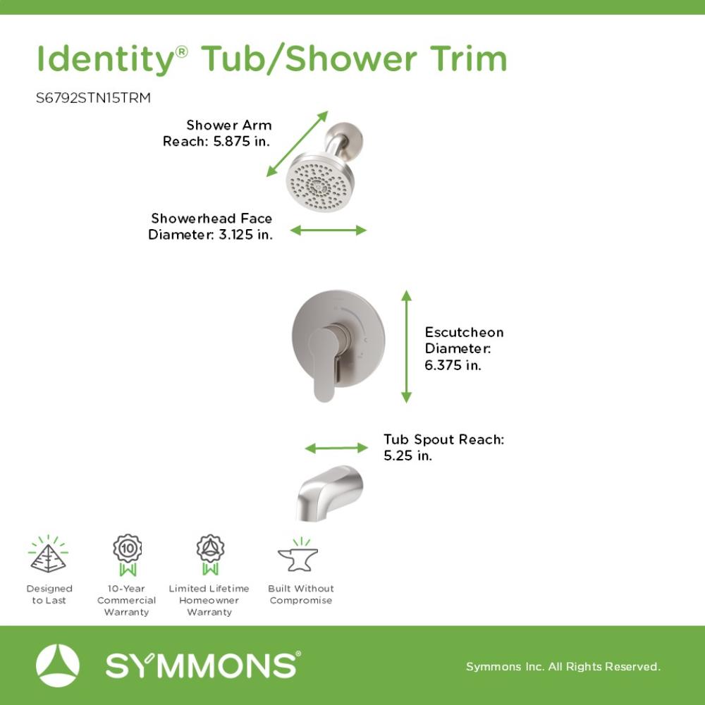 Elevate your bathroom with this complete tub and shower trim kit from the sleek Symmons Identity Collection. Included in this comprehensive kit are a tub spout, shower arm, showerhead, escutcheon, ADA compliant shower lever handle, and integral diverter handle to seamlessly switch from tub to shower right at the valve. The single mode showerhead is WaterSense certified with a low flow rate of 1.5 GPM. The round showerhead is powered by HydroMersion technology for increased pressure and force. Rest assured with Symmons’ unwavering commitment to quality, as this Identity tub and shower trim kit is backed by a limited lifetime consumer warranty and a 10 year commercial warranty.