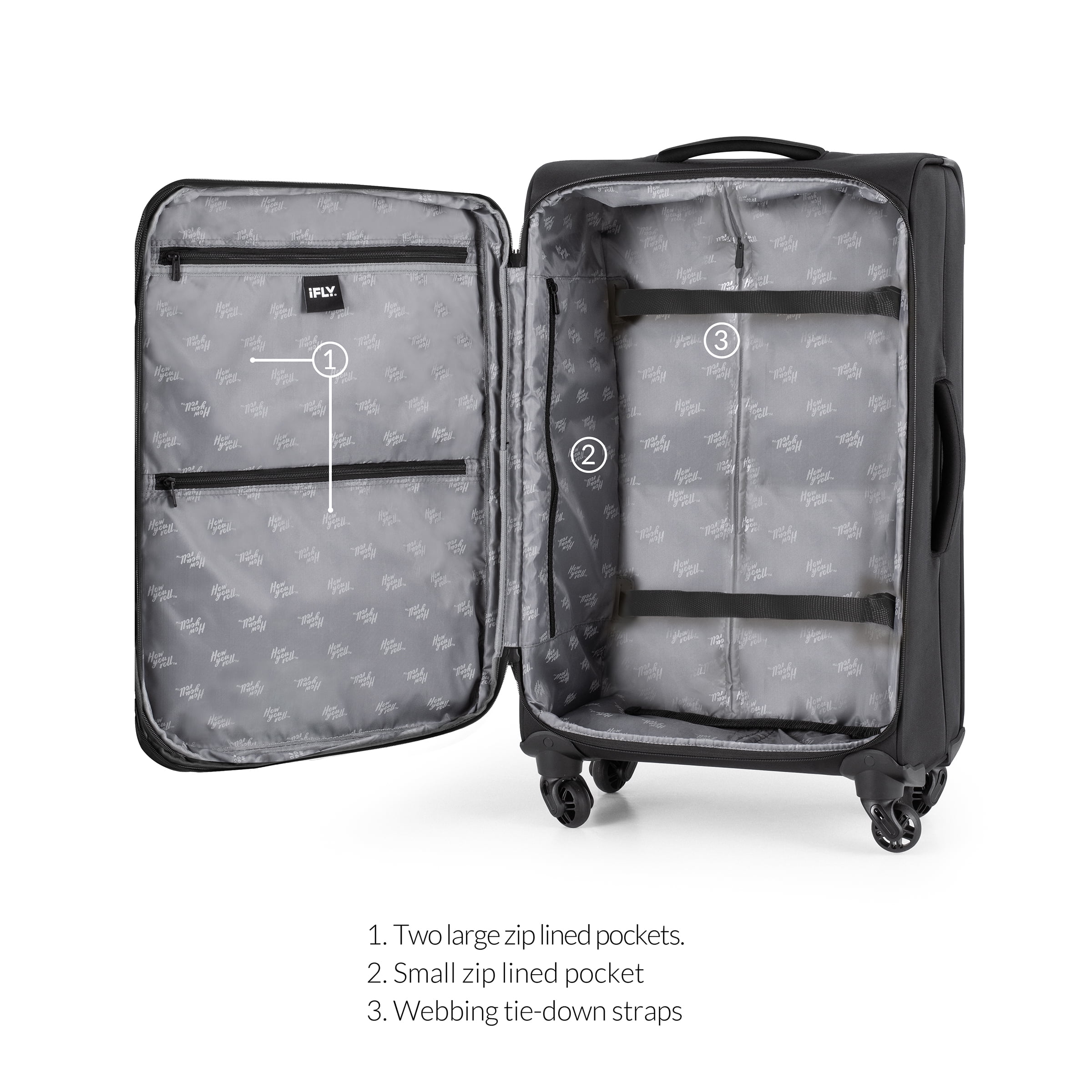 iFLY Softside Fibertech 3-Piece Luggage Set, 20″ Carry-on, 24″ Checked and 28″ Checked Luggage, Black