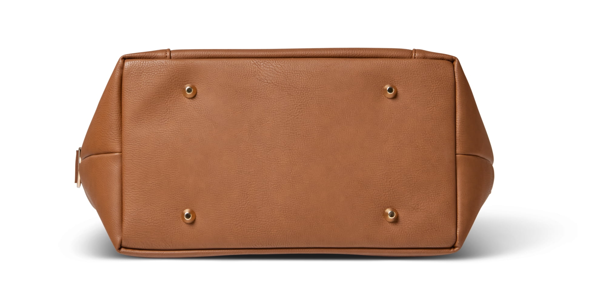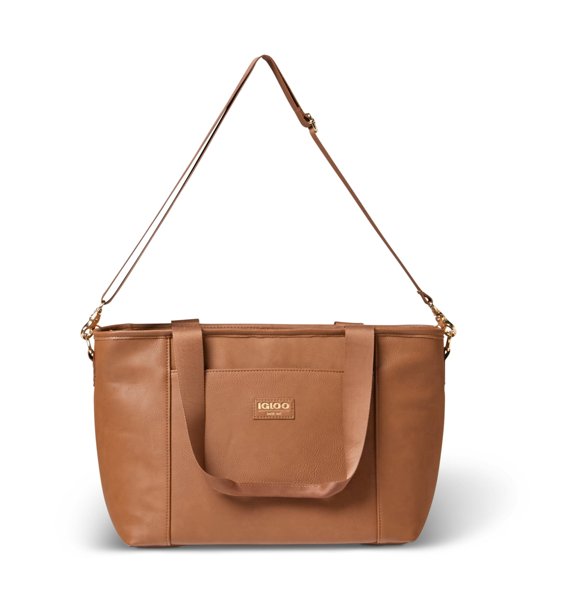 Designed with a stylish, Igloo Cognac Brown soft vegan PU leather exterior & gold metallic insulated liner Gold-colored metal feet on bottom keeps bag elevated off surfaces Insulated liner is leakproof, antimicrobial & easy to wipe clean Features multiple carry options: removable, adjustable crossbody shoulder strap & dual tote grab handles Features gold-colored metal trims & hardware (zipper, strap clip, attachment ring & strap sliders) Vegan PU leather zipper pulls for easy opening/closing Zipper opens wide to reveal the spacious main compartment Advanced MaxCold insulation keeps food & drinks cold for longer Front exterior slip pocket to hold your accessories Put the size into perspective: Holds 24 cans