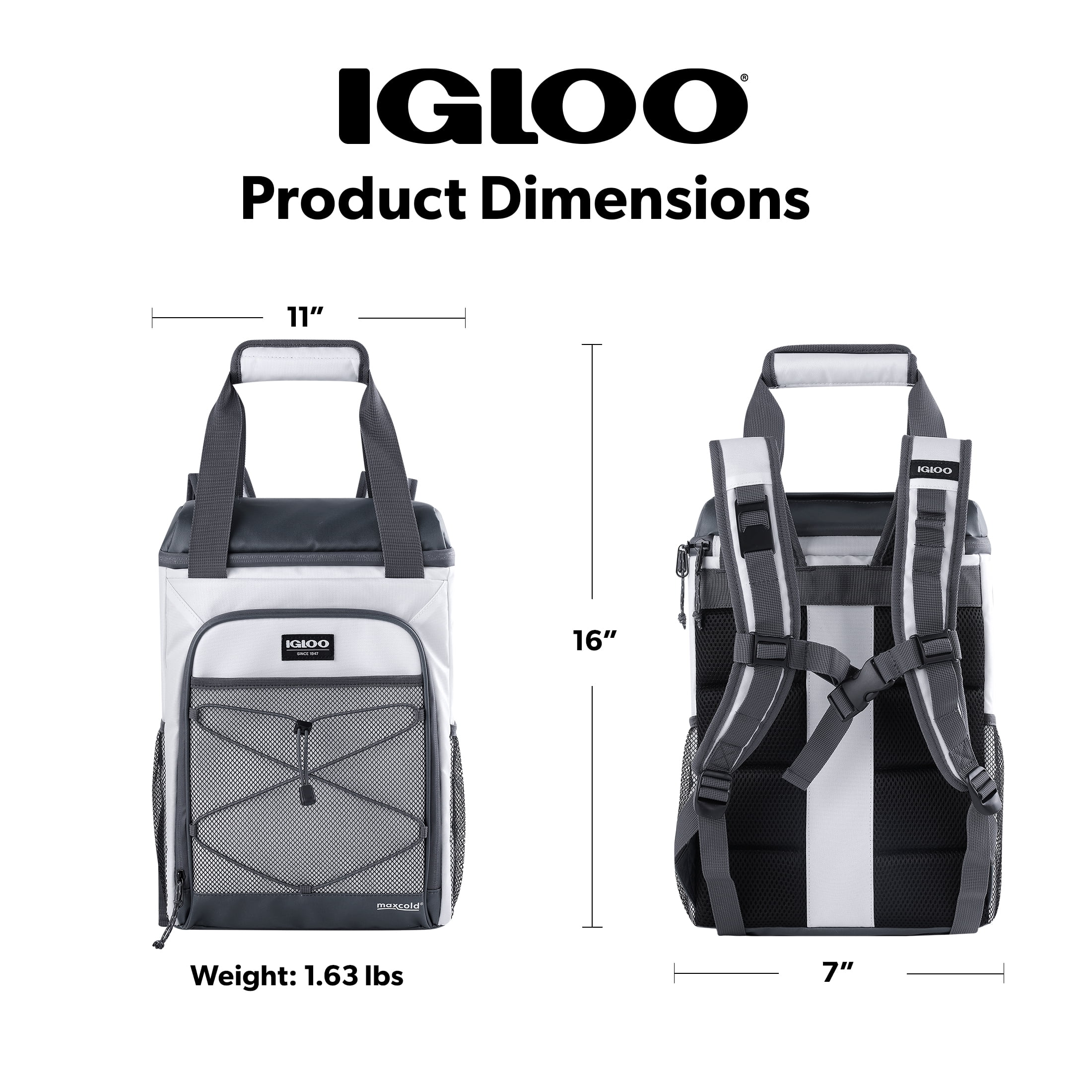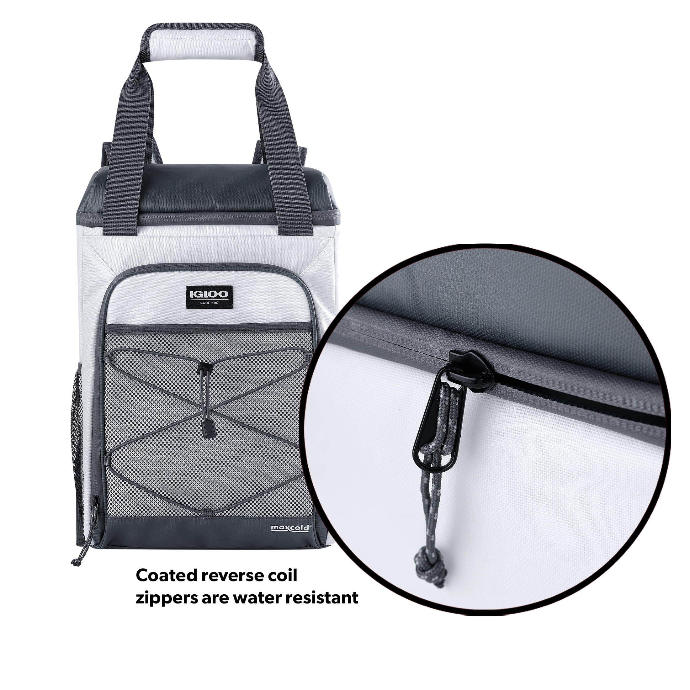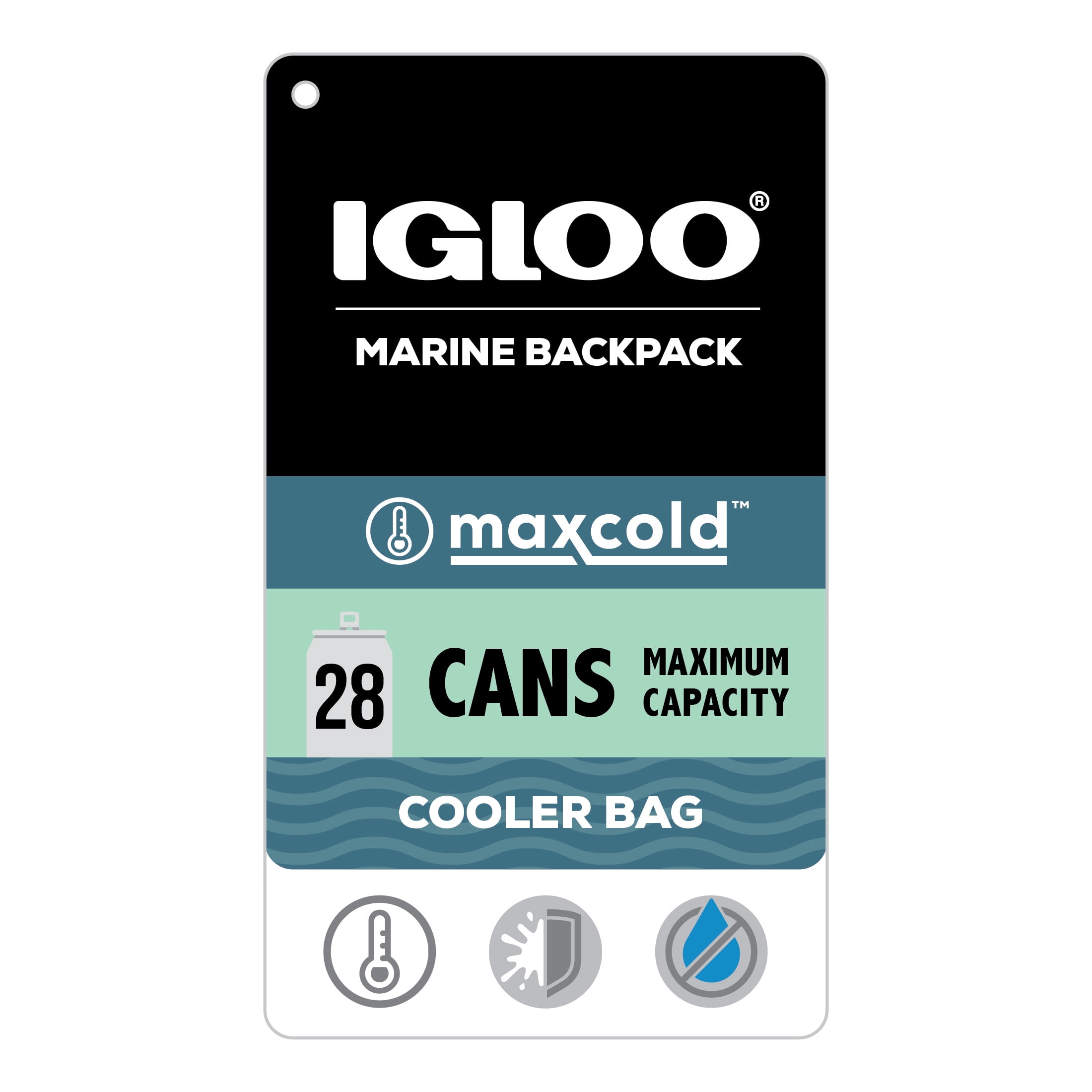 Igloo Marine Backpack Cooler holds 28 cans Coated reverse coil zippers are water resistant Exterior coated panels are water and dirt resistant Adjustable padded backpack straps with air mesh makes carrying comfortable Padded fabric wrapped top grab handles for grab-and-go convenience Large front zip pocket provides additional storage Various mesh pockets and bungee cord provide ample exterior storage and organization Easy to find metal bottle opener is attached to the backpack straps Made up of Polyester material Up to 28 can volume capacity