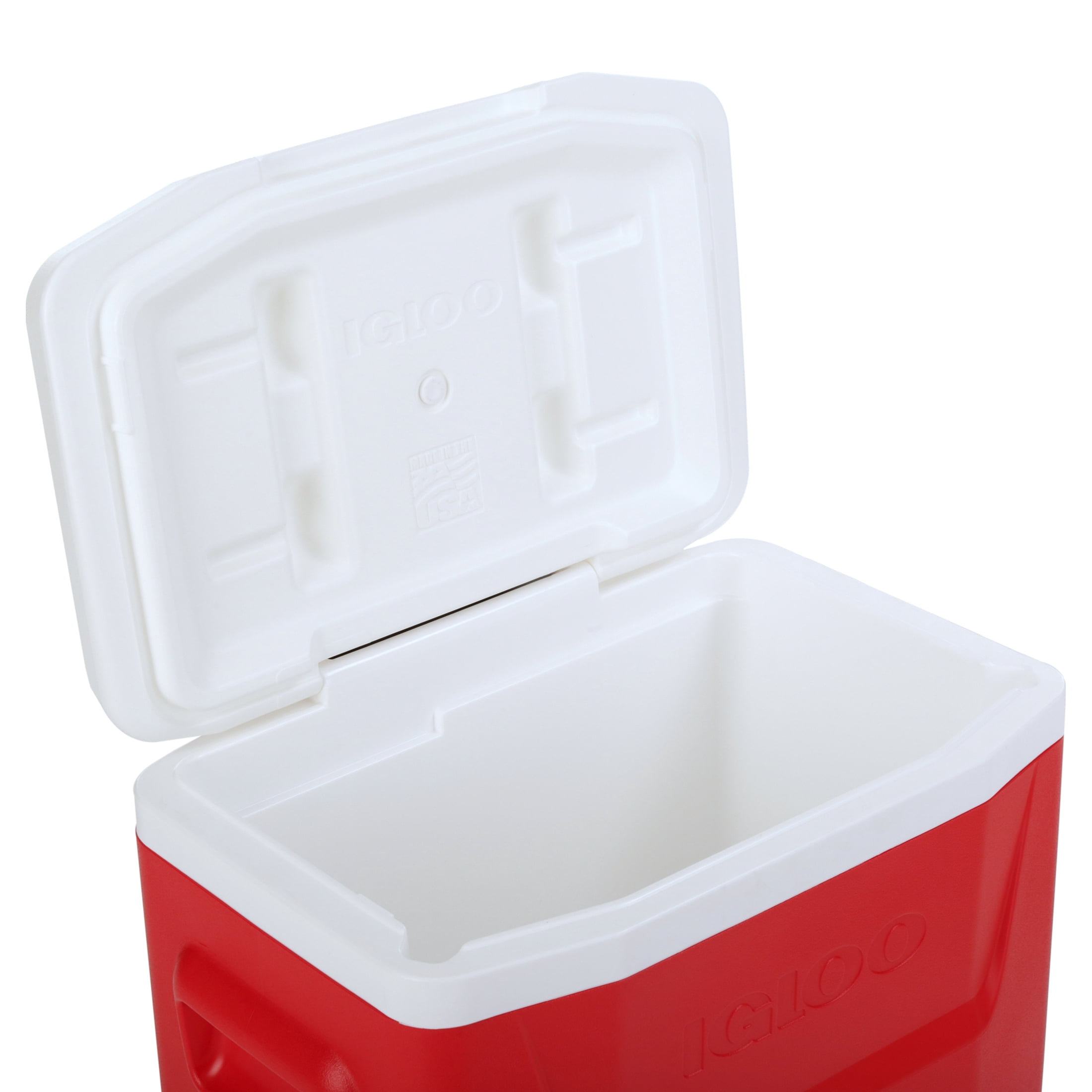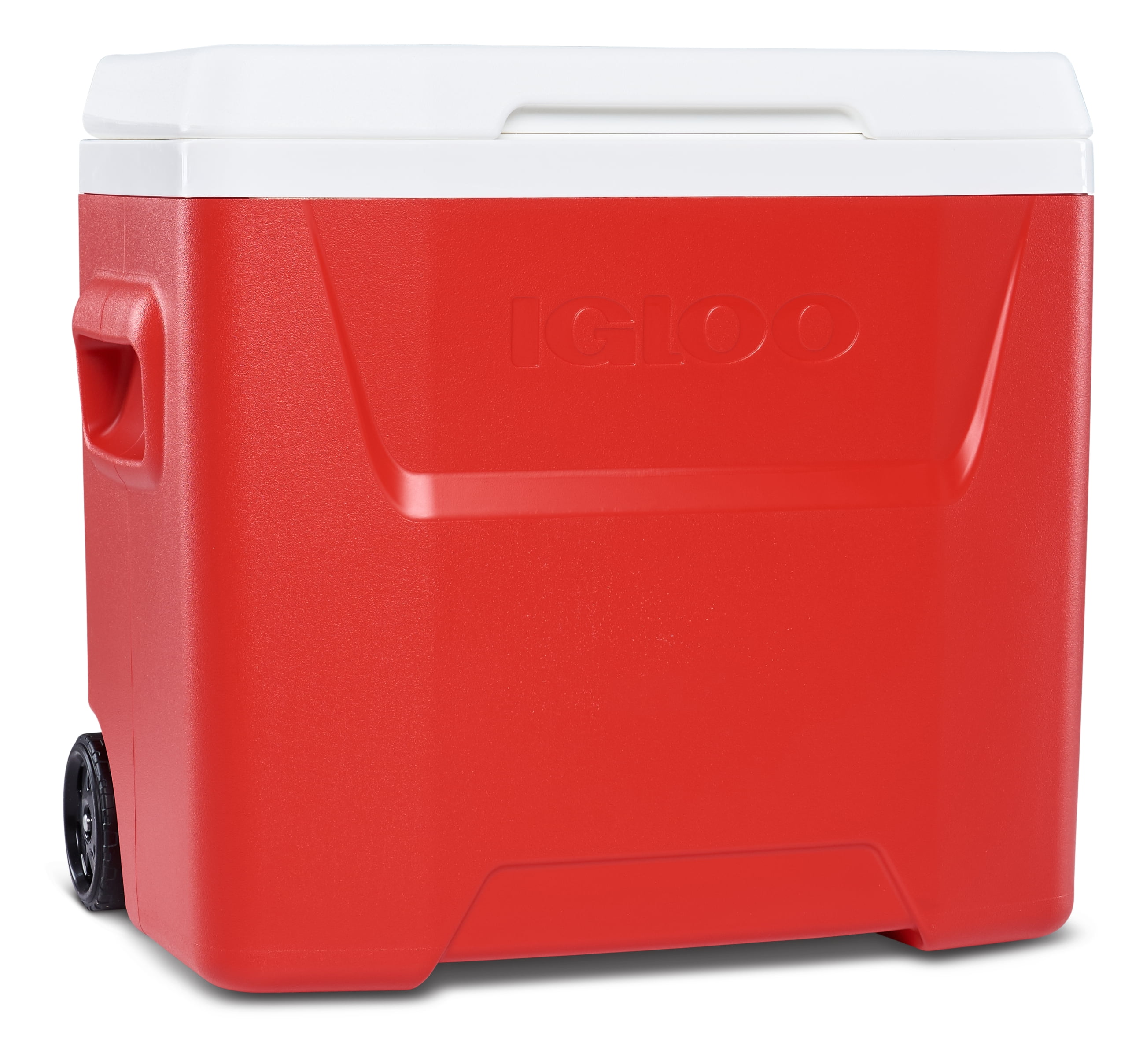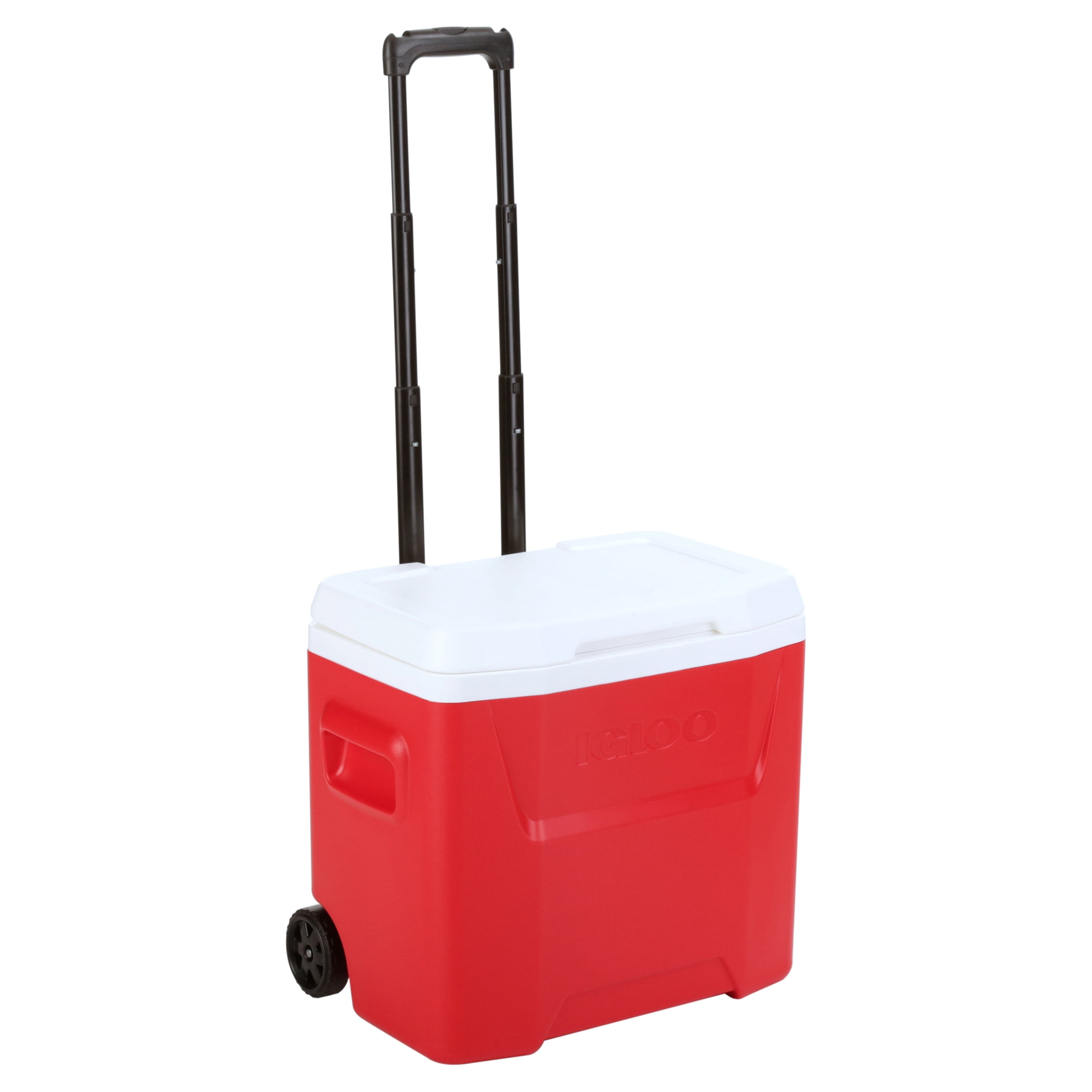 Igloo 28 qt. Hard Sided Ice Chest Cooler – Red Wheeled for easy transport Locking, telescoping handle enables cooler to be pushed or pulled Molded-in side handles for easy loading / unloading Integrated “pouring channels” in liner allow for easy purging of melted ice Cool Riser Technology® – elevated design improves cooling performance 26 Liters, 42 cans