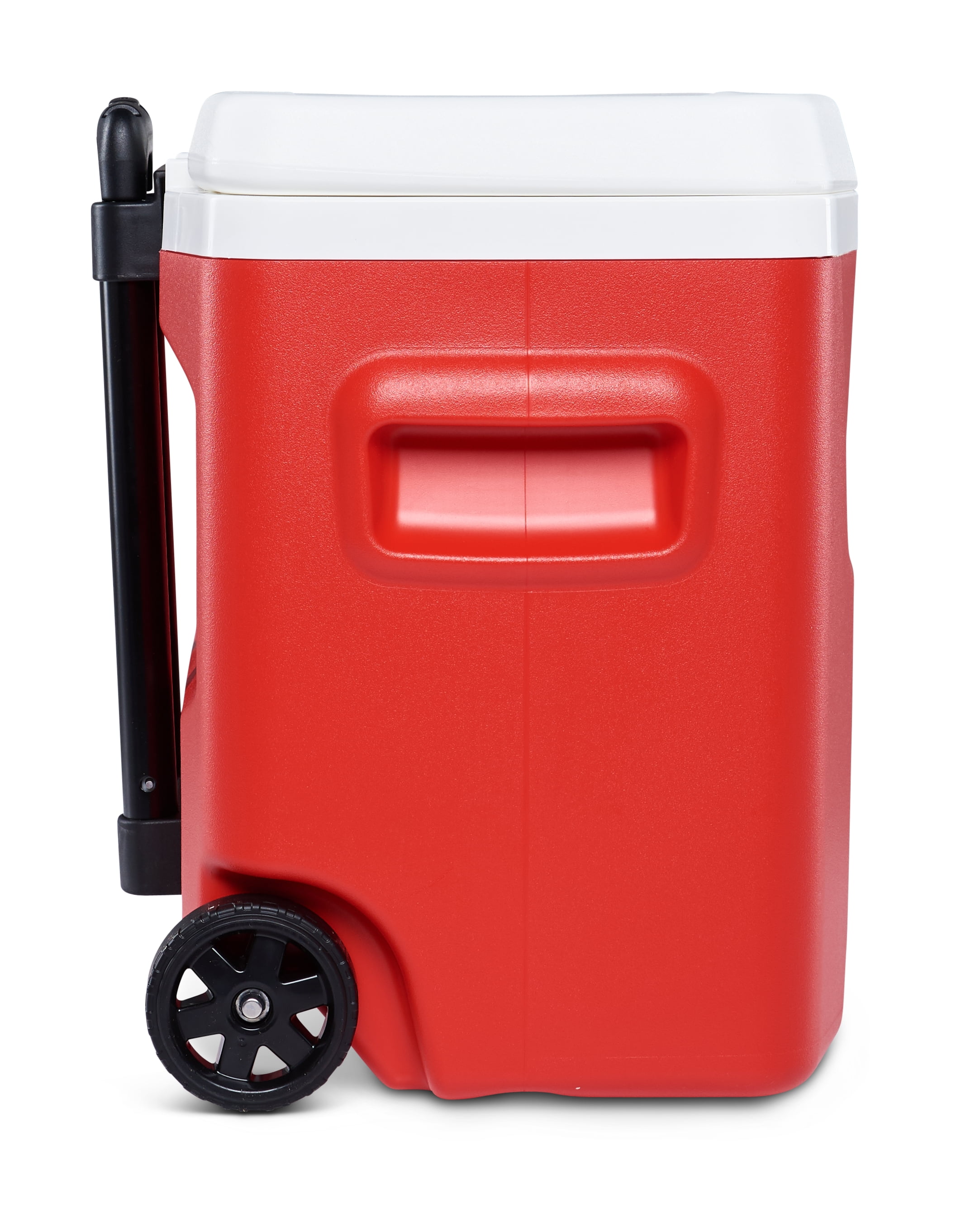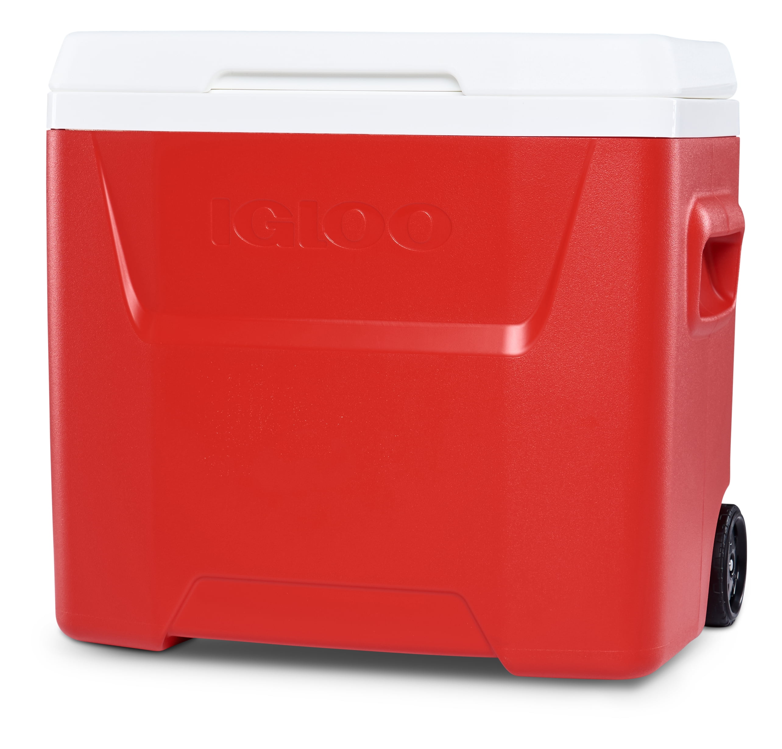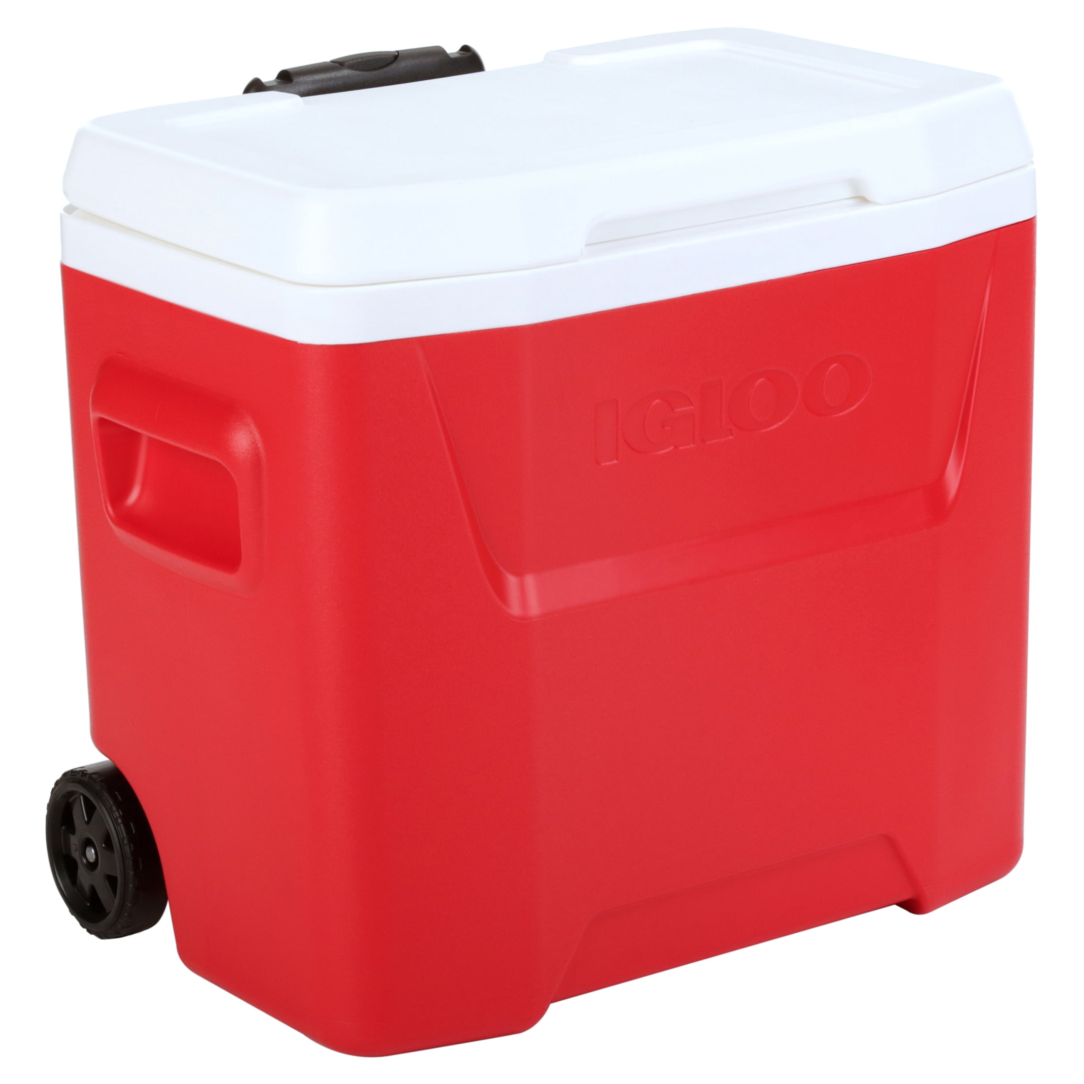 Igloo 28 qt. Hard Sided Ice Chest Cooler – Red Wheeled for easy transport Locking, telescoping handle enables cooler to be pushed or pulled Molded-in side handles for easy loading / unloading Integrated “pouring channels” in liner allow for easy purging of melted ice Cool Riser Technology® – elevated design improves cooling performance 26 Liters, 42 cans
