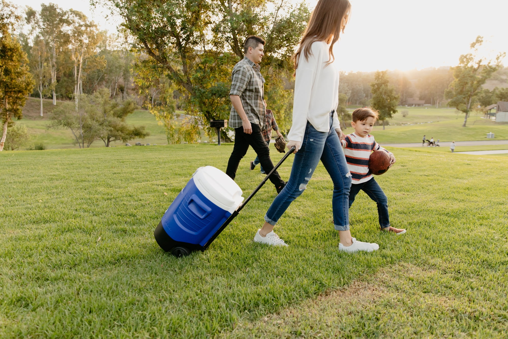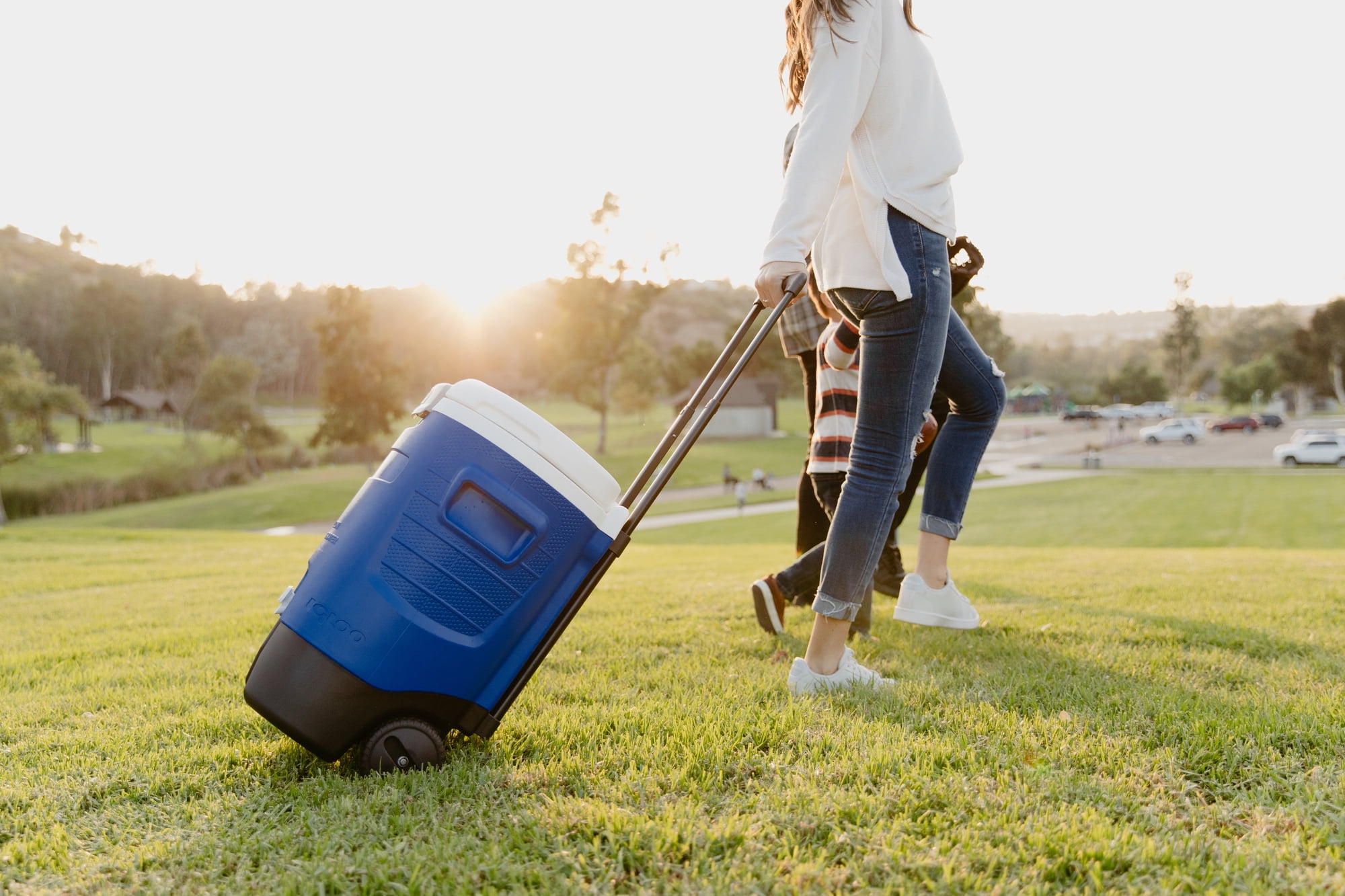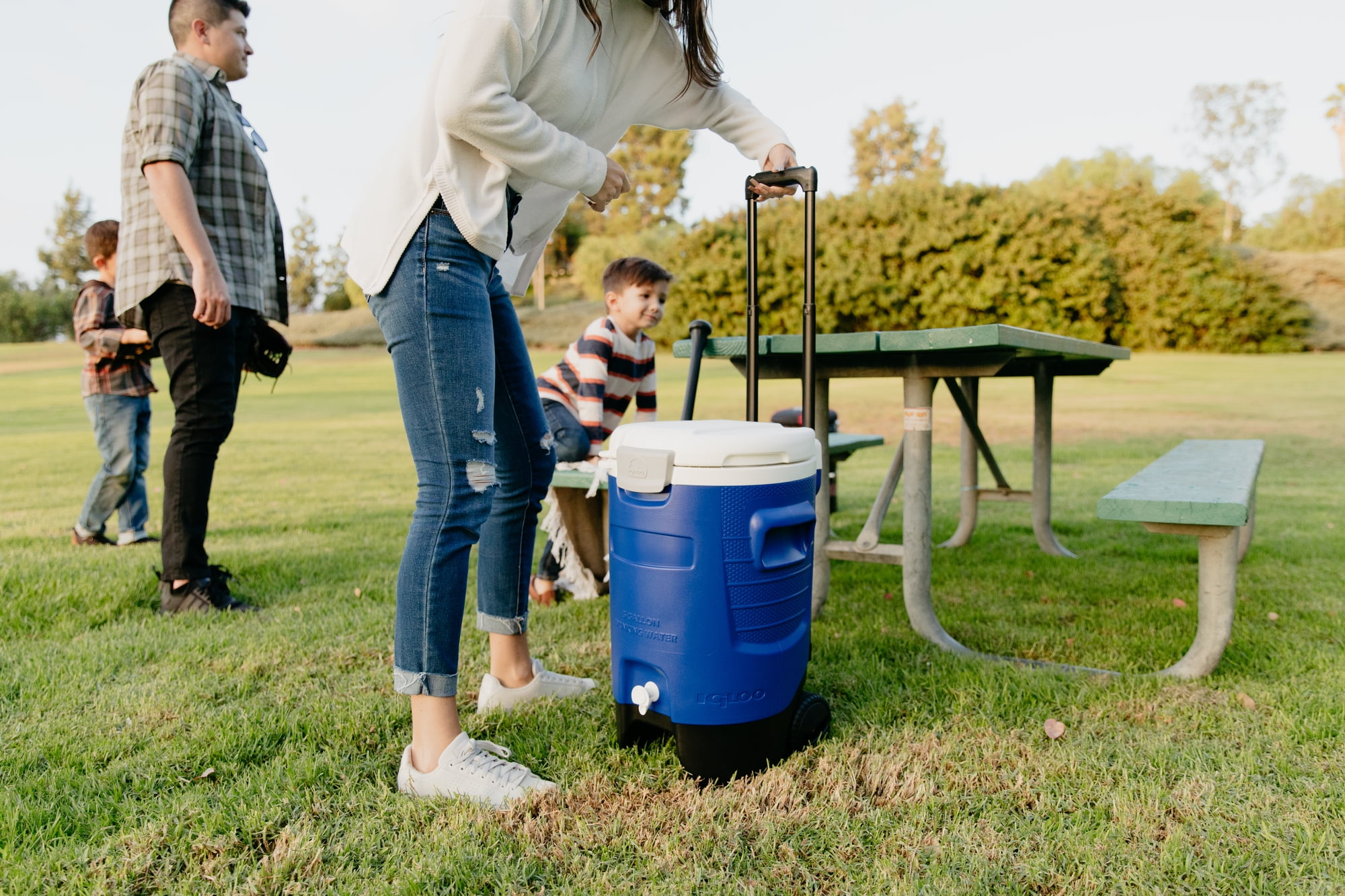 The Igloo 5 gal Rolling Water Cooler in Blue has sturdy, wide inset wheels and locking, telescoping handle lighten full-jug carrying load to and from the game Cool Riser Technology™ improves cooling performance by elevating away from hot surfaces Gasketed, leak-resistant lid with secure latch keeps liquids on lockdown during transport Push-button spigot is recessed and angled spigot for easy, leak-free dispensing Ingenious elevated design keeps spigot clean and provides better accessibility when filling cups and containers Molded-in side handles to ease lifting and loading