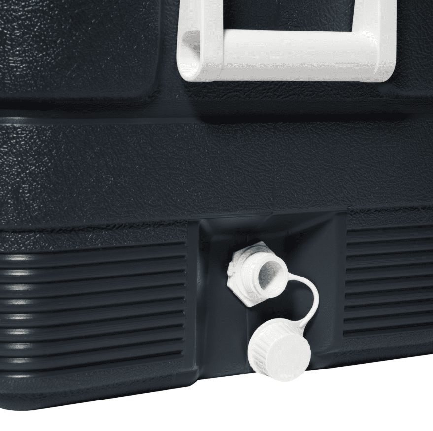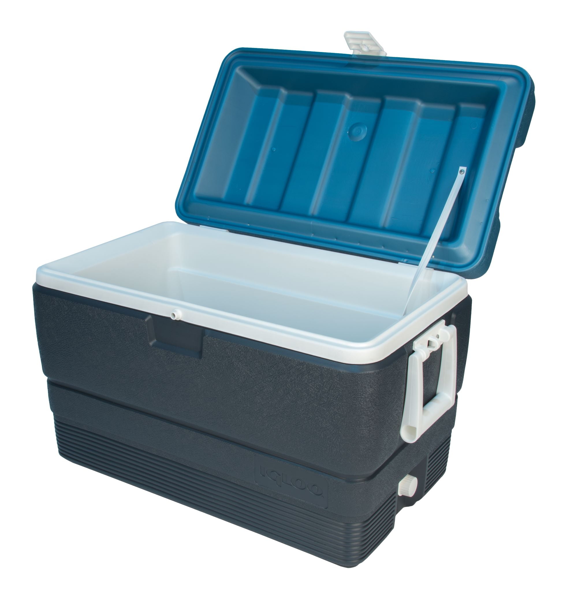 Igloo 50qt MaxCold Ice Chest Water Cooler with Snap-fit Latch, Blue Holds ice up to 5 days at 90°F Ultratherm™ insulation in body and lid Snapfit latch secures lid closure Reinforced swingup handles Threaded drain plug for hose hook up