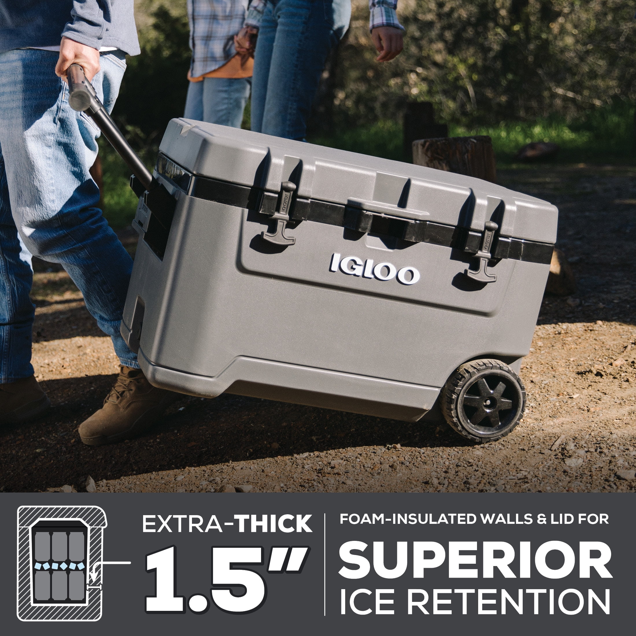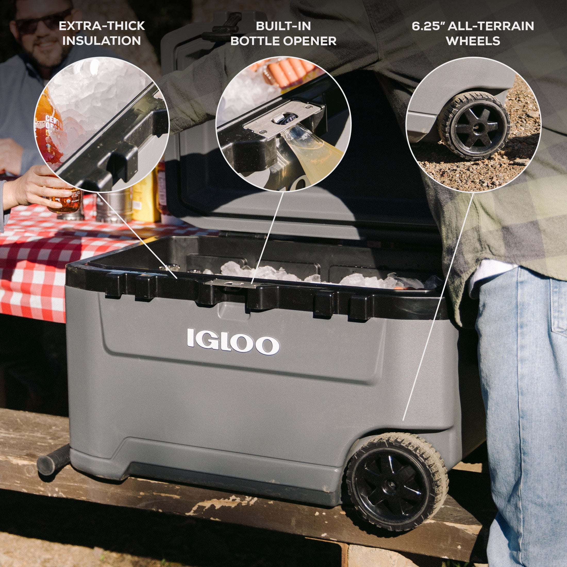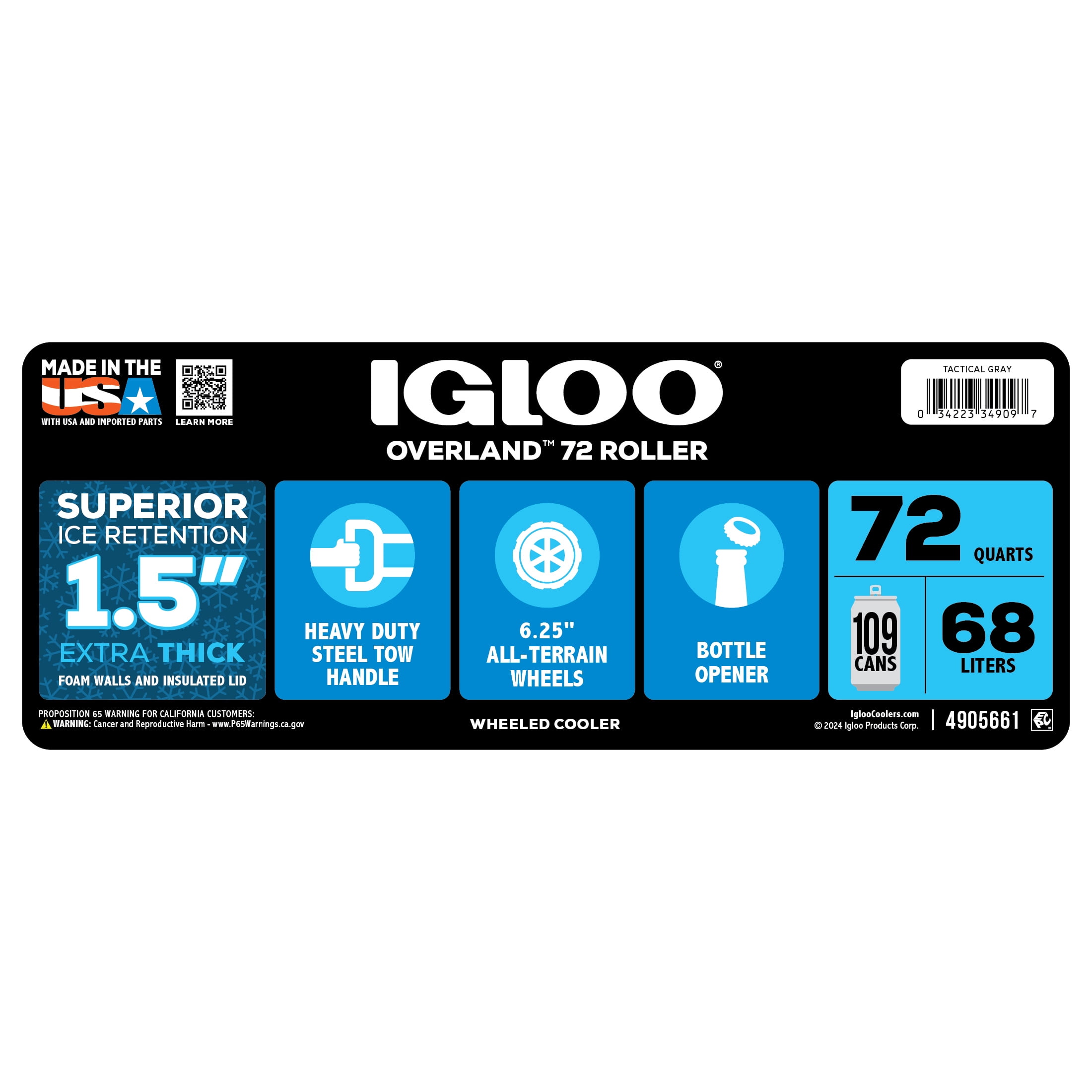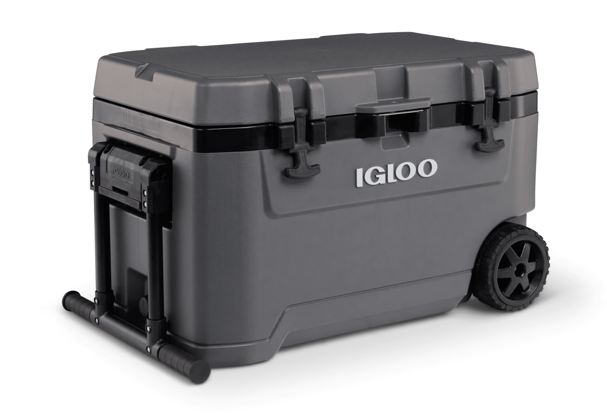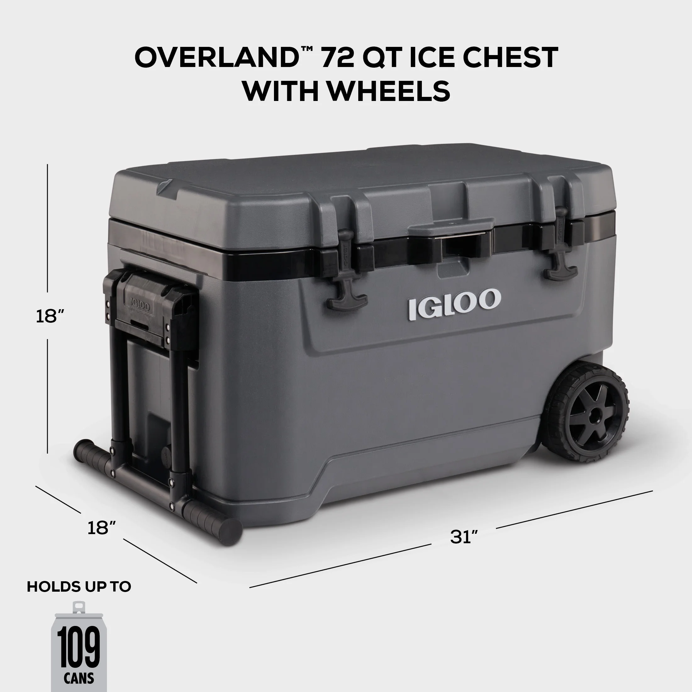 Adventure-ready performance ice chest with wheels that’s built for the great outdoors Extra-thick 1.5-inch foam-insulated walls & insulated lid for extended ice retention 6.25-inch soft-ride wheels provide all-terrain mobility Powder-coated steel tow handle with comfort for hassle-free pulling Sturdy, comfort-grip side handle for easy unloading & loading Lid includes a locking plate for added security Durable rubberized lid latches help to lock in the cold Oversized, heavy-duty hinges provide added durability Leak-resistant threaded drain plug gives you the option to hook up to your water hose for easy draining & includes a tethered, cap so it won’t go missing UV inhibitors prevent sun damage The Igloo Overland Series 72 QT Roller Wheeled Cooler in Charcoal Gray Adventure-ready performance ice chest with wheels that’s built for the great outdoors Extra-thick 1.5-inch foam-insulated walls & insulated lid for extended ice retention 6.25-inch soft-ride wheels provide all-terrain mobility Powder-coated steel tow handle with comfort for hassle-free pulling Sturdy, comfort-grip side handle for easy unloading & loading Lid includes a locking plate for added security Durable rubberized lid latches help to lock in the cold Oversized, heavy-duty hinges provide added durability Leak-resistant threaded drain plug gives you the option to hook up to your water hose for easy draining & includes a tethered, cap so it won’t go missing Built-in bottle opener helps you quickly & easily enjoy your bottled beverages Antimicrobial liner helps keep Overland clean Built-in bottle opener helps you quickly & easily enjoy your bottled beverages Material: Plastic Put the size into perspective: Holds up to 109 cans Put the size into perspective: Holds up to 109 cans