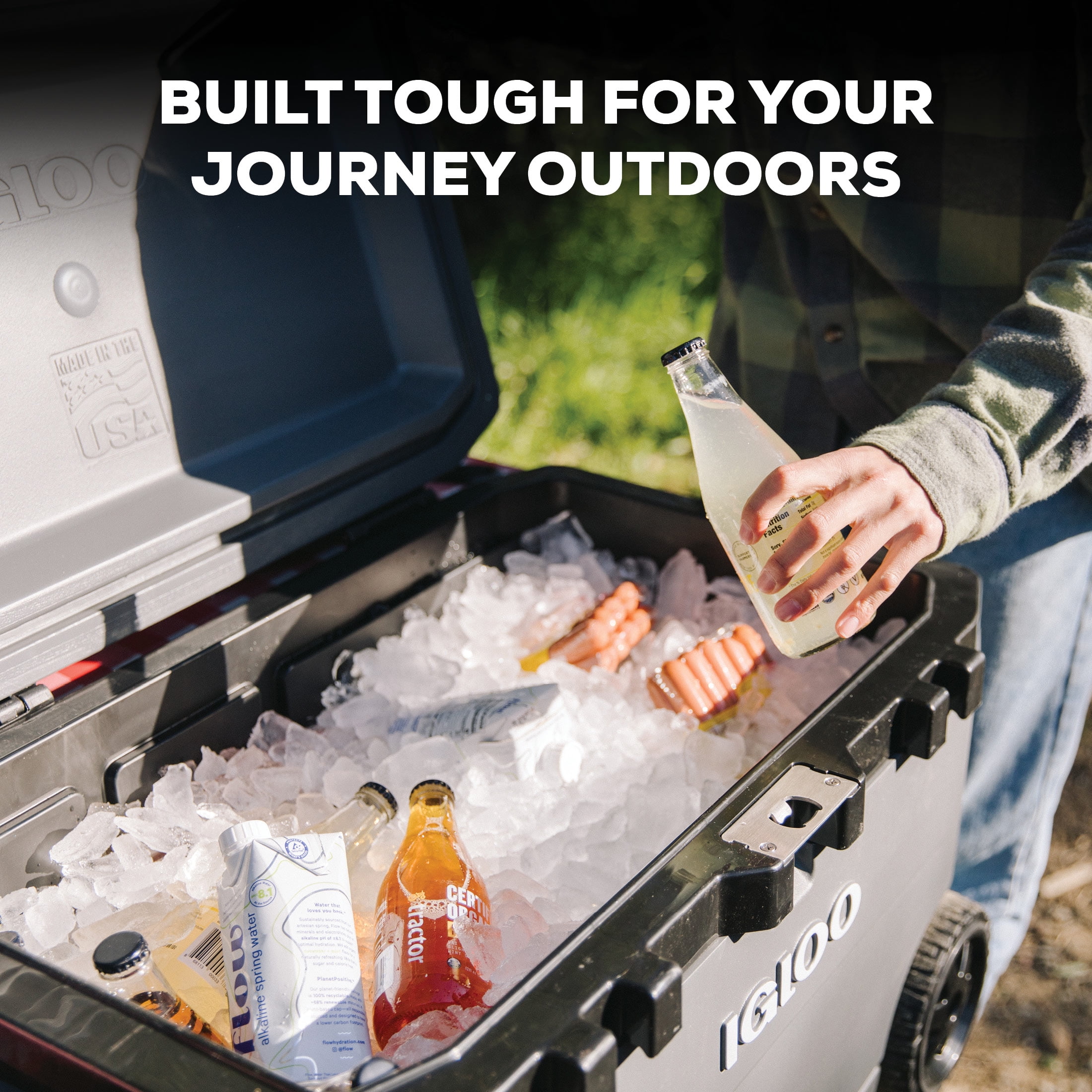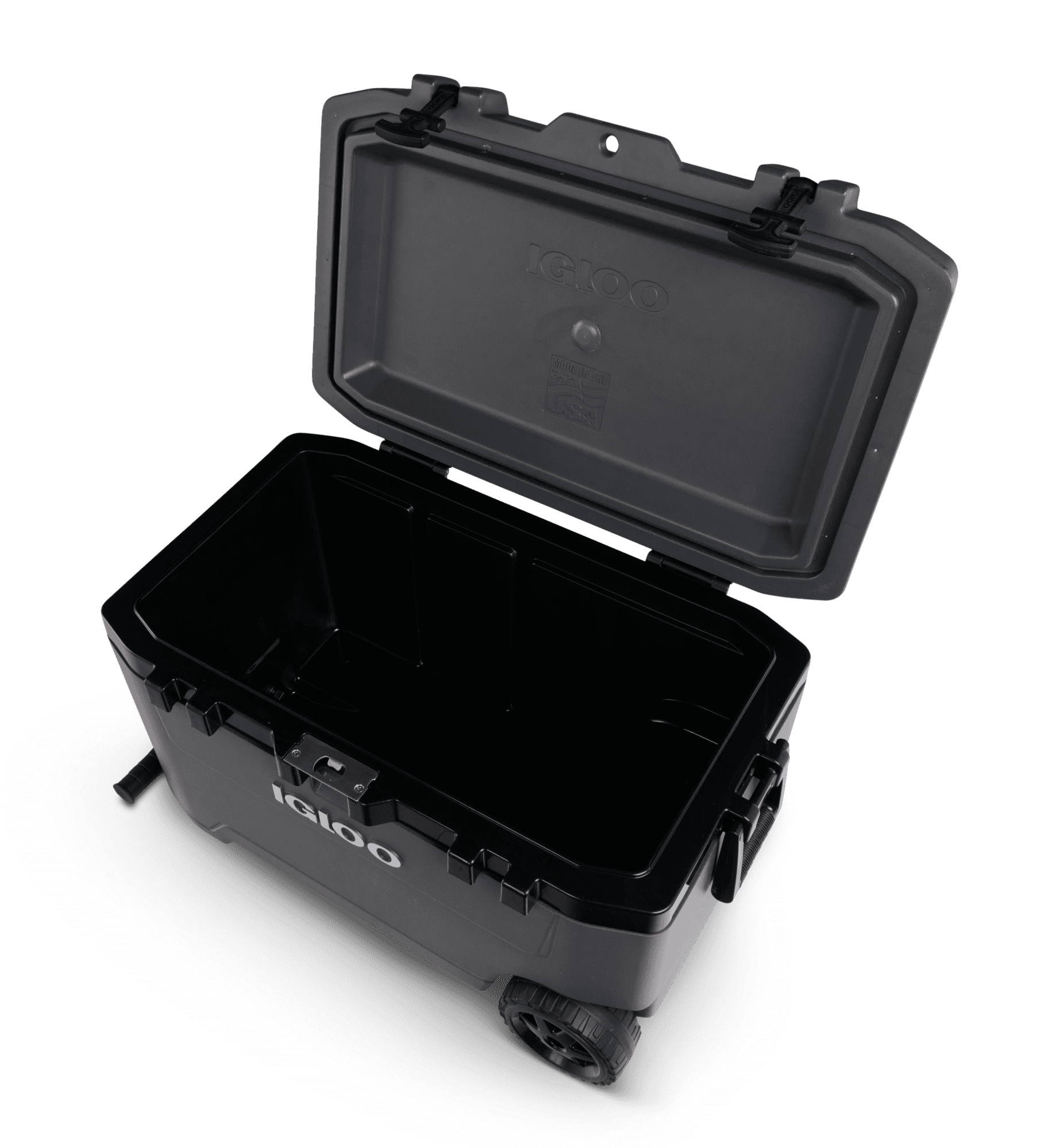 The Igloo Wheeled Overland 72 Quart Roller Cooler is built tough for your journey outdoors! The extra-thick 1.5-inch foam-insulated walls and insulated lid, provide dependable, long-lasting ice retention, keeping food and drinks chilled. Secure the lid with it’s durable rubberized latches so things won’t spill out. For added security, use with a standard lock (not included) on the built-in locking plates. The 72 quart Overland is easy to roll with oversized, multi-terrain, soft-glide wheels and a comfort-grip tow handle. This cooler is loaded with convenient features, like a bottle opener, UV inhibitors which help prevent sun damage and a threaded, tethered drain plug for easy emptying of melted ice. at Igloo’s manufacturing plant in Texas. Dimensions: 31″ x 18″ x18.