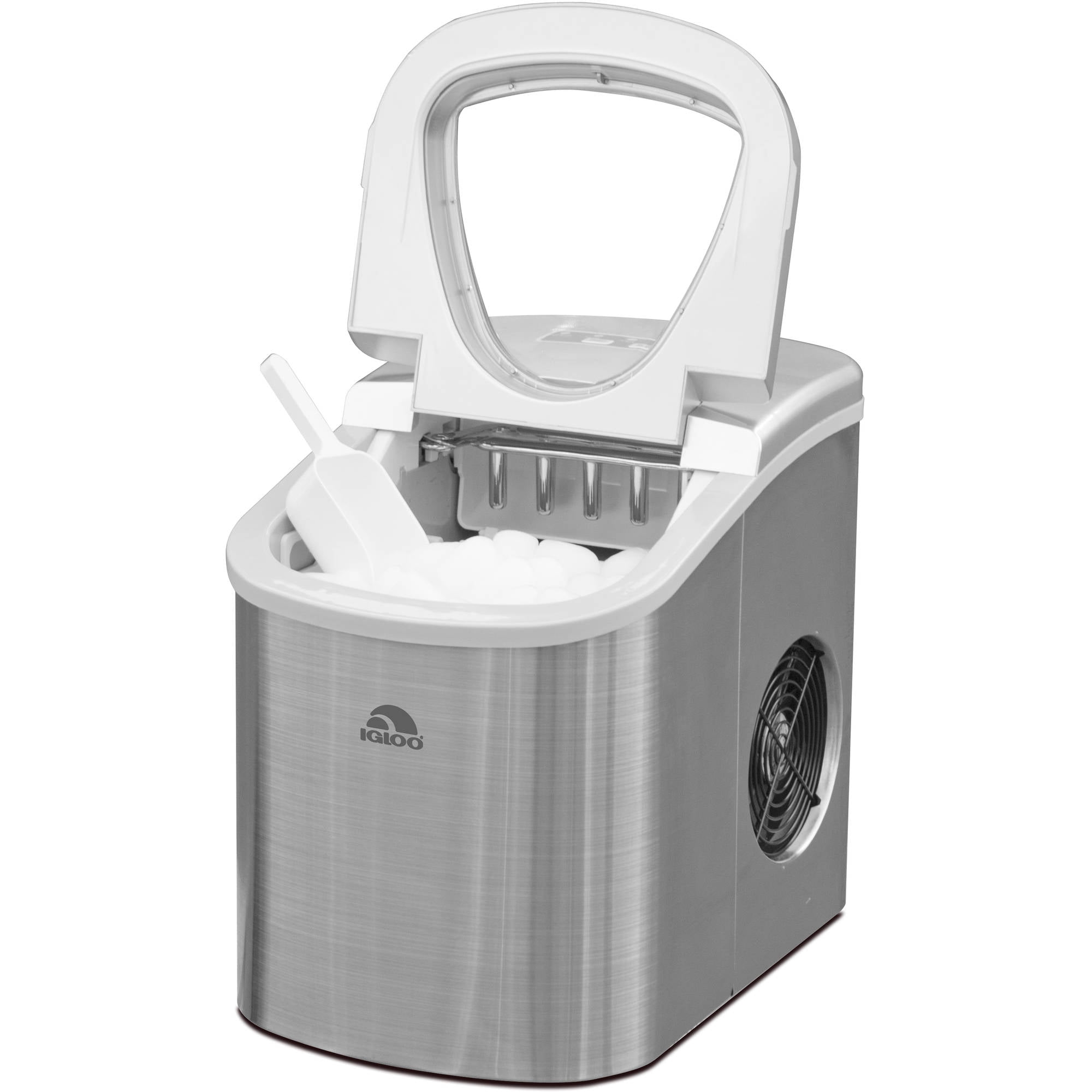 Igloo Compact Ice Maker ICE117 Stainless Steel: Never run to the store for a bag of ice again Features a see-through window, silver lid and durable stainless-steel exterior Includes a handy ice scoop Igloo ICE117 model ice maker requires no installation Igloo Compact Ice Maker has an easy to fill 1-gallon reservoir Makes fresh ice in less than 7 minutes Electronic LED controls allow you to choose from 2 ice sizes Extremely quiet (less than 38 Db) compressor cooling system Produces 26 lbs of ice in 24 hours The ice basket can store 2.5 lbs The stainless steel ice maker is designed for anywhere you need ice
