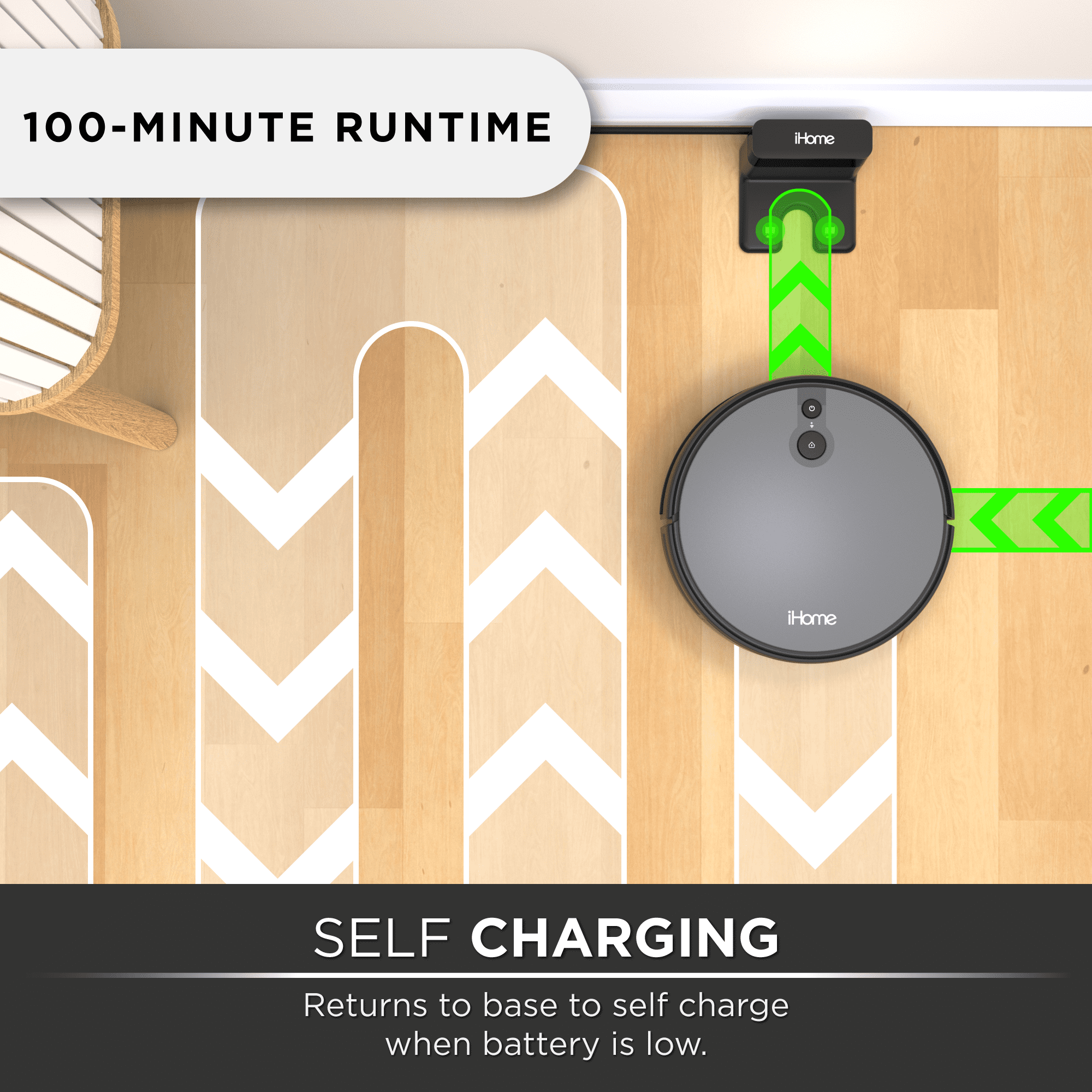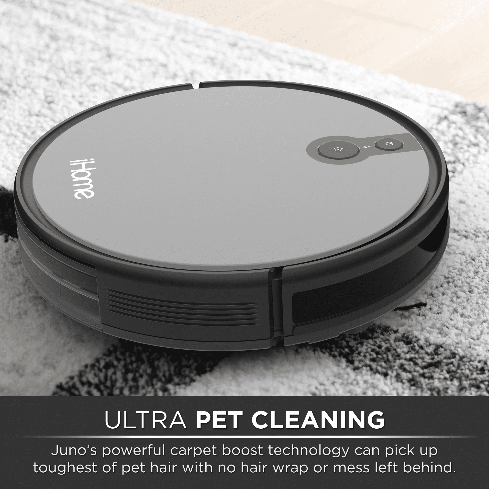 2000pa Suction Power 100 Minute Runtime Mapping Technology Cleans Row by Row Wi-Fi enabled Cleans carpets and hard floors One touch control Self Charging 3 Brush system with HEPA filter Compatible with Google and Alexa Drop Sensor built in The new iHome AutoVac Juno weighs less than 9lbs