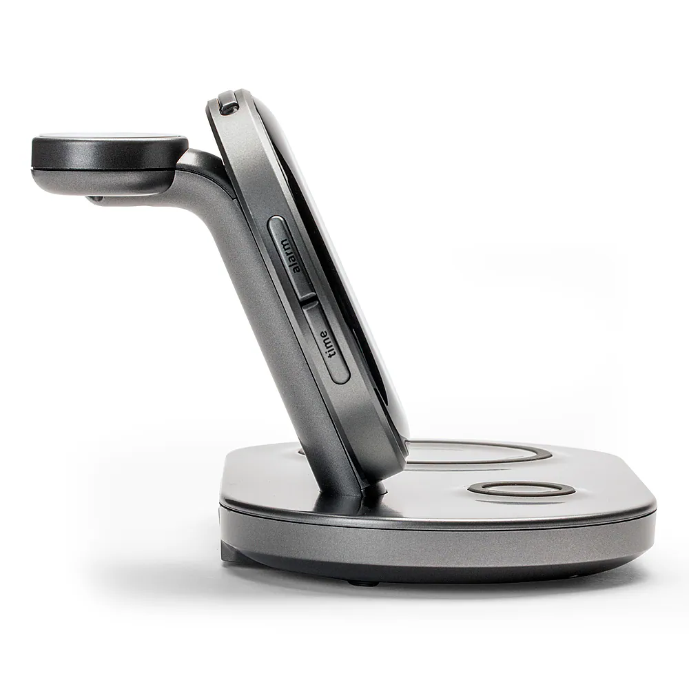 Charge up to four devices rapidly on this wireless charging alarm clock! Quickly charge your mobile device via the fast wireless charging pad (15W), and charge your Airpods via the 5W wireless charging pad. Featuring a sleek integrated Apple Watch Charger and a 5W USB port to charge an additional device. Effortlessly charge compatible smartphones on the Qi-enabled surface of this wireless charging alarm clock. This device is case-friendly and will wirelessly charge through most lightweight phone cases.