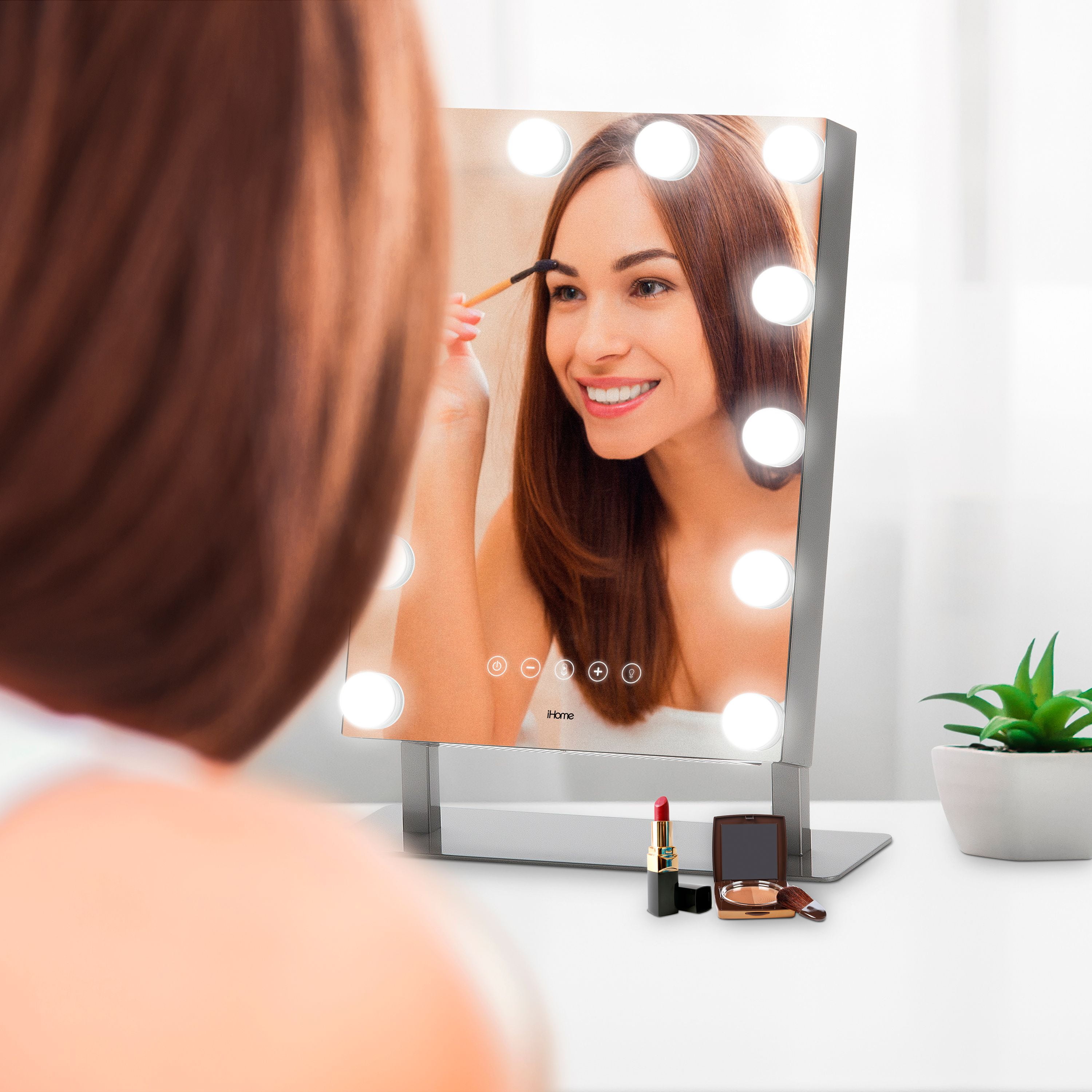 iHome iCVBT15 Bluetooth Smart Speaker, 8 W RMS, Google Assistant, Siri Supported, Silver Large, Distortion-Free: 12″ x 16″ mirror Detail Mirror: 10x magnification, removable detail mirror Full-Spectrum Lighting: 550 LUX with 4 levels of brightness Three Color Light Modes: Warm and Cool Full-spectrum Natural LED Lighting. Soft Yellow, Warm White, and Bright White. Voice Control Button: Works with Siri and Google Assistant to play music, check the weather, and more from your connected Bluetooth device. Bluetooth wireless audio: Stream digital audio wirelessly from your Bluetooth-enabled audio device Sound: Room-filling dynamic sound, Passive Subwoofer; Powerful bass for enhanced stereo sound Speakerphone: Speakerphone with digital voice echo cancellation and talk/end controls USB Charging: 2.4A USB fast charging port Audio Output: 4Wx2 watts RMS