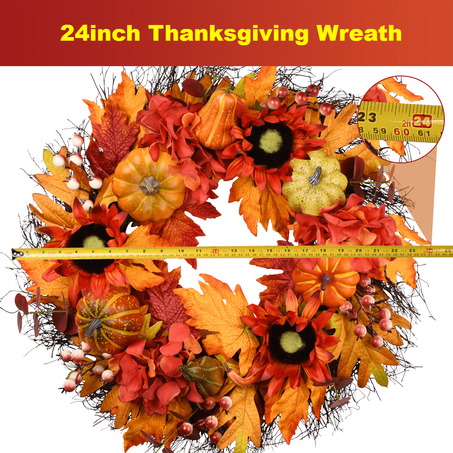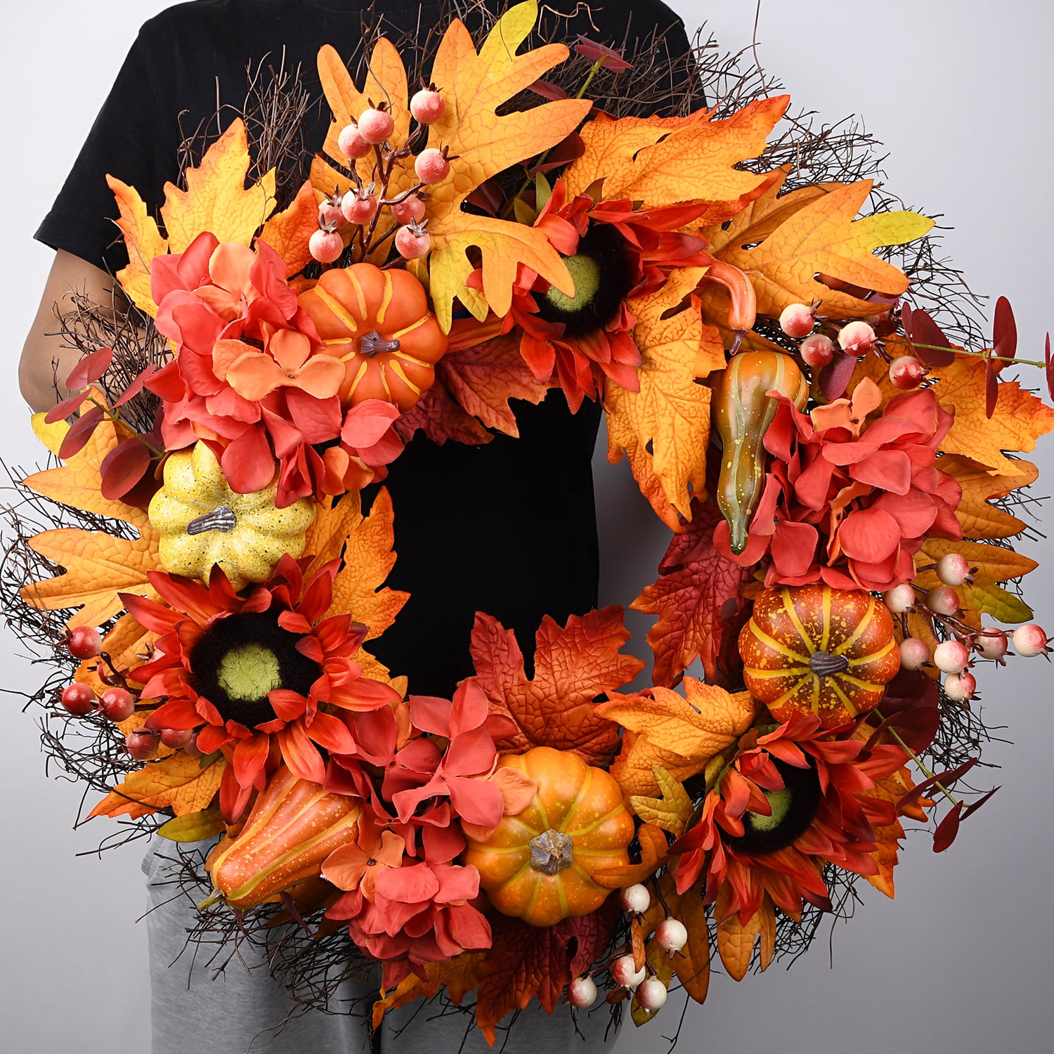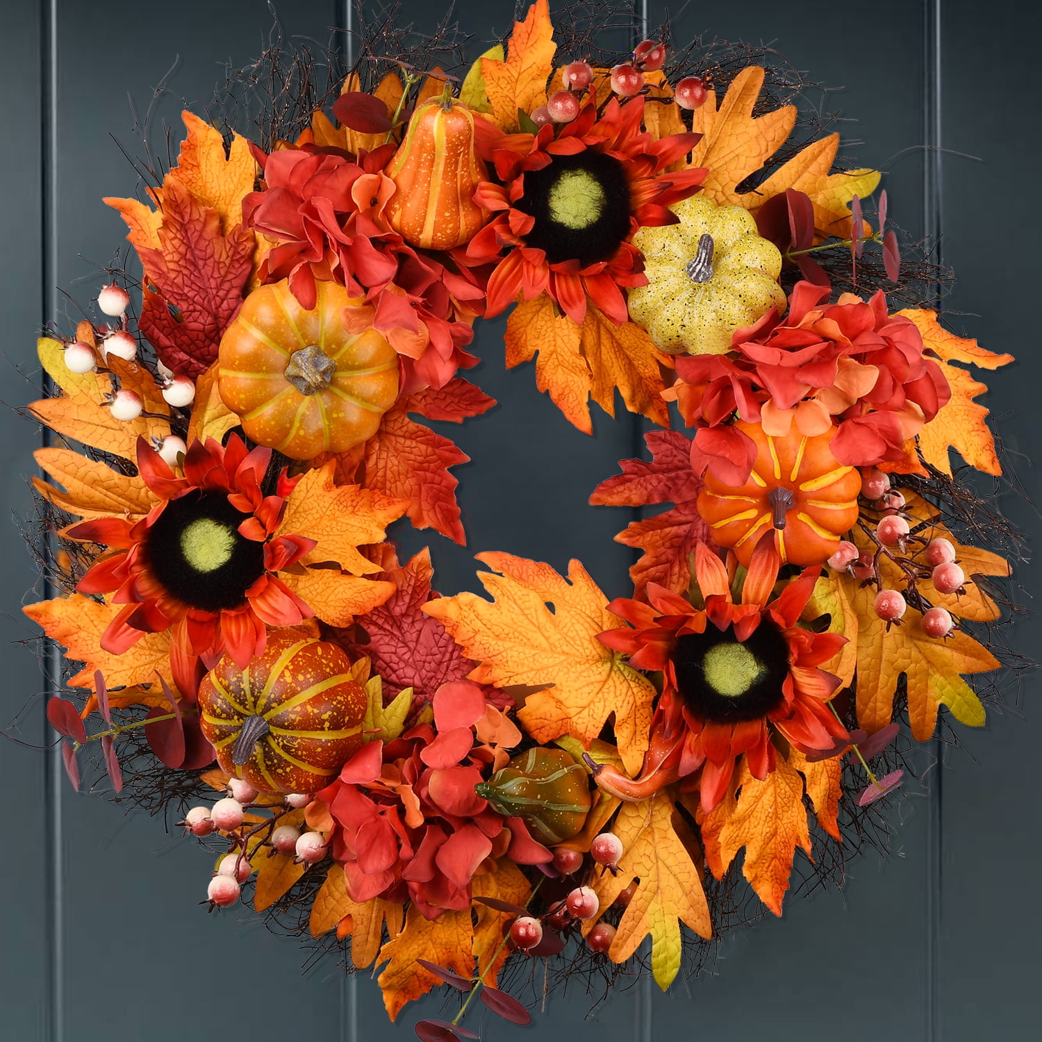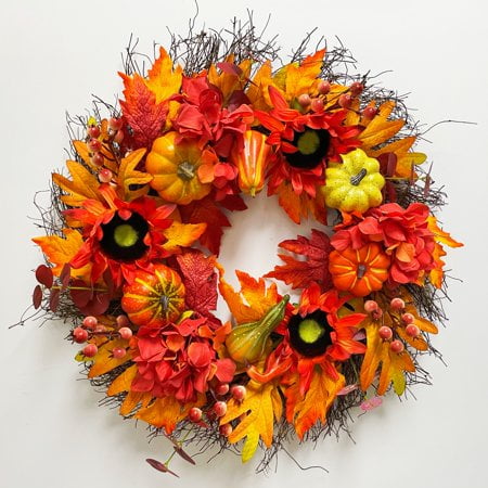 IiHeartYard 24 Inch Handcrafted Autumn Wreath, Sunflowers, Pumpkins, Berries, Maple Leaves 24-inch handcrafted wreath made of sunflowers, berries, pumpkins, and colorful maple leaves on a natural grapevine base Perfect size for front doors, indoor and outdoor spaces, walls, windows, fireplaces, or above the mantle Creates a warm and inviting welcome for family and friends Ideal for Thanksgiving and Halloween celebrations Well packed in a durable box, making it a great gift for friends and family