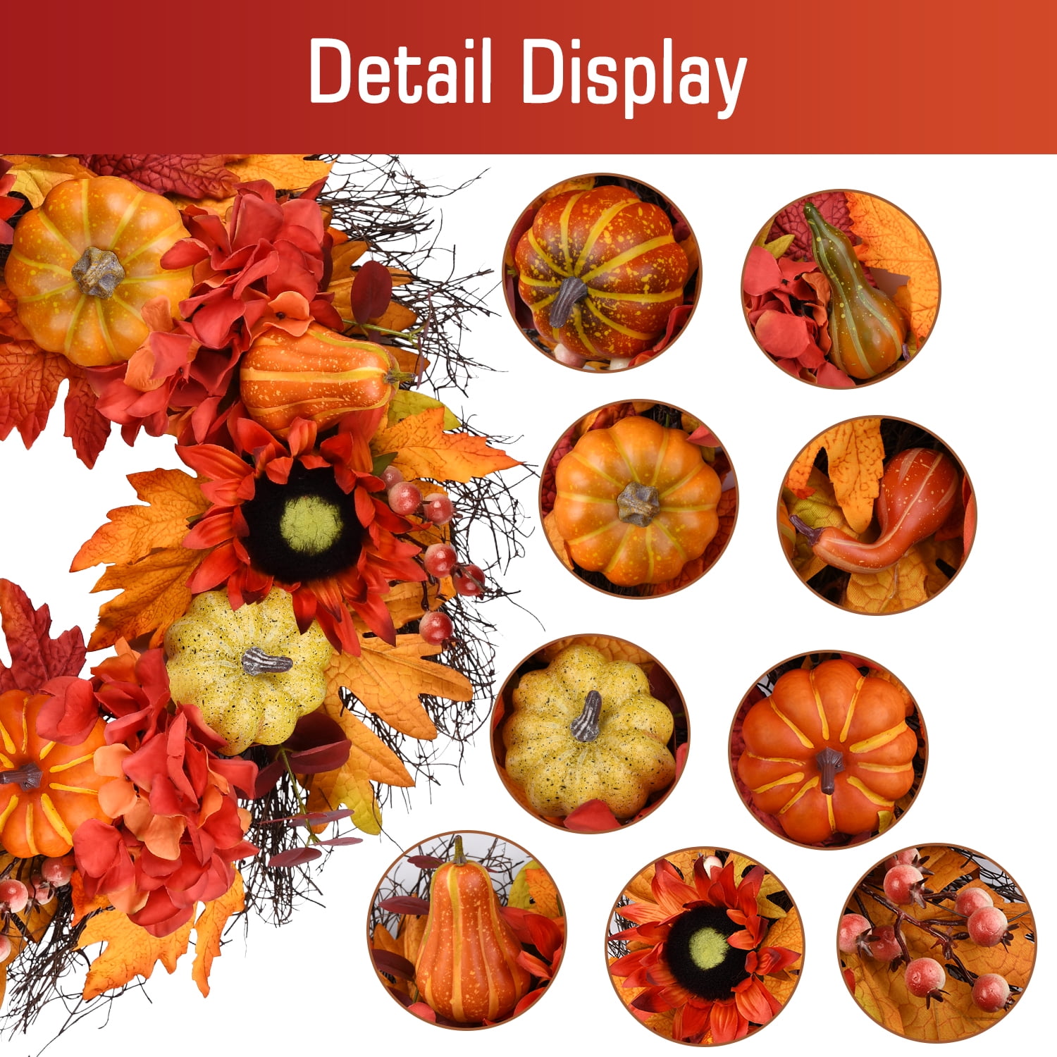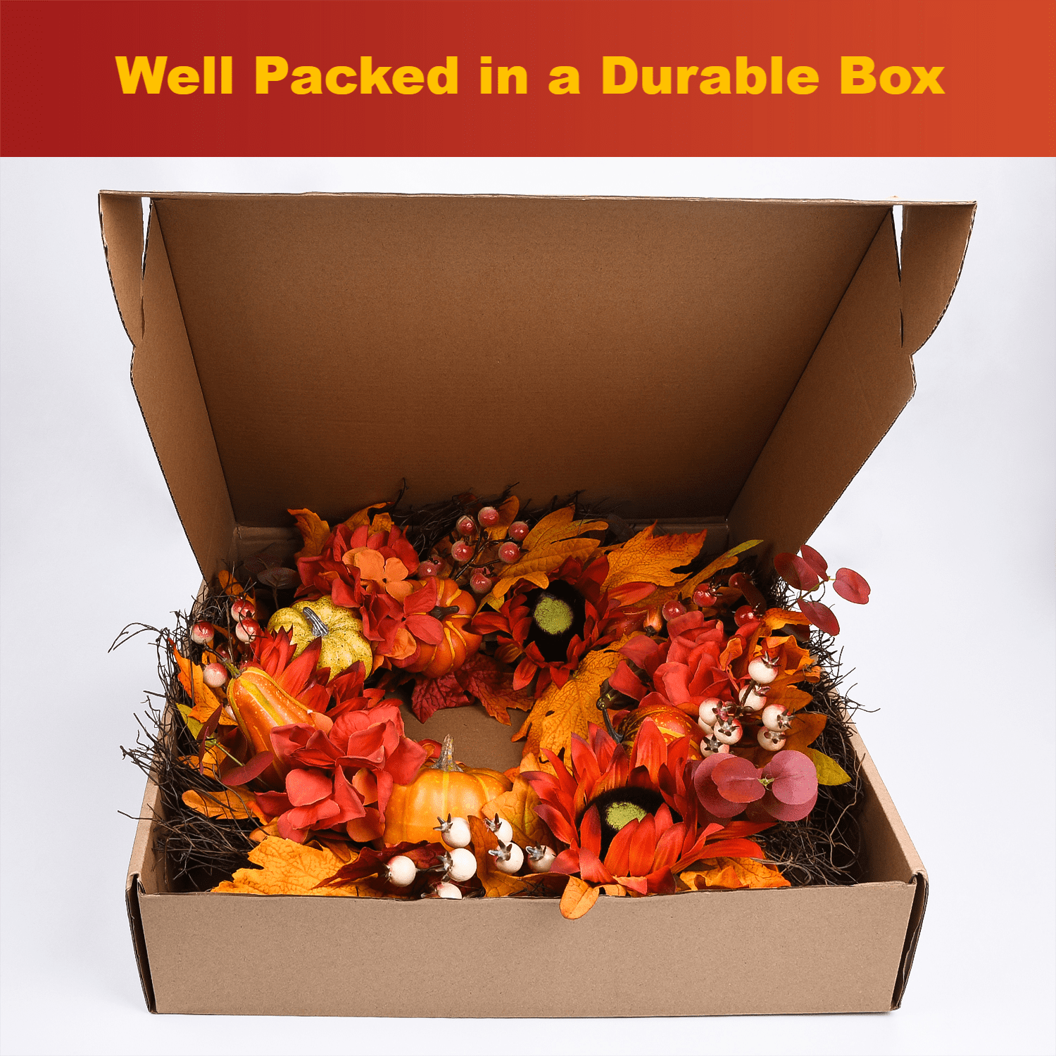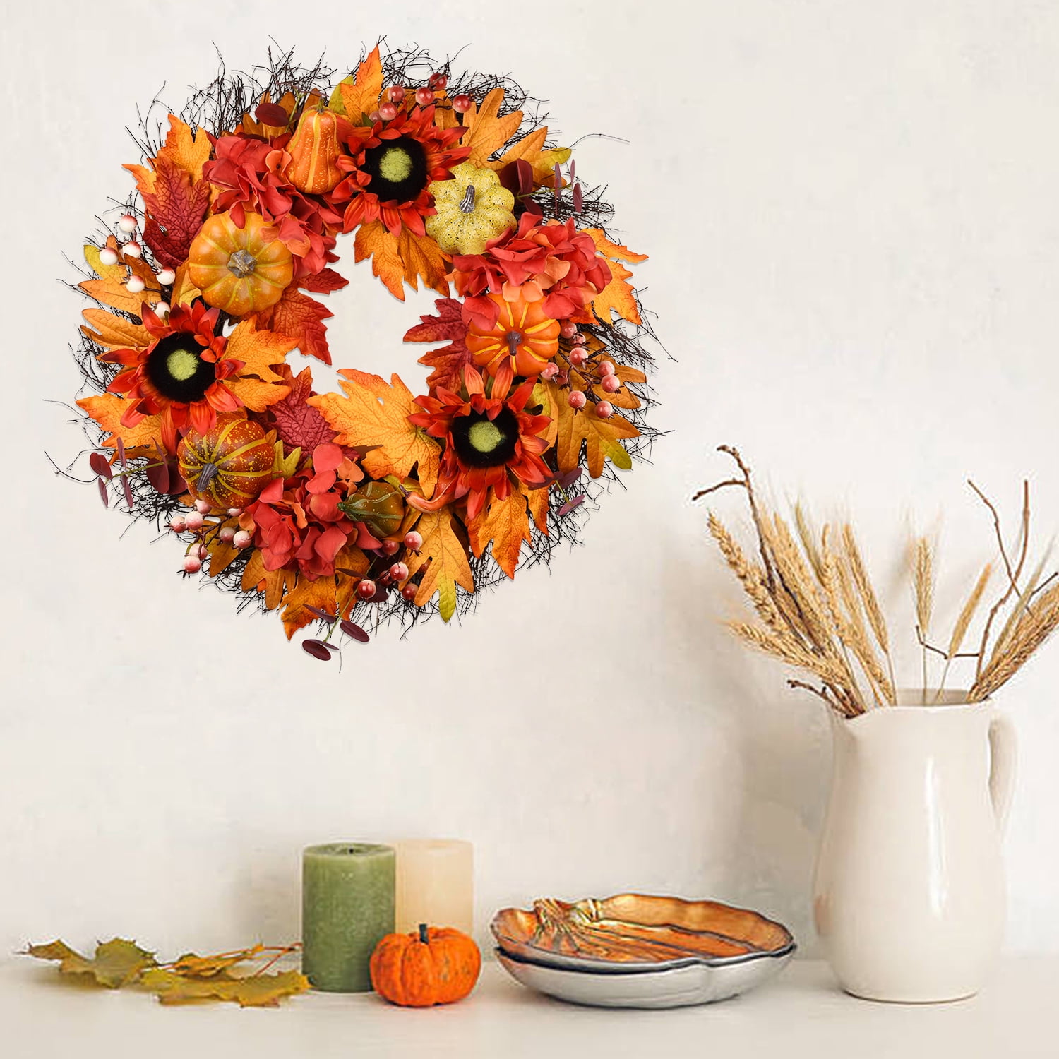 IiHeartYard 24 Inch Handcrafted Autumn Wreath, Sunflowers, Pumpkins, Berries, Maple Leaves 24-inch handcrafted wreath made of sunflowers, berries, pumpkins, and colorful maple leaves on a natural grapevine base Perfect size for front doors, indoor and outdoor spaces, walls, windows, fireplaces, or above the mantle Creates a warm and inviting welcome for family and friends Ideal for Thanksgiving and Halloween celebrations Well packed in a durable box, making it a great gift for friends and family