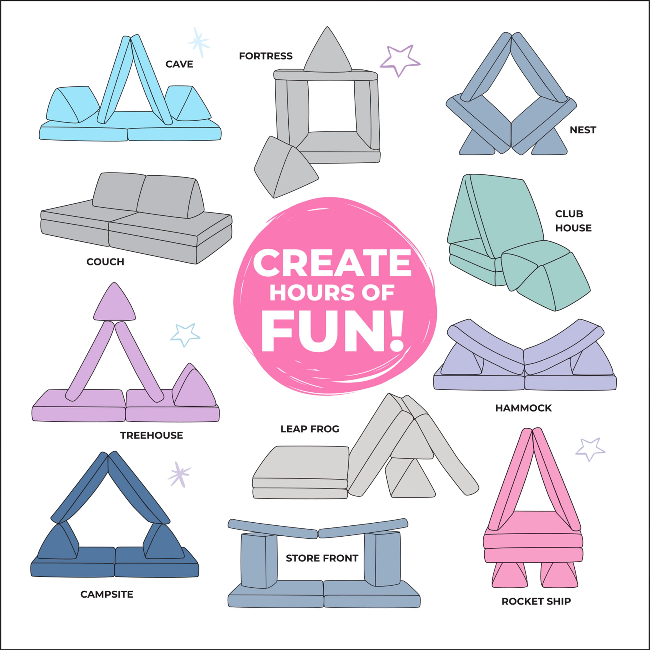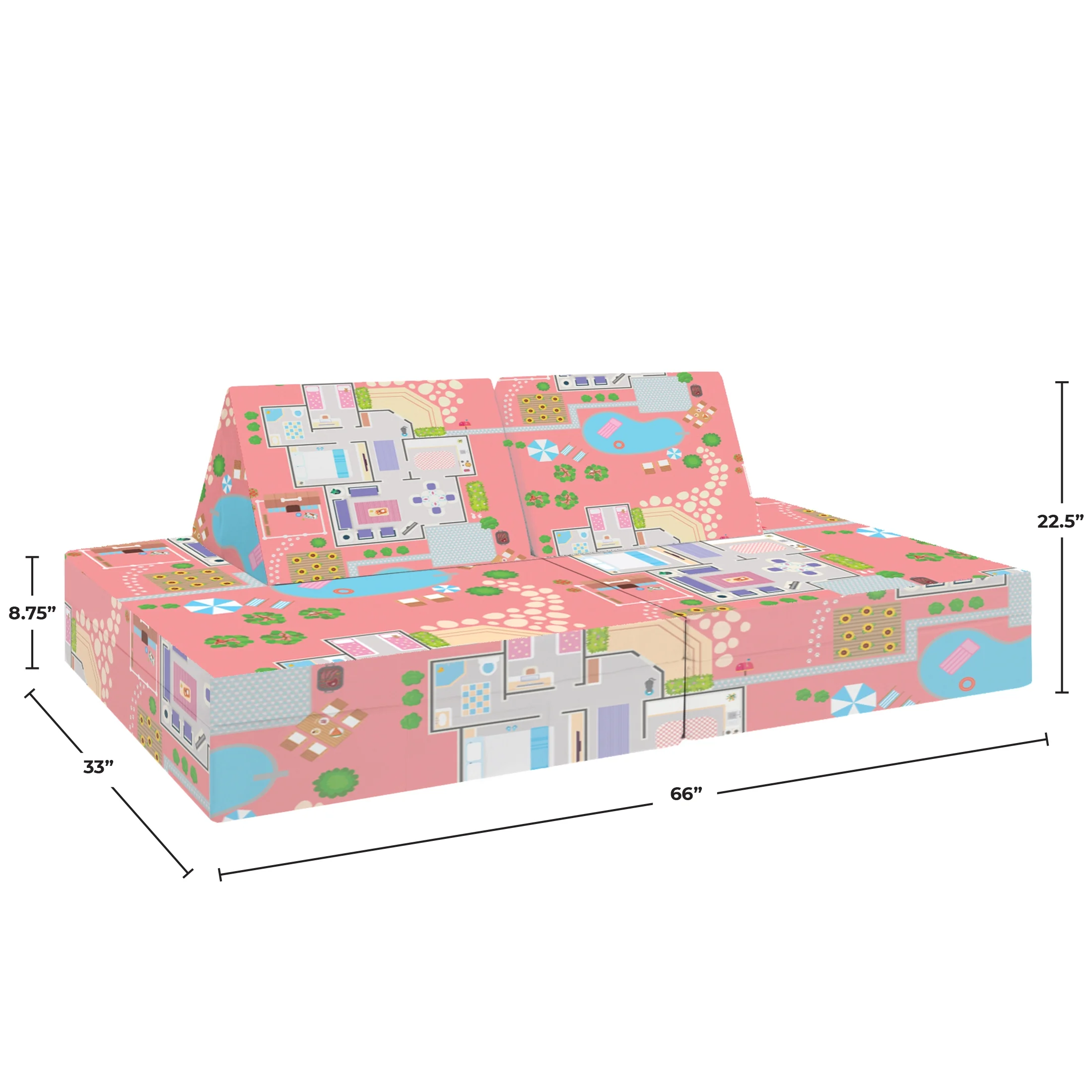Say hello to the Imaginarium Kids and Toddler Play Couch – a furniture and active play set made with FUN in mind! With four pieces of premium high-density foam, the Imaginarium Kids and Toddler Play Couch can be assembled any way you like! The Imaginarium Kids and Toddler Play Couch contains a base layer, comfort layer and two triangles that are sturdy and durable for creators of all ages. The base and comfort layers have handles and fold in half, making them easy to carry and store. There is also a stash pocket for easy storage for handheld games, controllers and books! The microfiber cover is removeable and machine washable for easy care. The Imaginarium Kids and Toddler Play Couch comes rolled and compressed for easy set-up and delivery. Simply remove the plastic and watch it expand to full size right before your eyes! Let your little one’s imagination soar with the Imaginarium Kids and Toddler Play Couch.