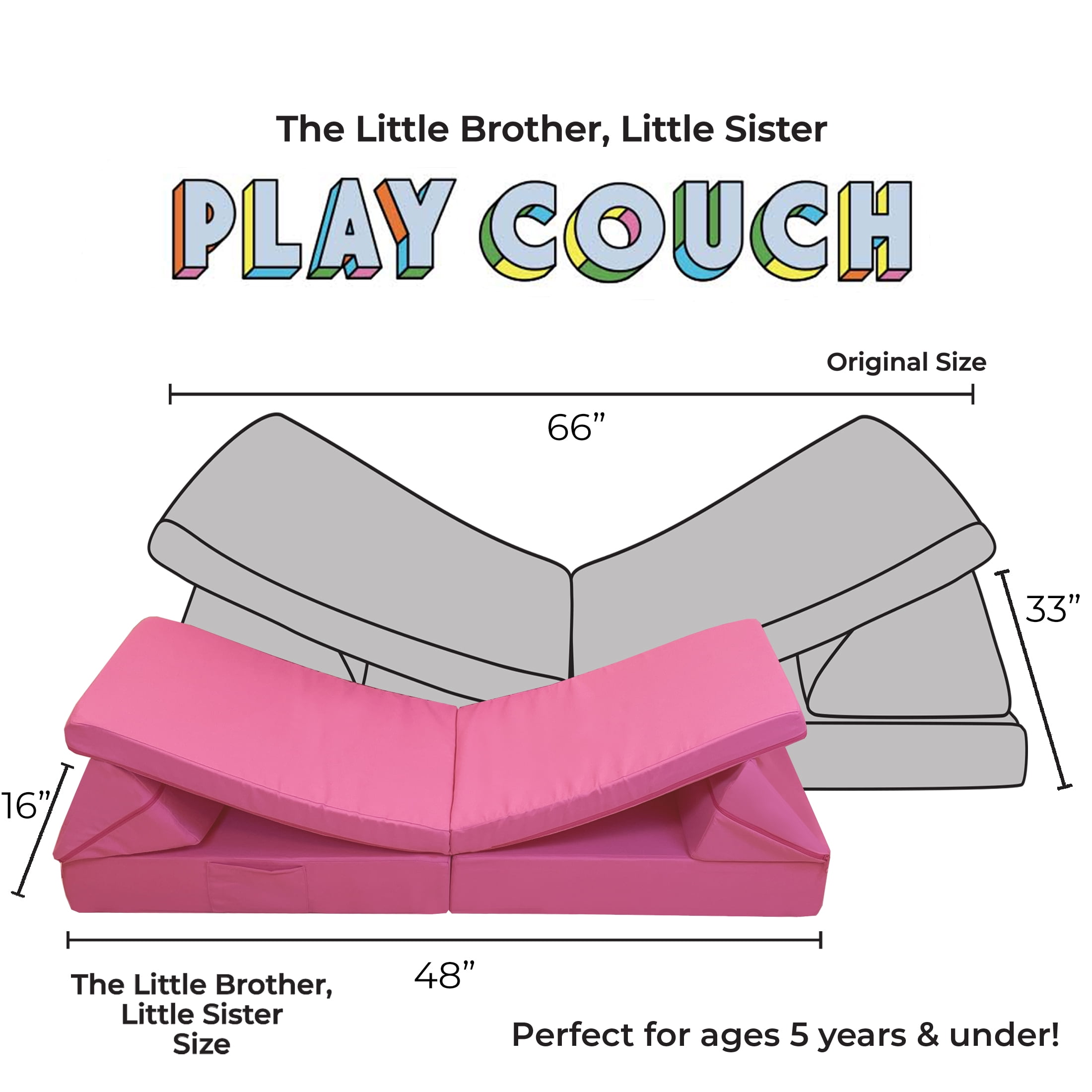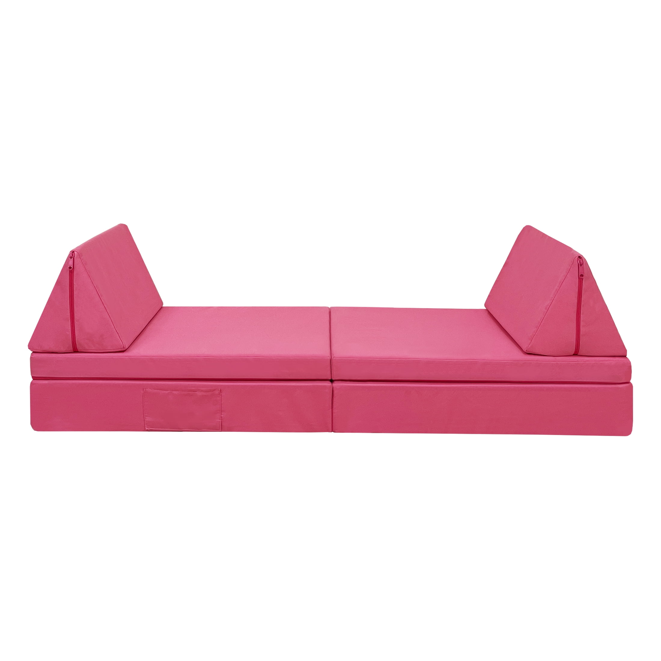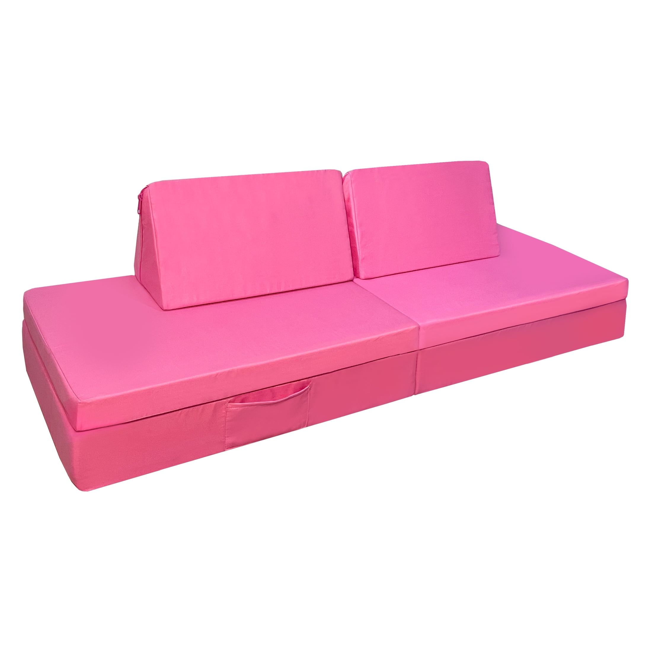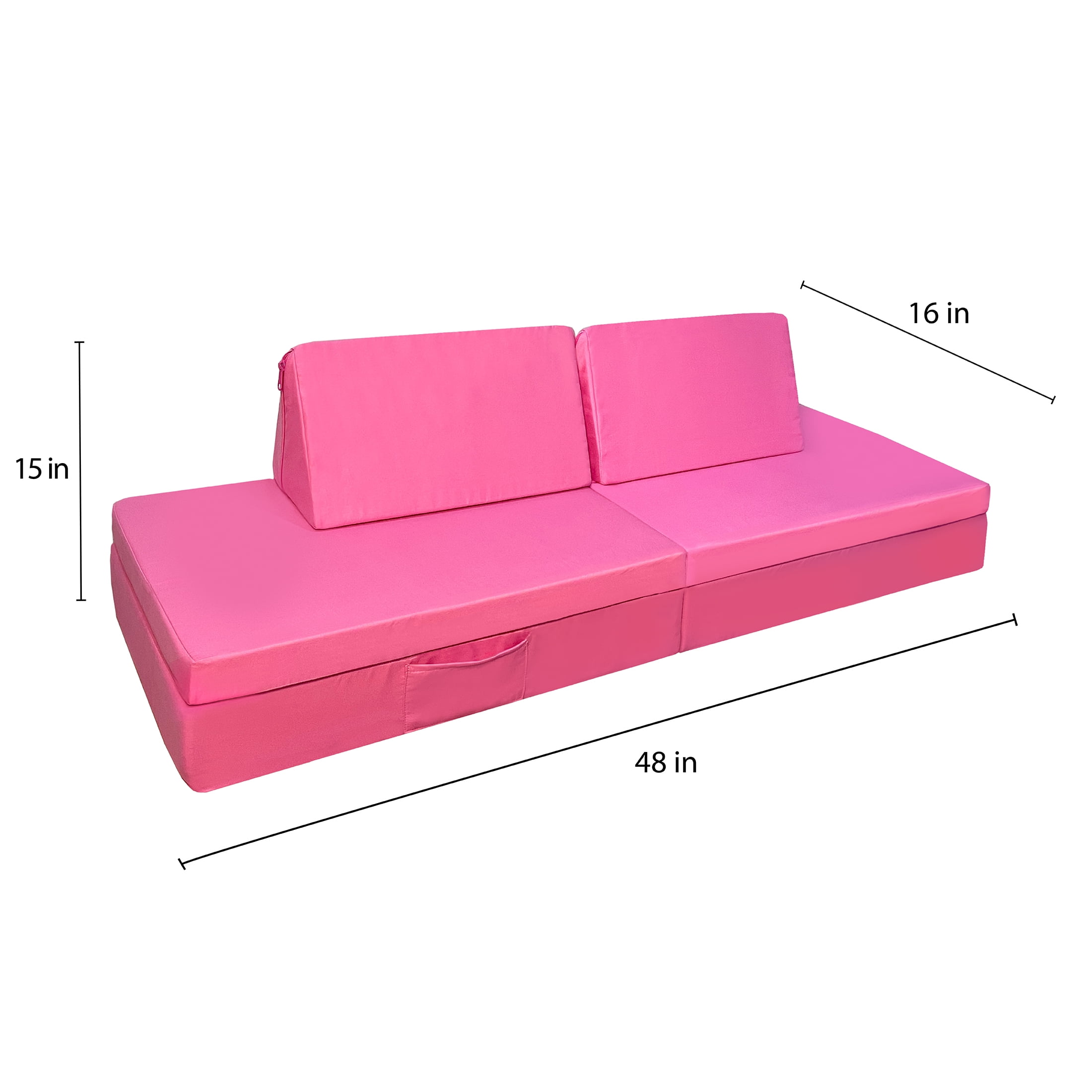 Say hello to the Imaginarium Kids and Toddler Play Couch – a furniture and active play set made with FUN & storage in mind! Portable, easy to fold and store , and offering endless possibilities and a must-have for imaginative playtime fun! With four pieces of premium high-density foam, the Imaginarium Kids and Toddler Play Couch can be assembled any way you like! The Imaginarium Kids and Toddler Play Couch contains a base layer, comfort layer and two triangles that are sturdy and durable for creators of all ages. The base and comfort layers have handles and fold in half, making them easy to carry and store. There is also a stash pocket for easy storage for handheld games, controllers and books! The microfiber cover is removeable and machine washable for easy care. The Imaginarium Kids and Toddler Play Couch comes rolled and compressed for easy set-up and delivery. Simply remove the plastic and watch it expand to full size right before your eyes! Let your little one’s imagination soar with the Imaginarium Kids and Toddler Play Couch.