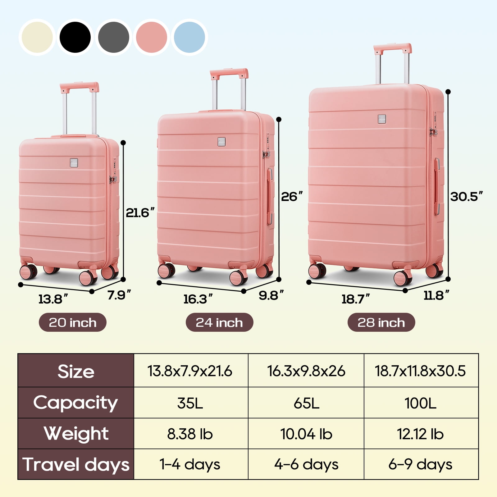 1. SUPER AFFORDABLE LUGGAGE SET: We provide you with 3pcs suitcase. Luggage set includes 3 pieces of luggage, 1 travel bag and 1 toiletry bag. 2. Suitcase with swivel wheels: We provide you with a smooth and silent 360° double wheel design. Our 3 piece luggage set for women will take you anywhere. 3. Large Capacity Luggage Set: The rolling luggage set gap provides you with a larger capacity expandable travel bag. The pink shell and pink zipper of the hardshell suitcase make it even more beautiful. 4.TSA Lock Included: Your suitcase sets with wheels and TSA lock means safe when you are in travel. The rolling suitcase set provides security when checked belongings. 5.What You Get: We provide 24-hour worry-free service for travel luggages set clearance, We are right here and reply you as soon as possible within 24 hours for your lightweight luggage set.