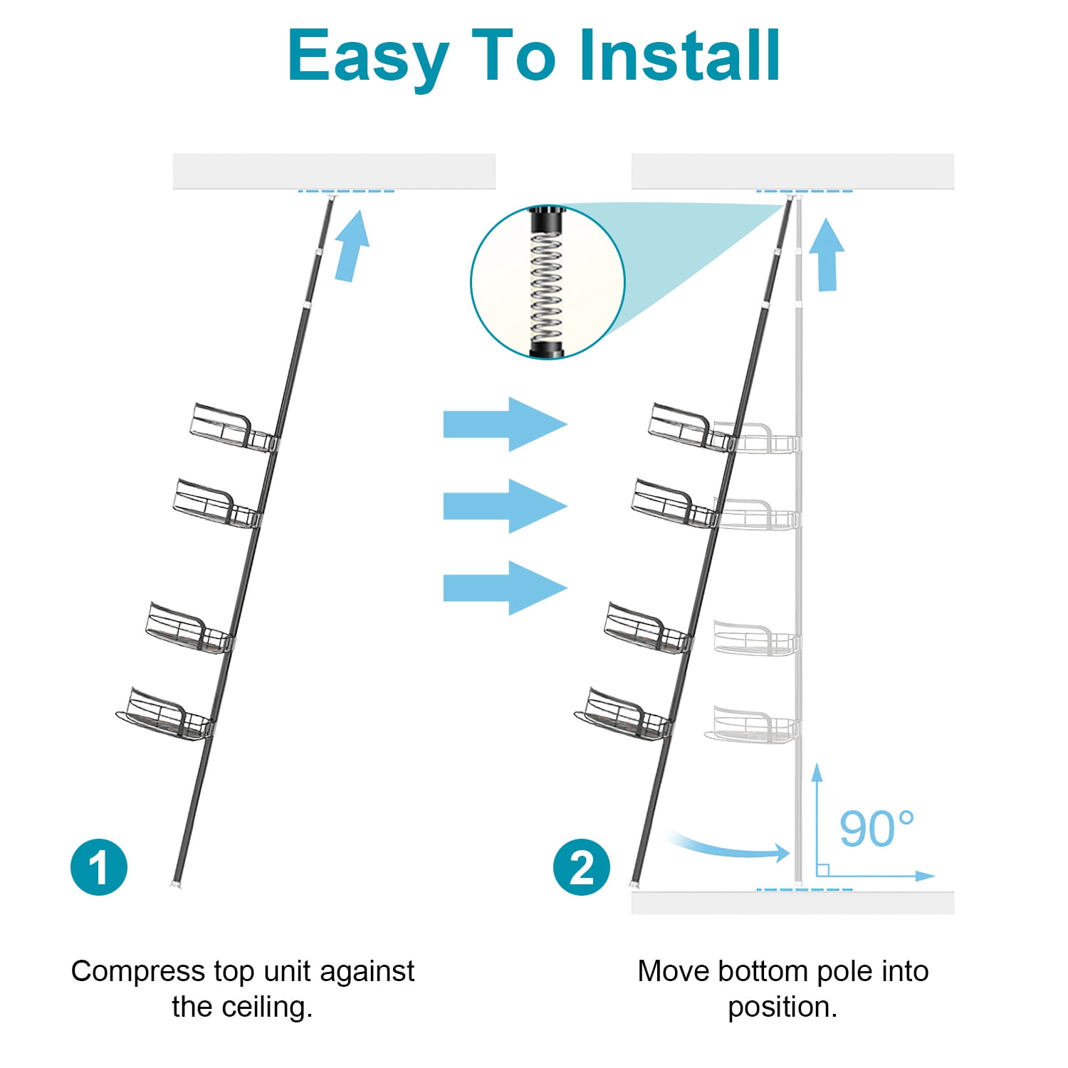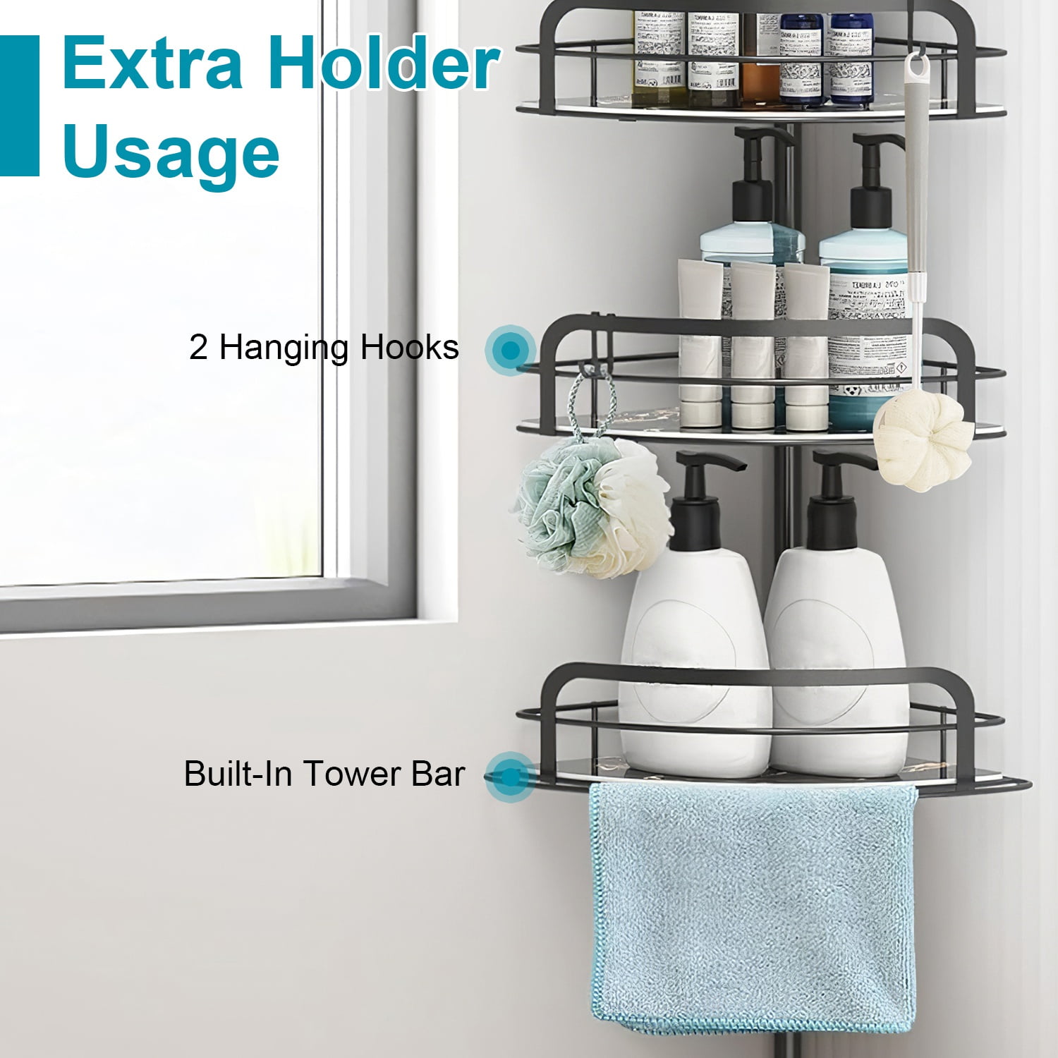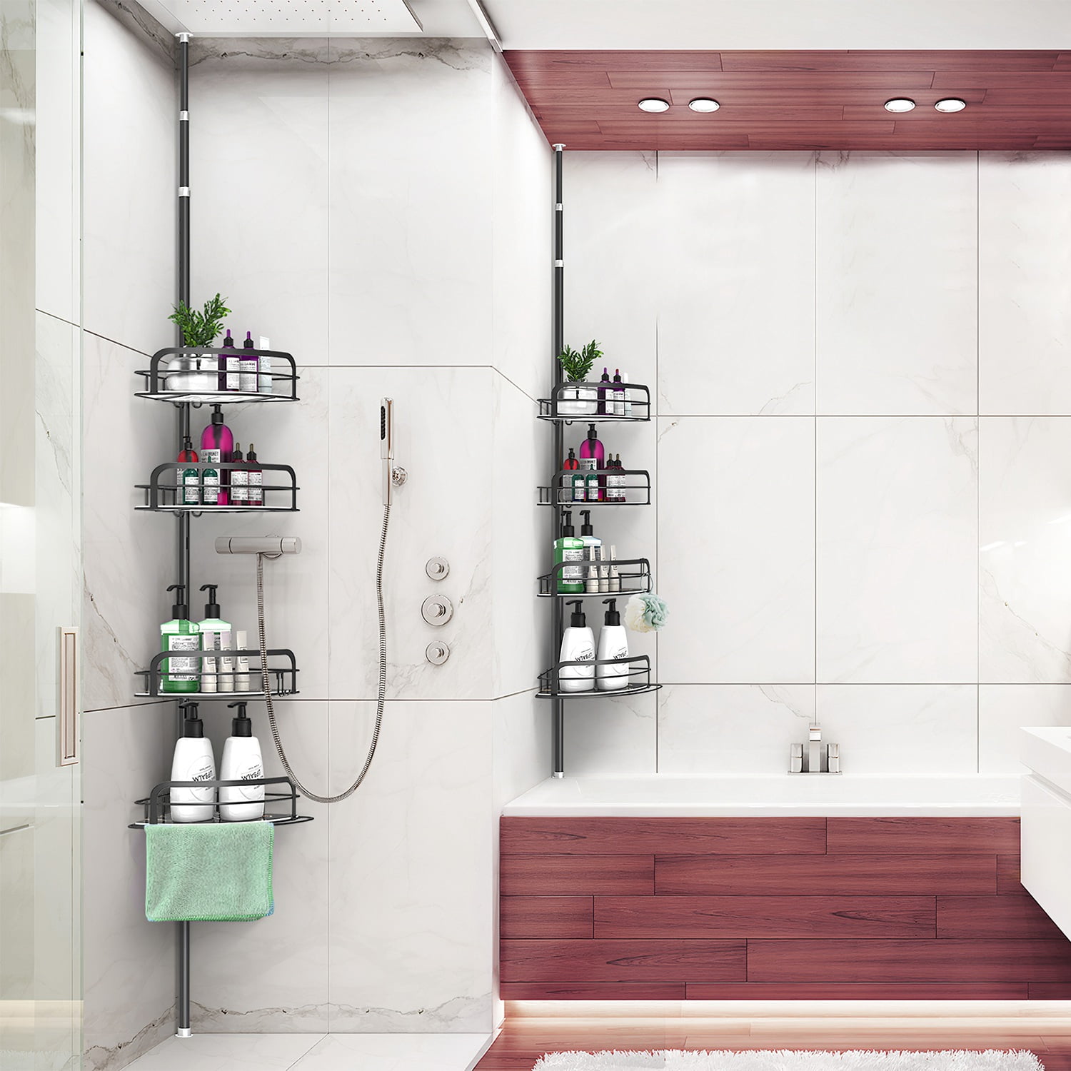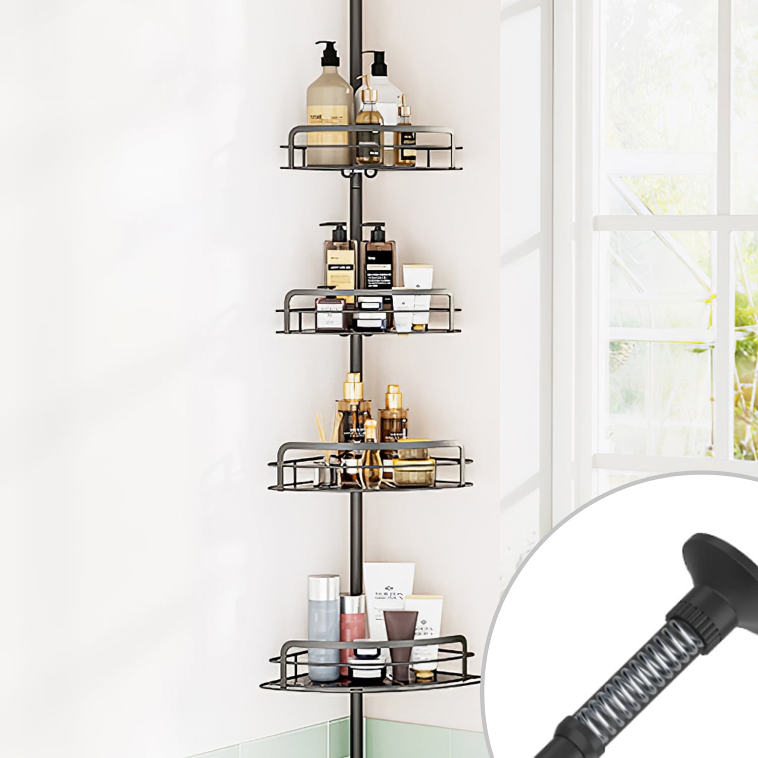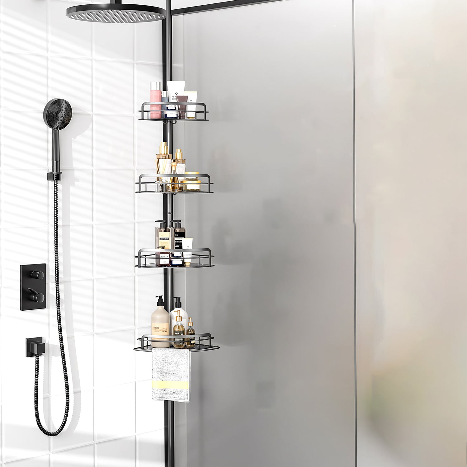 Space-Saving Corner Design: The floor-to-ceiling corner shower caddy maximizes storage space in often-neglected corners, keeping bathroom essentials neatly organized. It’s also versatile for use in kitchens, closets, bathtubs, RVs, and more. Versatile 4-Shelf Storage: The shower caddy features 4 shelves of varying sizes, each with a 11lb weight capacity. The shelves provide ample room for shampoo, conditioner, body wash, and more. Plus, a towel bar and removable hooks offer extra storage for towels, razors, loofahs, and other accessories. Adjustable Height for All Showers: The standing corner shower caddy adjusts from 8.66in to 116.14in, fitting perfectly in high-rise apartments or low-rise residences. The fully adjustable baskets can be moved up or down to accommodate taller bottles, ensuring optimal storage and accessibility. Rustproof & Sturdy Construction: Made from 1.9MM rust-resistant carbon steel pipes, the shower shelf is robust and durable for long-lasting use. Soft anti-slip rubber caps provide stability without damaging floors or ceilings. The hollow design of the placement plates allows for easy cleaning. Quick & Easy No-Drilling Installation: The tension-based installation requires no drilling, making setup quick and simple. Accessories are individually packaged to prevent scratches, ensuring a smooth and hassle-free installation process. Package includes: 1x 16mm Upper Rod; 1x 19mm Rod With Spring; 1x 22mm Connected Rod; 3x 22mm Rods; 1x 22mm Bottom Rod; 1x L Size Shelf With Plate; 1x M Size Shelf With Plate; 2x S Size Shelves With Plates; 4x Connected Caps; 2x Hooks; 1x User Manual