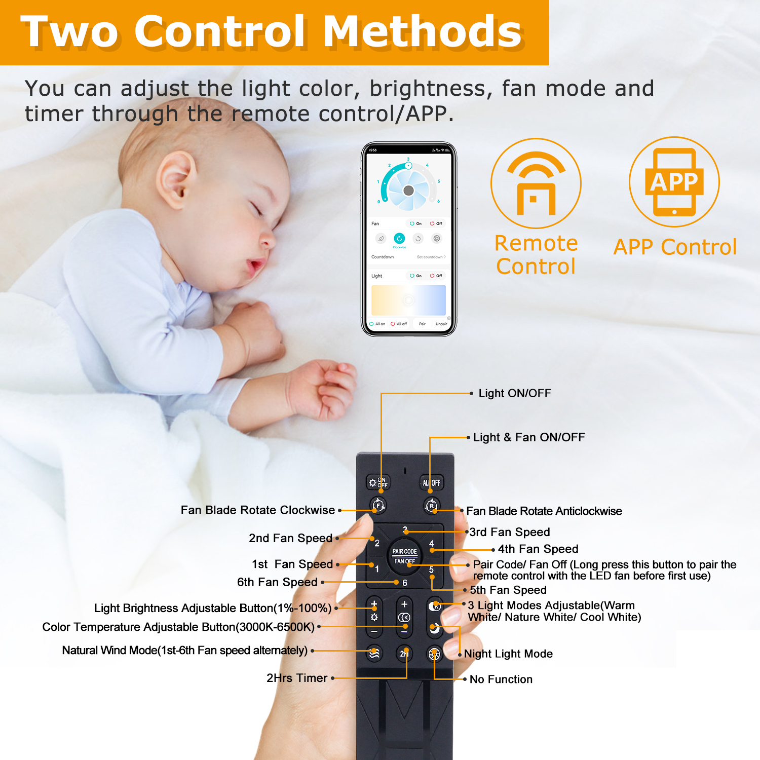 This 2-in-1 ceiling LED fan is a must-have in your home in summer and take care of your family! You can easily adjust 6 fan speeds, 3 light colors including cool white, nature white and warm white, LED brightness and timer through the handheld remote control or via phone APP, which is super convenient and considerate. Perfect for kitchens, bedrooms, leisure areas, baby care rooms, living rooms, attics, cloakrooms, farmhouses and other places that require air circulation.