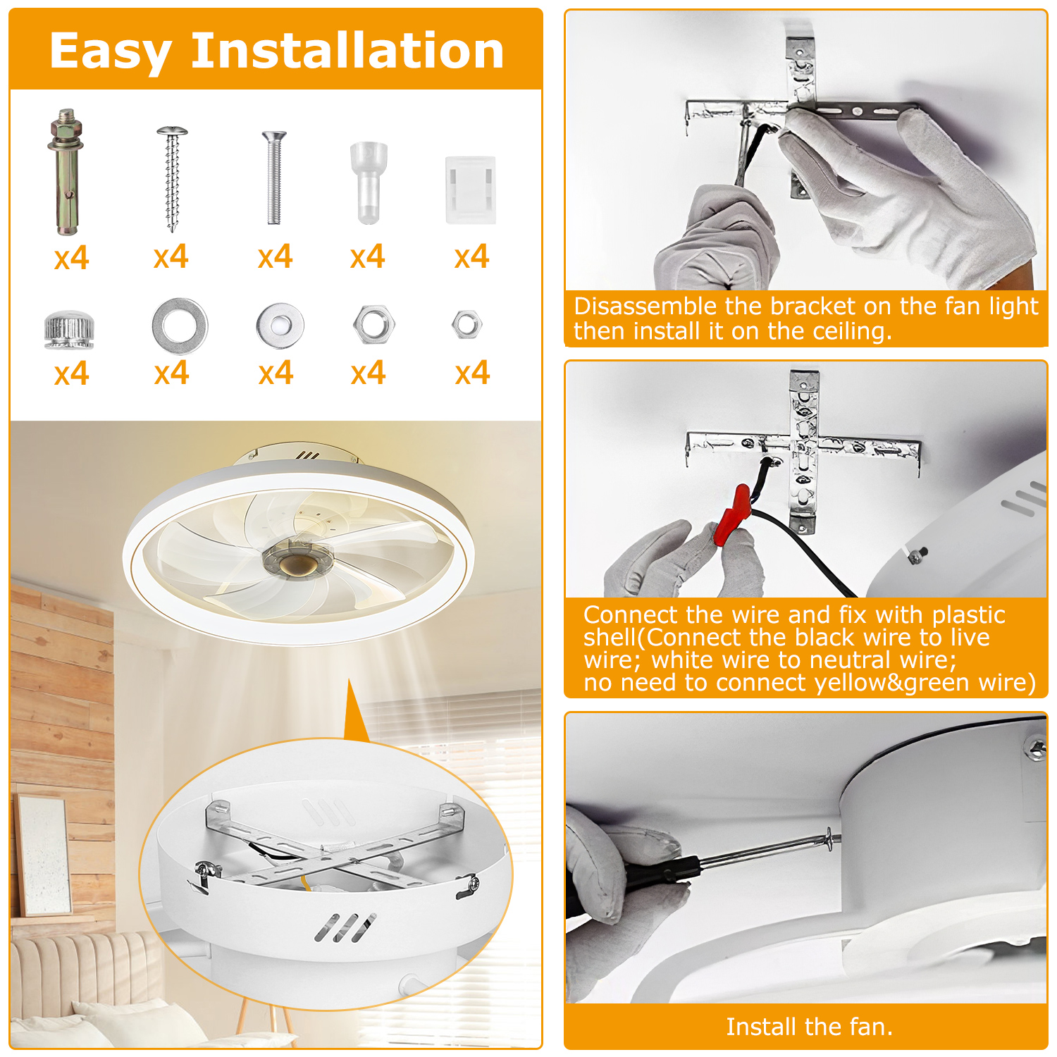 6 Fan Speeds Adjustment & Reversible Mode: Equipped with 6 fan speeds, this LED fan provides you endless coolness for you and your family in different seasons and in environment with different temperature. You can also switch to reversible mode(air blows to the ceiling) to enhance air flow, with no need to blow yourself. Natural fan mode which automatically switches from 1st gear to 6th gear alternately, offers you natural cooling. Simply adjust the most comfortable fan mode according to your personal needs. Adjustable Light Color & Brightness: This ceiling fan with lights has 3 color temperatures including 6500K cool white, 4500K nature white and 3000K warm white, which can meet your different light requirements in your life. You can also slightly adjust the light color from 3000K to 6500K according to your personal needs. You can also easily adjust the brightness from 10% to 100%, which is energy-saving and environmentally-friendly. Two Control Methods: You can adjust the light color, brightness, fan speed, fan mode and timer through the handheld remote control or via the phone APP. Remember to long press the “PAIR CODE” button on the remote control to pair the controller and the LED Fan before first use. Timer Function: Blowing too long time is harmful to our health. This smart timer function can avoid this situation. Once you choose 2H on the remote control, both the light and the fan will auto turn off when it reaches the preset time. You can also set 1minute to 23hours and 59minutes timer on the APP freely, which provides a comfortable sleeping environment for you! Easy Installation: Simply connect the black wire to the live wire and the white wire to the neutral wire to power the LED fan. Yellow&green wire is no need to connect. Disassemble the bracket on the back of the fan then install the bracket on the ceiling and connect the fan to the bracket, then finish installation.