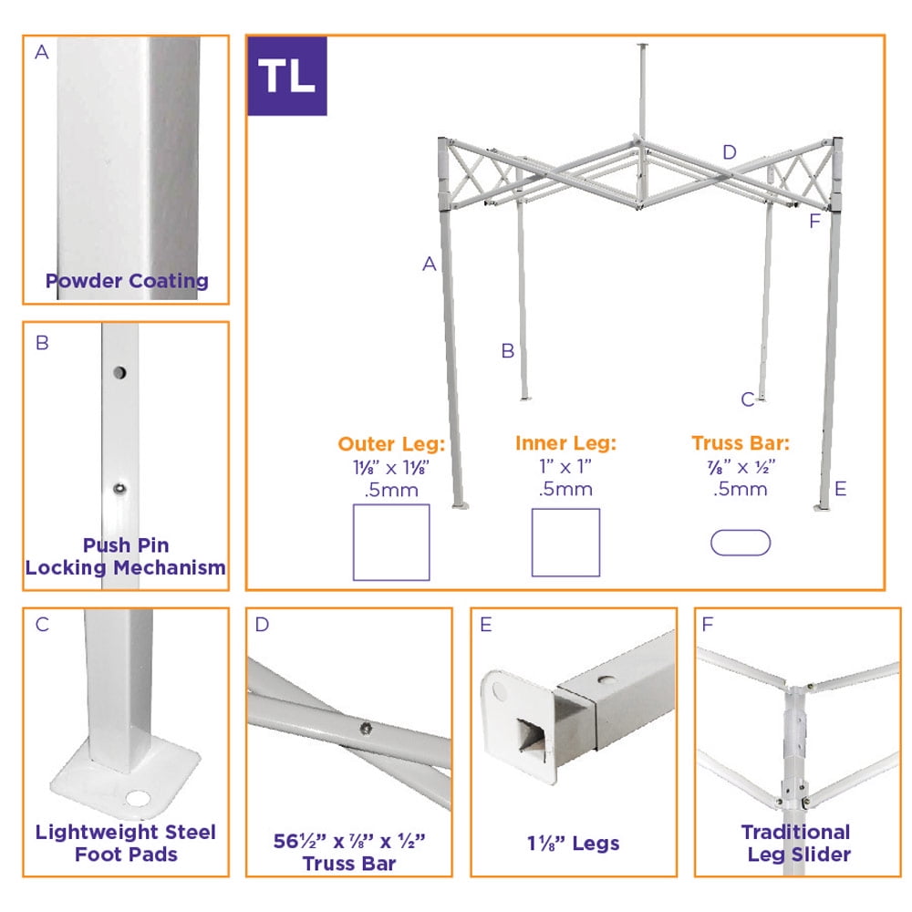 INSTANT CANOPY TENT: Recreational grade straight leg steel frame outdoor pop up 10 x 10 canopy tent INCLUDES: 10 x 10 canopy top, 2 20’ wide white mesh zipper sidewalls to wrap around the 10×10 canopy frame, roller bag and a spike and rope kit QUICK AND EASY SET UP: No tools required, canopy frame and canopy accessories are included for easy setup and take down, canopy tent top and white canopy sidewalls are easily attached with the Velcro straps SPECIFICATIONS: 210D fire retardant canopy tent cover meets CPAI 84 fire code and is water resistant, 20’ white mesh canopy walls protect your family and friends from sun, wind, rain and bugs WARRANTY: 6 month limited warranty on canopy frame and 1 year limited warranty on sidewalls. (weather damage is not covered under warranty)