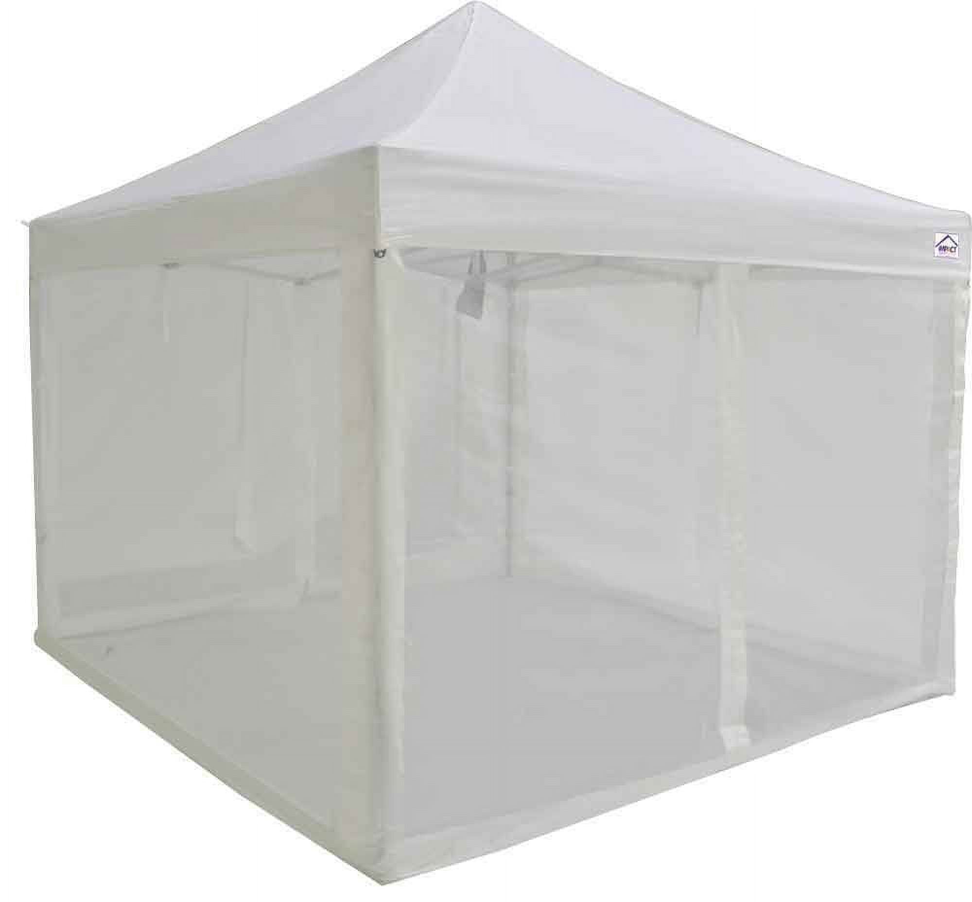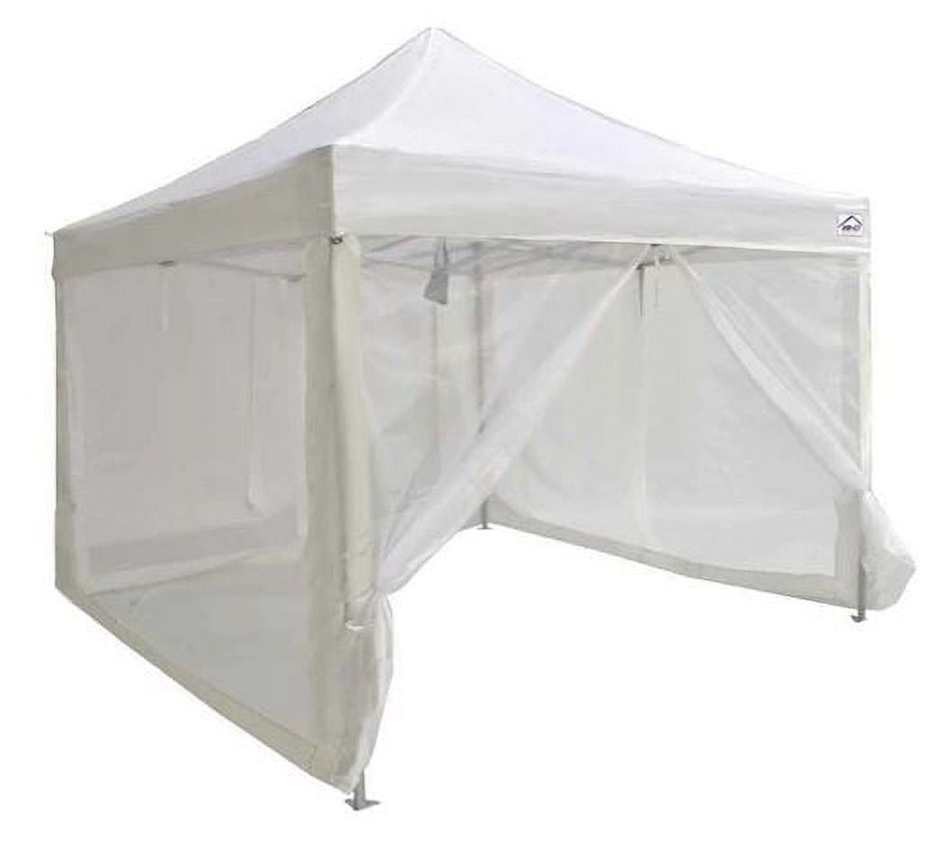 Instant Canopy 10×10 Canopy with White Mesh SidewallsThis convenient beach shelter/gazebo is perfect for your backyard, sun/shade at the beach, ball games, tailgating or sitting outside enjoying the beautiful evening free of bugs with the included mesh screen walls. Features: Unique push-button height adjustment Mesh sidewalls feature Velcro for easy attachment The top is made from 210 weight denier fire retardant and water-resistant fabric Includes canopy frame, roller bag, sidewalls and full spike and rope kit Recreational grade steel frame Please Note: This canopy is NOT to be left unattended as it is considered a temporary shelter! If there is inclement weather, you should take your canopy down immediately. Any rain and winds over 10-15 MPH will damage your canopy. Water that collects on the canopy top will also destroy the structure of your canopy. We advise you to never leave your canopy up overnight and unattended under inclement weather conditions. We will not be held responsible for ANY weather damages. It is to the customer’s best judgment in determining the best weather conditions for your canopy.