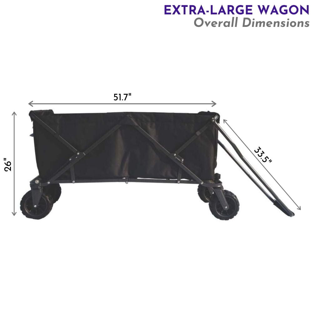NO ASSEMBLY REQUIRED: Collapsible wagon sets up and folds down in seconds for ease of use and convenience DURABLE CONSTRUCTION: Utility cart wagon is made of 600 denier polyester MULTIPLE USES: Collapsible wagon utility cart is great to have on hand when hauling gear for camping, sporting events, outdoor concerts, and gardening EASY STORAGE: Collapsible wagon folds down to approximate down to 34.4-inches L x 8.9-inches W x 26-inches H for easy storage in your car or in your house CAPACITY: Measures 51.7-inches L x 24.4-inches W x 26-inches H when open and carries up to 175 pounds