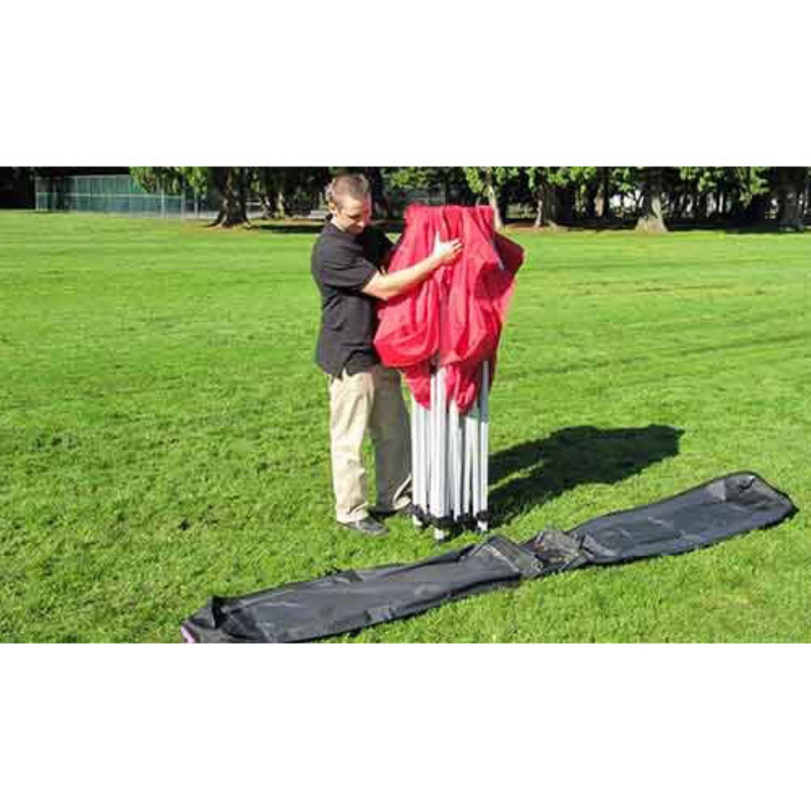 DURABILITY: Roller bag is constructed of high strength 600 denier polyester with a scuff resistant and water proof finish. UNIVERSAL SIZE: Impact Canopy roller bag will fit most instant canopies, pop up shelters and tents. FEATURES: Two oversized storage pockets on side to carry accessories. Strong nylon wheels allow bag to roll easily on most surfaces. Drawstring closure on top ensures contents are transported securely. INTERIOR BAG DIMENSIONS: 62.5″ x 10″ x 10.5″ WARRANTY: Impact Canopies guarantees this product’s workmanship and material quality for six months from the date of purchase, assuming normal use.