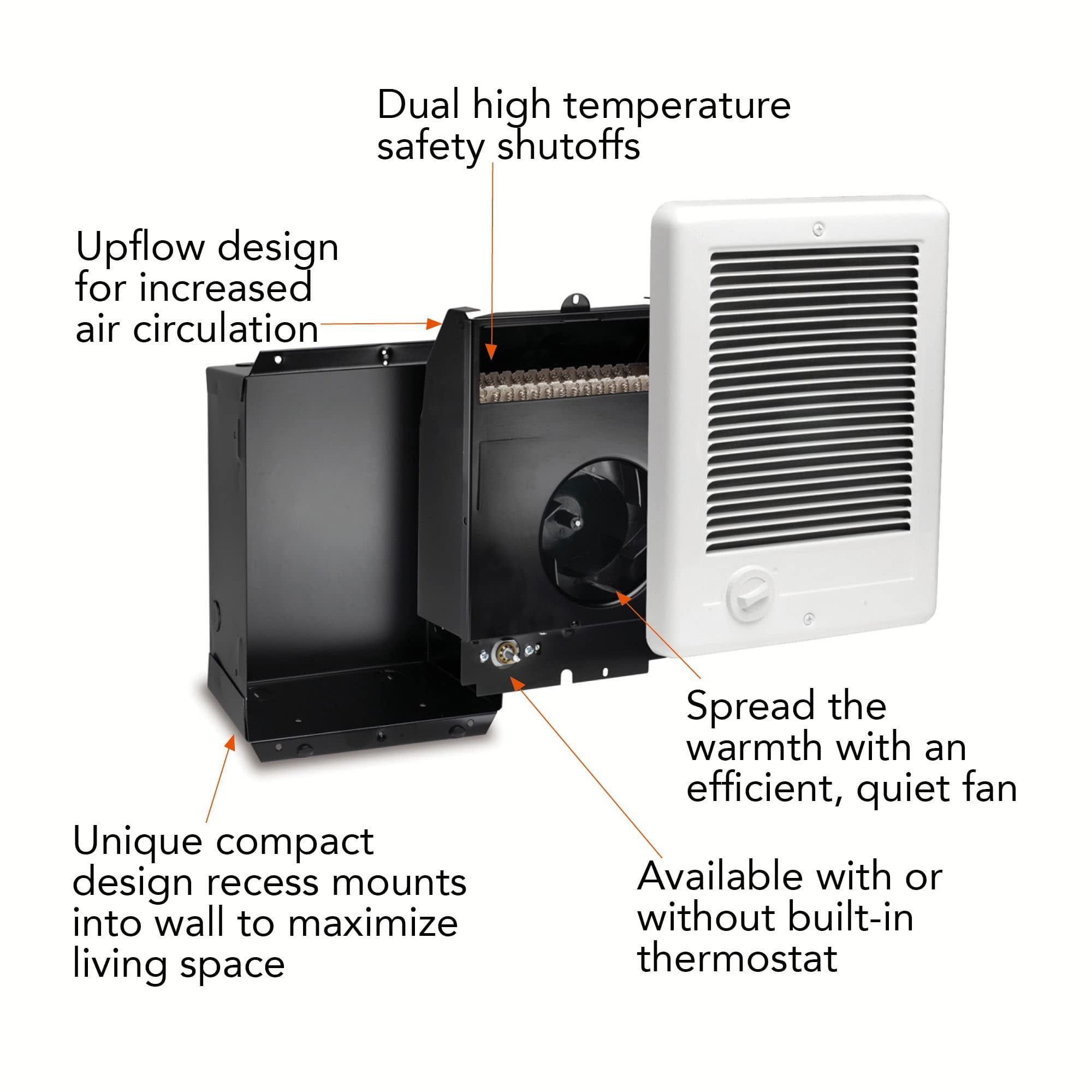 Warm up in a hurry with a fast-heating coil element Spread the warmth all around with an efficient, quiet fan Rest safe and easy-safety features turn heater off if normal operating temperatures are exceeded Enjoy trouble-free use thanks to durable, reliable design Powder coating is designed to eliminate sharp edges while providing a durable finish Unique compact design recess mounts discreetly into the wall to maximize your living space Complete unit includes a wall can, heater, grill and thermostat for hard-wired installation into your wall Thermostat temperature range: 40AdegF – 85AdegF Thermostat is in low position when the knob is turned completely counterclockwise (complete units without a built-in thermostat are also available)