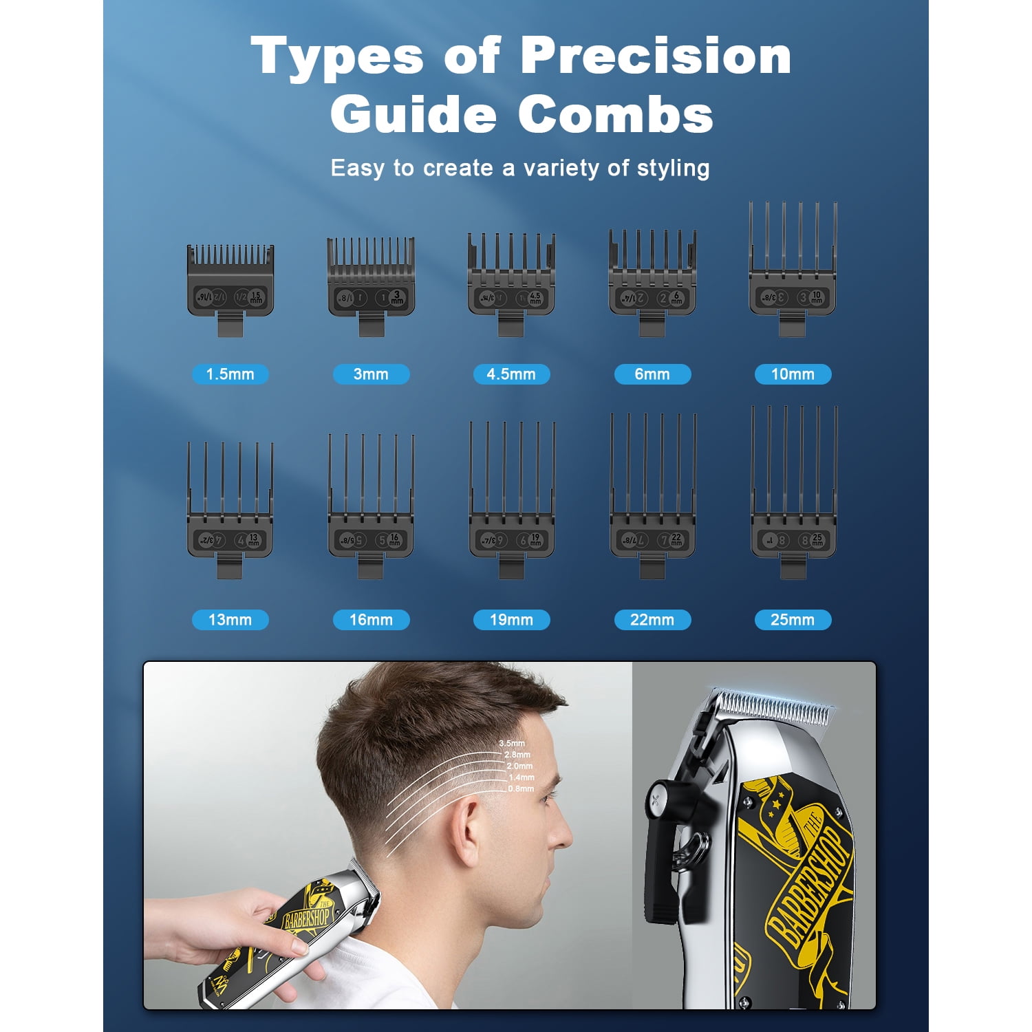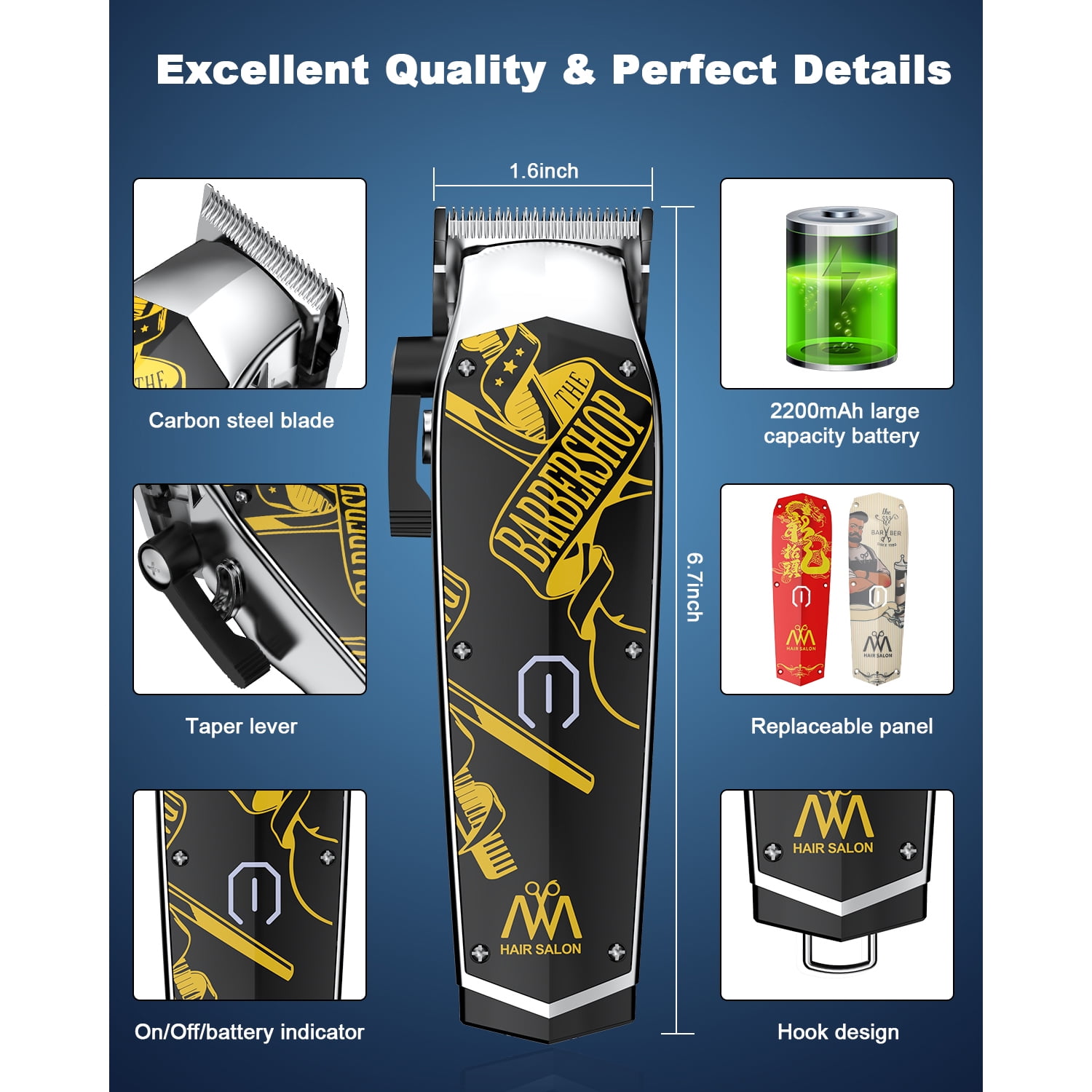 ✄【Professional Hair Clippers Kit Designed for Barbers】 This hair cutting kit is well suited for professional barbers or stylists as well as household use. Hair trimmer equipped with 10 guide combs (1.5/3/4.5/6/9/12/15/18/21/25mm) and 5th gear swing bar with adjustable blade length (0.8/1.4/2.0/2.8/3.5mm), 1 lubricating oil, 1 cleaning brush, 1 USB charging cable, and 1 charger adapter. Easily control the hair length and trim a variety of hairstyles. ✄【Sharp & Durable High Carbon Steel Blade】Barber clippers have an ultra-sharp high-carbon steel blade that is carefully polished through three processes and advanced automatic grinding technology, when working, the cutter head is automatically sharpened, and the more you use it, the sharper it will be, enabling easy and quick cuts without getting stuck hair. Keep the stable rapid cutting speed even to meet the thickest hair. ✄【3 Panel Styles】Hair clippers in addition to the panel of the host, also with extra two replaceable panels, you can choose your favorite panel style as you like, there is a cute barber style, a bright red style, and a simple and elegant black letter style, owning it is equal to owning 3 hair clippers! ✄【High Capacity Battery & Wireless Use 】The clippers for hair cutting built-in rechargeable 2200mAh high-quality battery, USB charged for 3 hours to provide up to 210 minutes of cordless use. It can meet the needs of a professional hair stylist for a day’s work. And the switch with a low-battery charging prompt–red light, not worry about a sudden loss of power during use. ✄【Powerful and Quiet Motor】This cordless professional hair clippers set is equipped with a strong motor, 7000 RPM high-speed motor drive blade for quick haircuts. The clipper is equipped with the latest noise reduction technology so that the noise of the haircut machine when running is less than 55 DB. Provide customers with a comfortable, quiet, and pleasant haircut experience ✄【One-Year Warranty & After-Sales Service】 These haircut machines for men or women come with a gift box design which makes it a perfect gift to be given to your loved/friends ones. We provide a worry-free 1-year warranty and 24hrs/7d friendly customer service for men’s hair clippers. If you have any questions, please contact us in time.