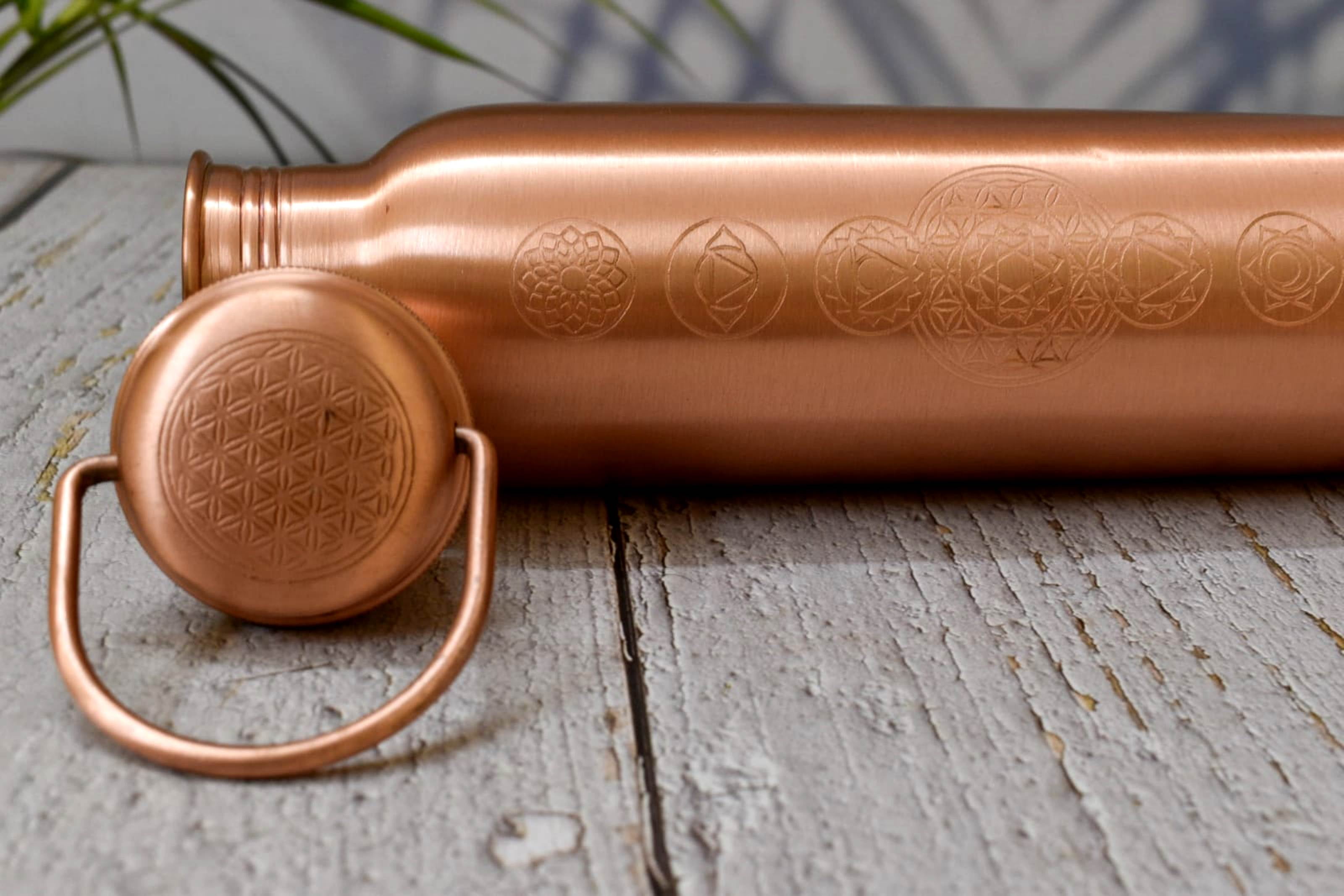 Pure copper and leak-proof – Our leak-proof pure copper bottle offers the benefits of both health benefits of copper as well as the comfort of a reliable, leak-proof container. HANDMADE COPPER BOTTLE WITH 1000ML CAPACITY – Our handmade copper bottle has a capacity of 1000ml making it a spacious and practical choice for transporting a large amount of water or your favorite drink. The handmade character of the bottle gives it a unique and artisan touch and shows the craftsmanship and attention to detail in its design. Whether for personal use or as a thoughtful gift, the combination of handmade quality and generous capacity makes our copper bottle a practical and stylish choice. Designed for an active lifestyle – A handle on your copper bottle is a practical addition that increases its comfort and suitability for an active lifestyle. The handle makes it easy to carry and can be useful when you are out and about, doing outdoor activities or travelling. It ensures a secure hold and makes it more convenient to hold the bottle while you are active. The handle provides additional functionality and ensures that you can easily take your copper bottle with you wherever you go Beautiful and breathtaking design – The engraving of the seven chakra symbols on a copper bottle adds a symbolic and visually appealing element that represents different energy centers in the body and the associated meanings. Care instructions: Clean and dry your copper bottle regularly, avoid harsh chemicals, store it in a dry place and remove black spots with lemon juice and salt or a special copper cleaning solution.