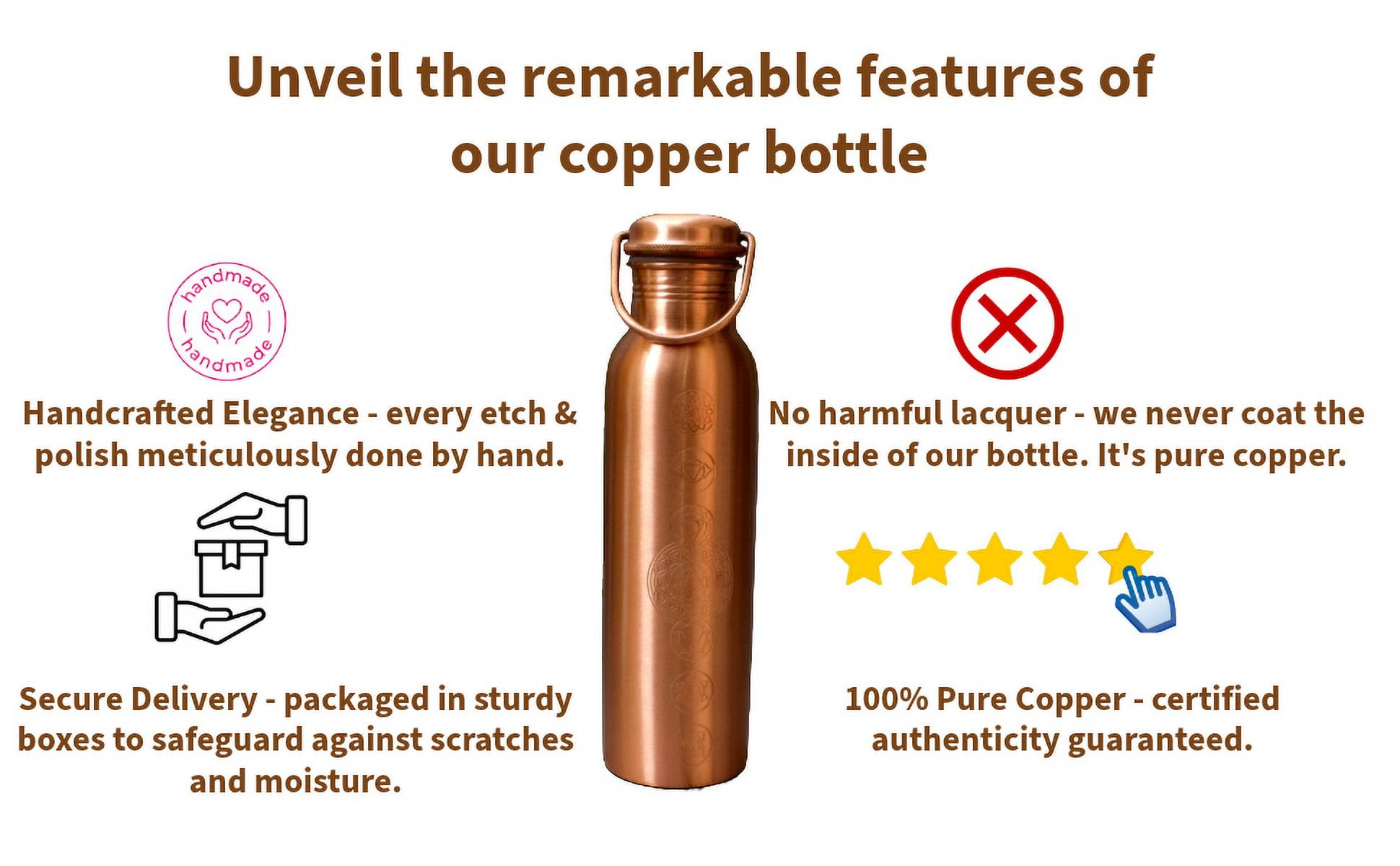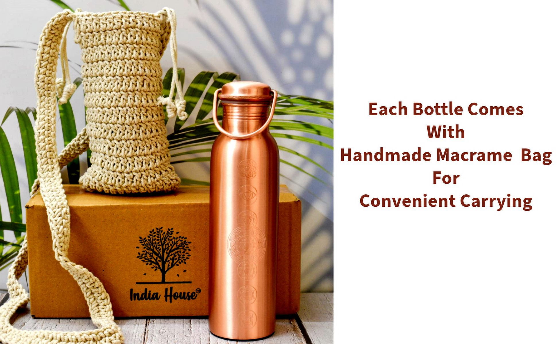 Introducing India House’s Pure Copper Water Bottles featuring engraved chakra symbols and a seamless leak-proof design. Experience the incredible purity of water with our amazing copper water bottle. Embrace the ancient practice of copper drinking to revitalize your body. Whether you’re at the office, school, gym, or on a camping adventure, our copper bottle ensures your water stays fresh and maintains its original taste, while also being at the perfect temperature for your enjoyment. Support a healthy lifestyle by drinking from your copper bottle throughout the day. Say no to plastic bottles that harm your health and the planet, and choose the benefits of copper for yourself and the environment. Our bottle showcases remarkable design after months of careful comparison and refinement. It passed stress tests to ensure its superior quality. The smaller lid prevents side leakage while drinking, yet it’s still large enough for easy cleaning. With a longer neck and more threads, our bottle guarantees leakage safety, while an O-ring provides additional protection against leaks. Handmade with exquisite craftsmanship, our bottle features a tarnish-resistant surface and is constructed from pure copper, known for its health benefit properties. With a large capacity of 1000ml, it provides ample hydration throughout the day. Experience the perfect Ayurvedic copper bottle and enjoy the benefits it brings to your well-being. Choose India House for a seamless, leak-proof, and chakra-engraved copper water bottle that combines style, functionality, and health benefits.