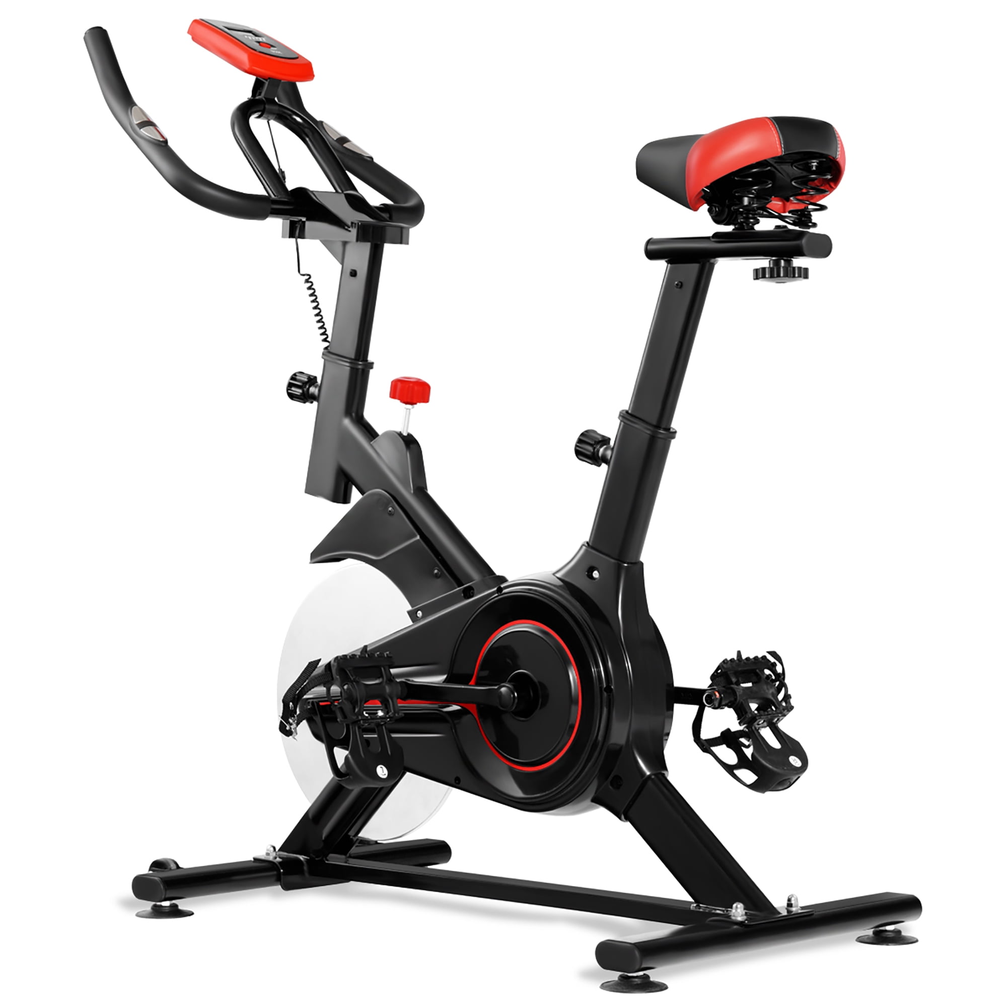Heavy duty flywheel with the belt drive mechanism: 13 lbs heavy duty flywheel combined with the belt drive mechanism allows for smooth and quiet workouts, ensuring stability to avoid jolting while riding. Adjustable resistance system with push-down brake: There is a convenient adjustable knob, with a simple twist, you can increase or decrease the resistance so your workout can remain challenging and effective throughout your fitness journey, and with a pushdown, the emergency brake stops the wheel immediately for safety. Intelligent big data perfectly shows the fitness effect: This equipment can achieve intelligent data management, it can monitor the time, speed, distance, calories, pulse and scan. Through data analysis to generate training reports, you can adjust your situation accordingly. 4-way adjustable seat and height adjustable handlebar: 4-way adjustable soft padded seat, that can easily move forward/back and up/down. The handlebar is adjustable, and it allows you to adjust it up and down in height to fulfil different people’s demands. User-friendly, sturdy and safe: This exercise bike consists of reliable, solid parts, made of strong, high-quality materials that can withstand high-intensity use. Anti-slip design and toe straps provide for prolonged safe riding. It features a soft saddle for more comfortable riding. Feature Black body, manual locking pedal, soft saddle 13 lbs electroplated iron flywheel with a belt drive system for smooth riding Adjustable resistance system to increase or decrease the resistance Emergency push-down brake stops the wheel immediately for safety Anti-slip design and toe straps provide for prolonged safe riding Quiet belt system won’t wake the families down the hall while you exercise 4-way adjustable soft padded seat, with height 6 levels adjustable, and forward-and-backwards range 3” adjustable The adjustable handlebar allows you to adjust it up and down in height Plastic mobile phone holder for entertainment With a counter for time, speed, distance, calories, pulse and scan Specification Material: Steel, Plastic Colour: Black Product Dimensions: 40” (L) × 19″ (W) × 43.5″ (H) Seat Height: 29.5″- 35.5” (6 levels adjustable) Seat forward-and-backwards range 3” Handlebar Height: 40″- 43.5″ (4 levels adjustable) Flywheel Weights: 13 lbs Item Weight: 48 lbs Weight limit: 220 lbs Package Include: 1×Exercise bike(Need 2x AA battery, not included), 1 × Manual.