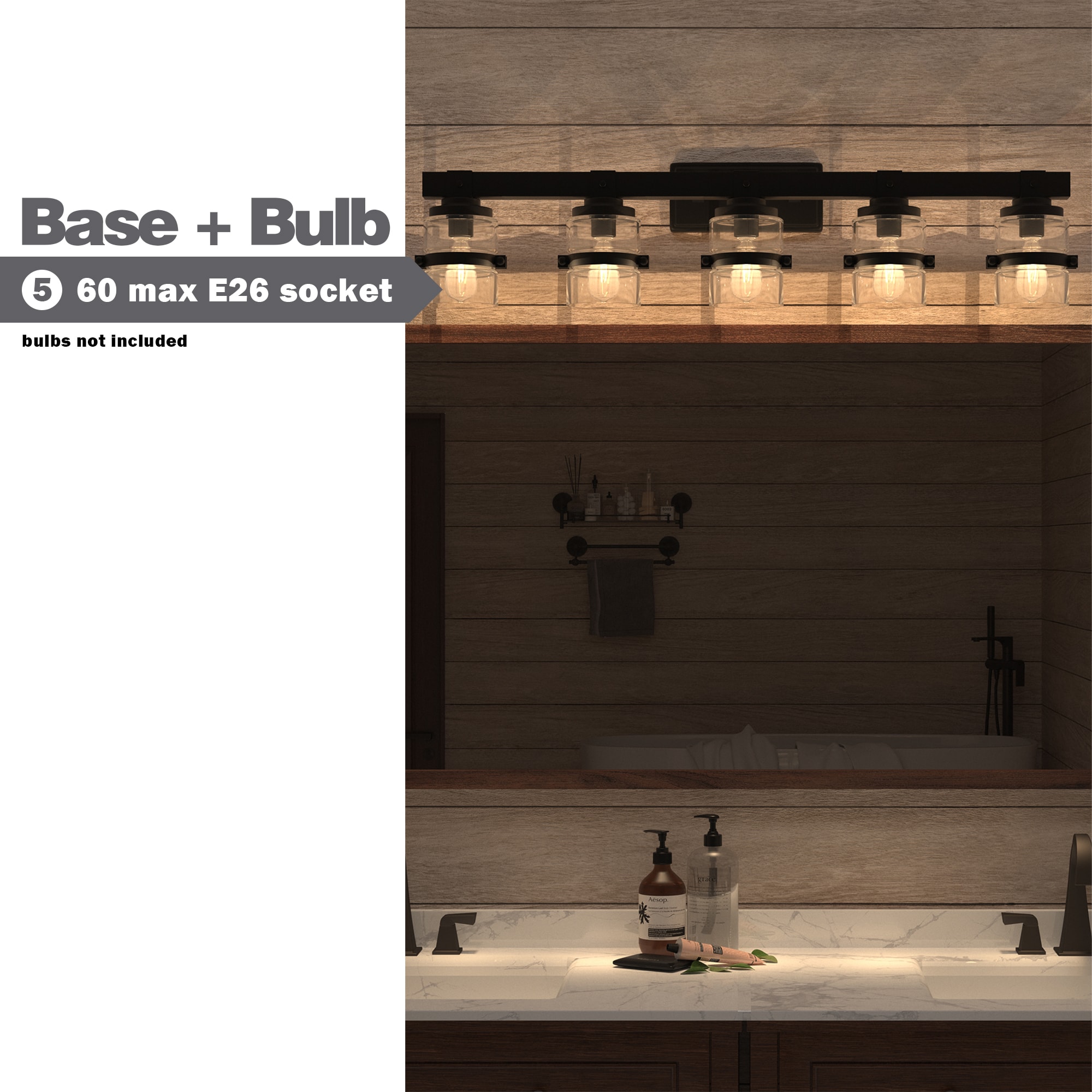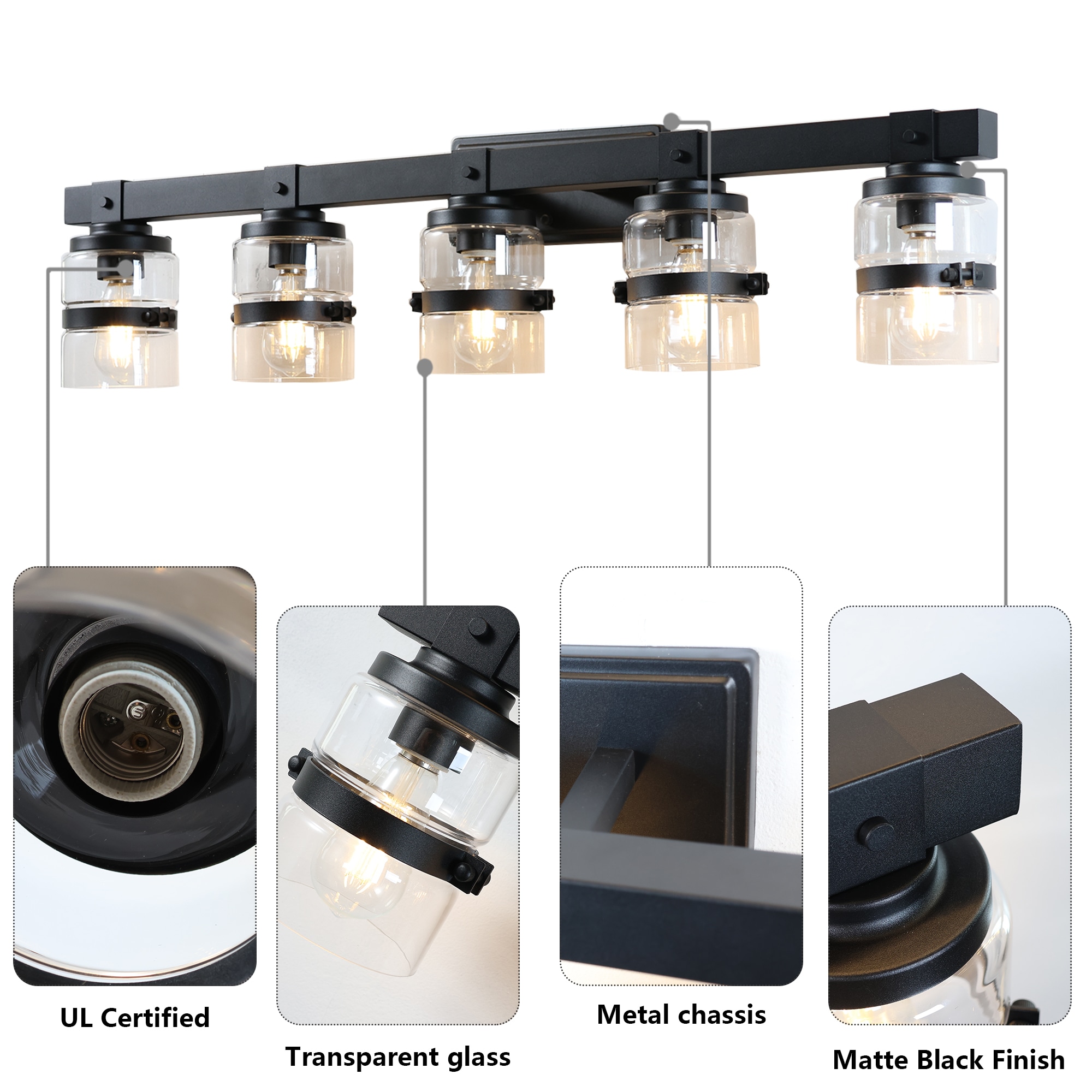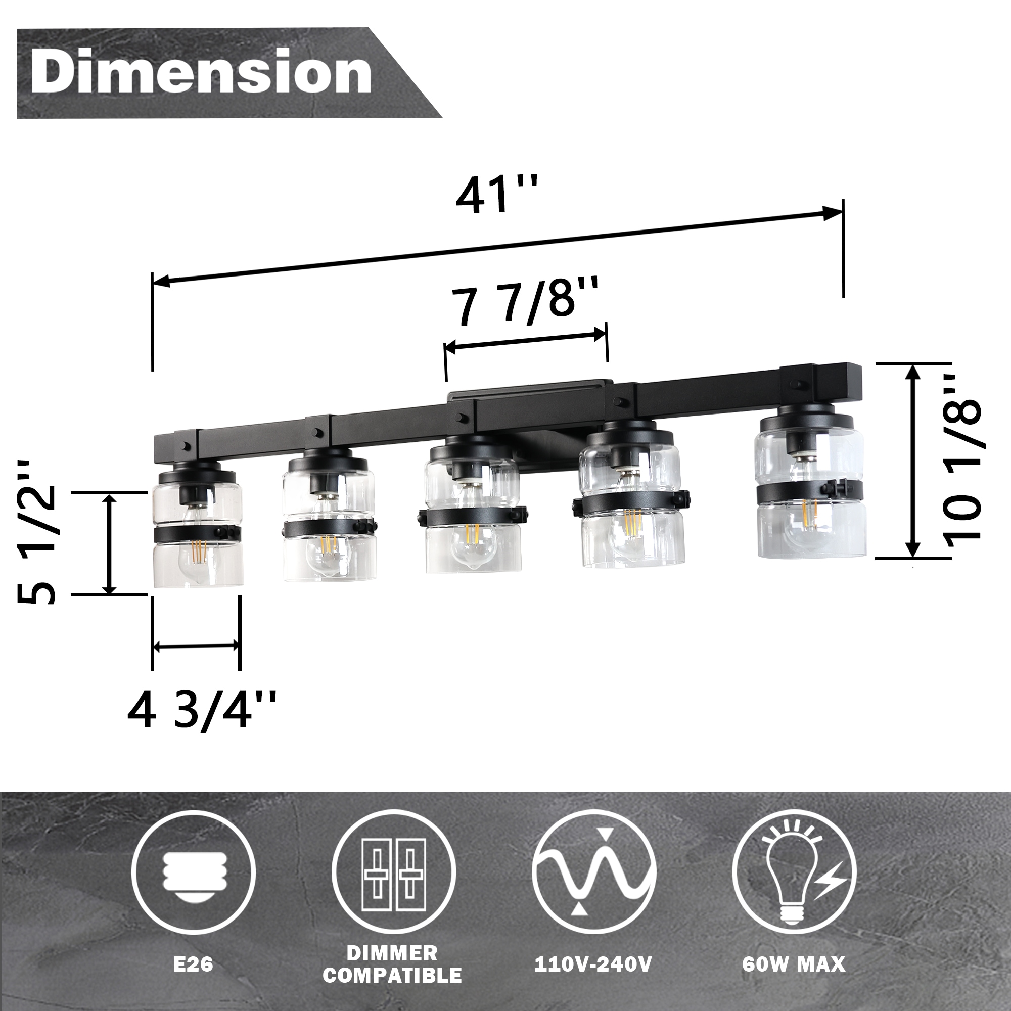 Elevate your home lighting with the sophisticated ExBrite 5-Light Bathroom Vanity Light. Featuring a matte black finish lamp body and clear glass shades, it adds a touch of brilliance to any space. Suitable for various decoration styles, this exquisite vanity light can be mounted facing upward or downward to suit your needs. Durable and versatile, it can be placed in hallways, bedrooms, bathrooms, living rooms, and more. Installation is simple and convenient with all mounting hardware included. Bulb not included. Our aim is to fulfill your needs with quality products and service. Contact us for any inquiries.