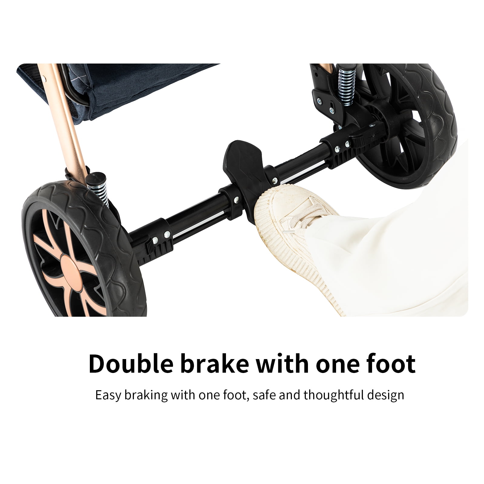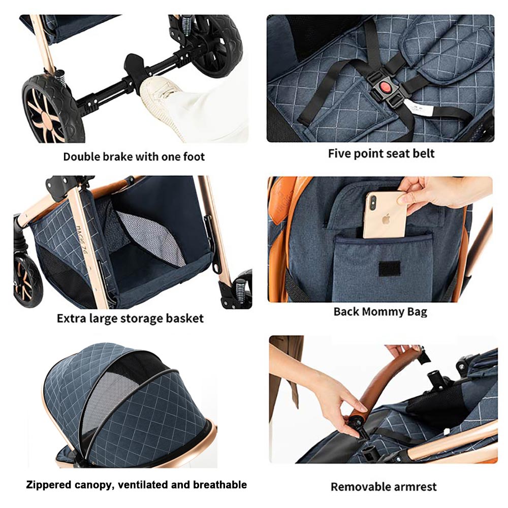 【2-in-1 Versatile Baby Stroller 】With effortless adjustments, the stroller can be easily remodeled and can play multifunctional functions, which can fully meet the different needs of the baby. 【Excellent Durable Thickened Aluminum Alloy Frame And Independent Shock Absorption Frame】The stroller has excellent shock absorption, the frame uses an excellent durable thickened aluminum alloy with an independent shock absorption frame. 【Good-Quality Cotton Fabric】The stroller is made of high-quality cotton fabric, which is fashionable, water-absorbent, stain-resistant, and UV-resistant. 【High-View Design Foldable Design】With the high-view design, the stroller can fully expand your baby’s horizons and give you the freedom to enjoy the view. With a folding design, the stroller can be easily folded. 【Dual Push Modes And Adjustable Multi-Angle Shed Ddesign】 The stroller has two push modes and an adjustable multi-angle shed design. The stroller can be adjusted to move back and forth, giving the baby a great view of the world and you can check it out at any time. Six Gifts: Mummy bag, mattress, mosquito net, summer mat, Rain cover, foot cover