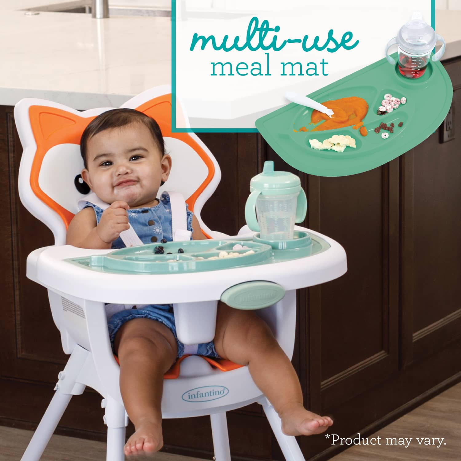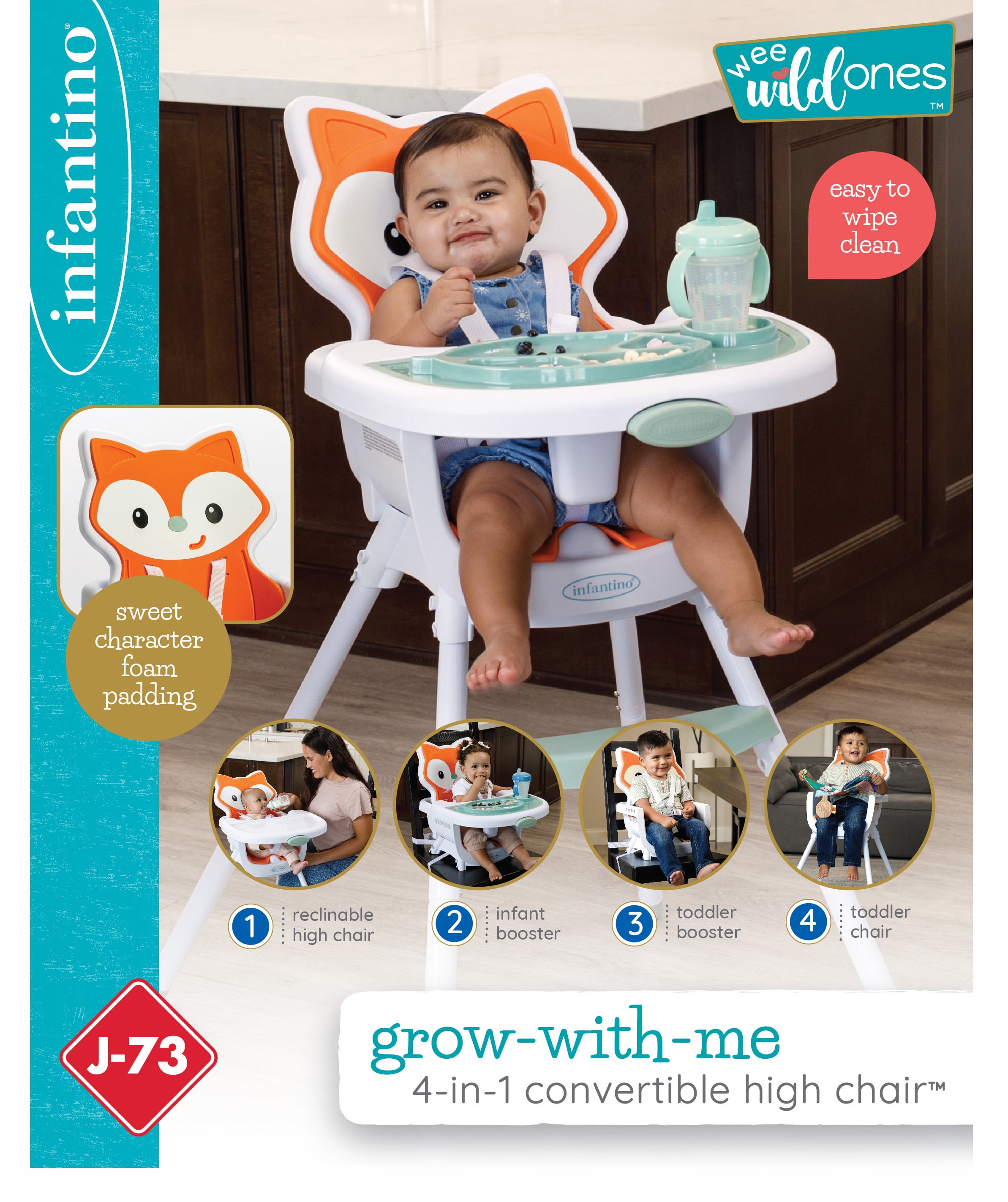 4-in-1 high chair, space saver, booster & toddler chair Dishwasher safe multi-use meal mat Soft, wipeable cushioning Reclines for infant feeding Easy release food tray Rolling front wheels for easy re-positioning Age grade 6m-36m (up to 33 lb) At Infantino, we believe every baby deserves access to quality products, this is why we design our products to be unisex so all little ones can enjoy them