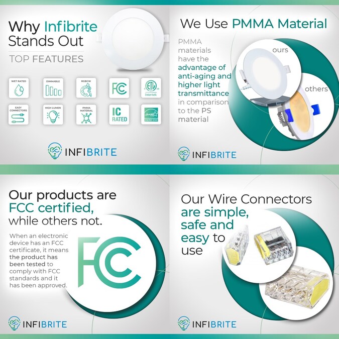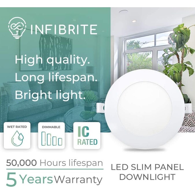 The Infibrite Ultra Slim Recessed Lighting Kits are the recessed lights you are looking for. Whether moving into a new space, remodeling or simply updating lights, proper lighting plays a huge role in elevating the appearance of your room. At Infibrite, we make choosing the perfect light easy with our LED lights, each fixture is designed specifically for tight spaces where height clearance is limited such as below beams or ductwork. Our lights are available in 2700K (Soft White), 3000K (Warm White), 4000K (Cool White), 5000K (Daylight White) and 6000K (Clear White), find the perfect color to match any room. 2700 or 3000 Kelvin is perfect for a relaxing soft color, 3500 or 4000 Kelvin is the ideal choice for everyday tasks and 5000 Kelvin is great for a hallway, work area or to simply keep a room brightly lit. ENERGY STAR certified and IC rated for direct contact with insulation, these lights won’t overheat, have a compact junction box and will last for-years to come, 50000-hours or approximately 34-years if used for 4-hours per day to be exact. Wet rated and certified airtight, Our lights are perfect for your bathroom, drop ceilings, outdoor soffits and all general lighting applications.